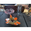 An art glass centre piece, an art glass vase and an art pottery centre piece