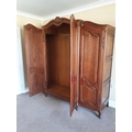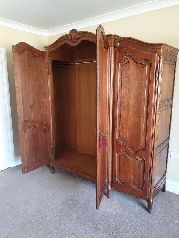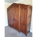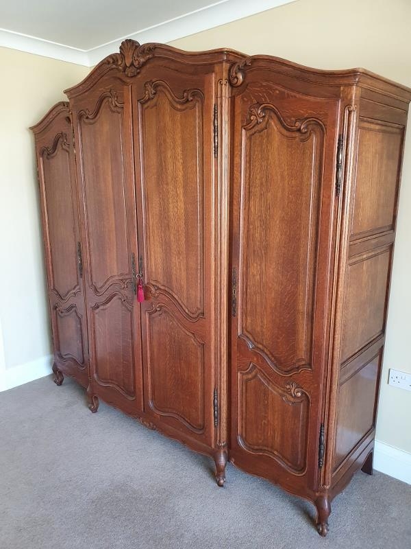 A very large 19th century style French oak armoire with shell and acanthus carved cornice, the four doors with fielded panels opening onto hanging rails and shelved, on scrolled feet.