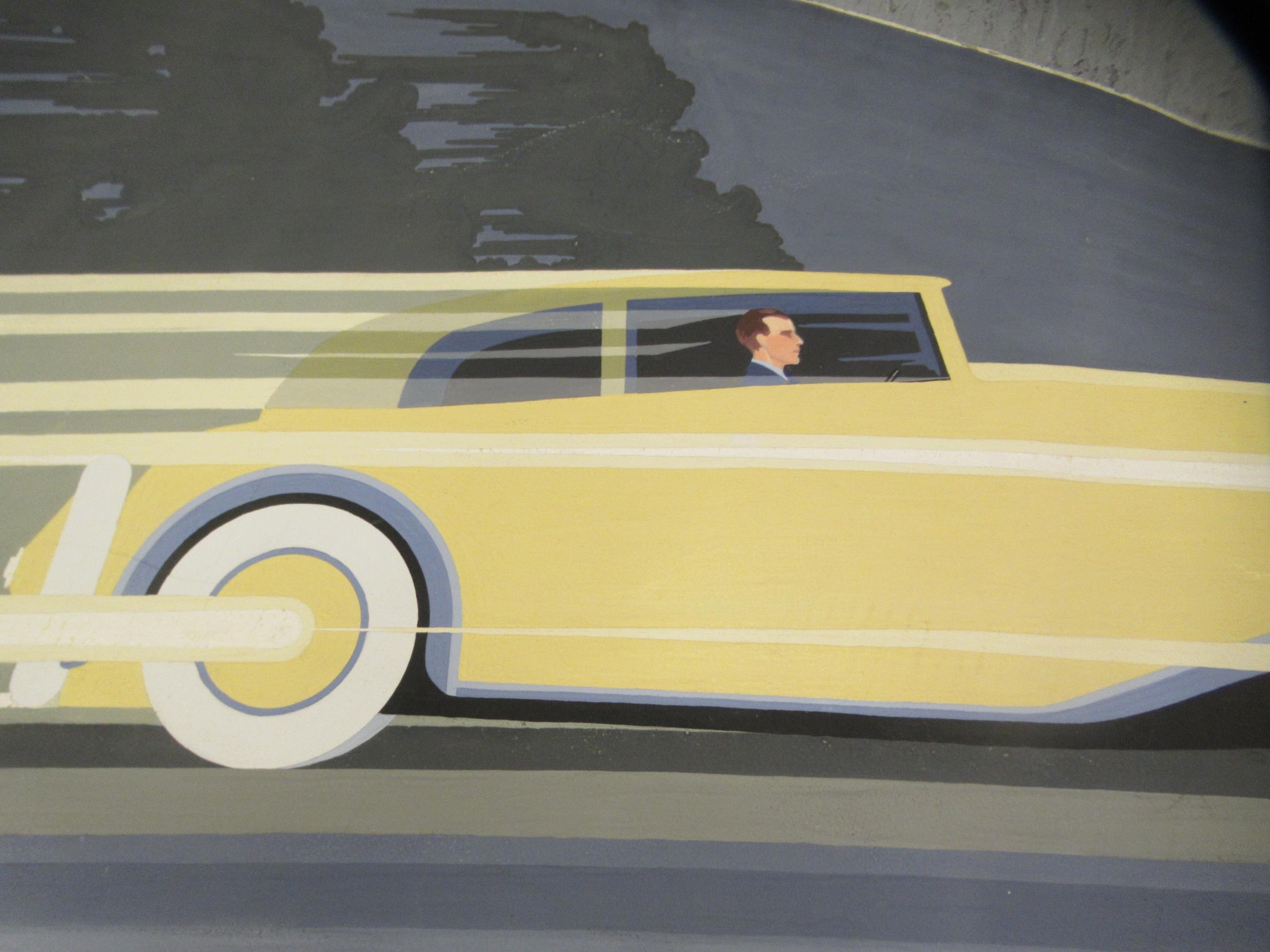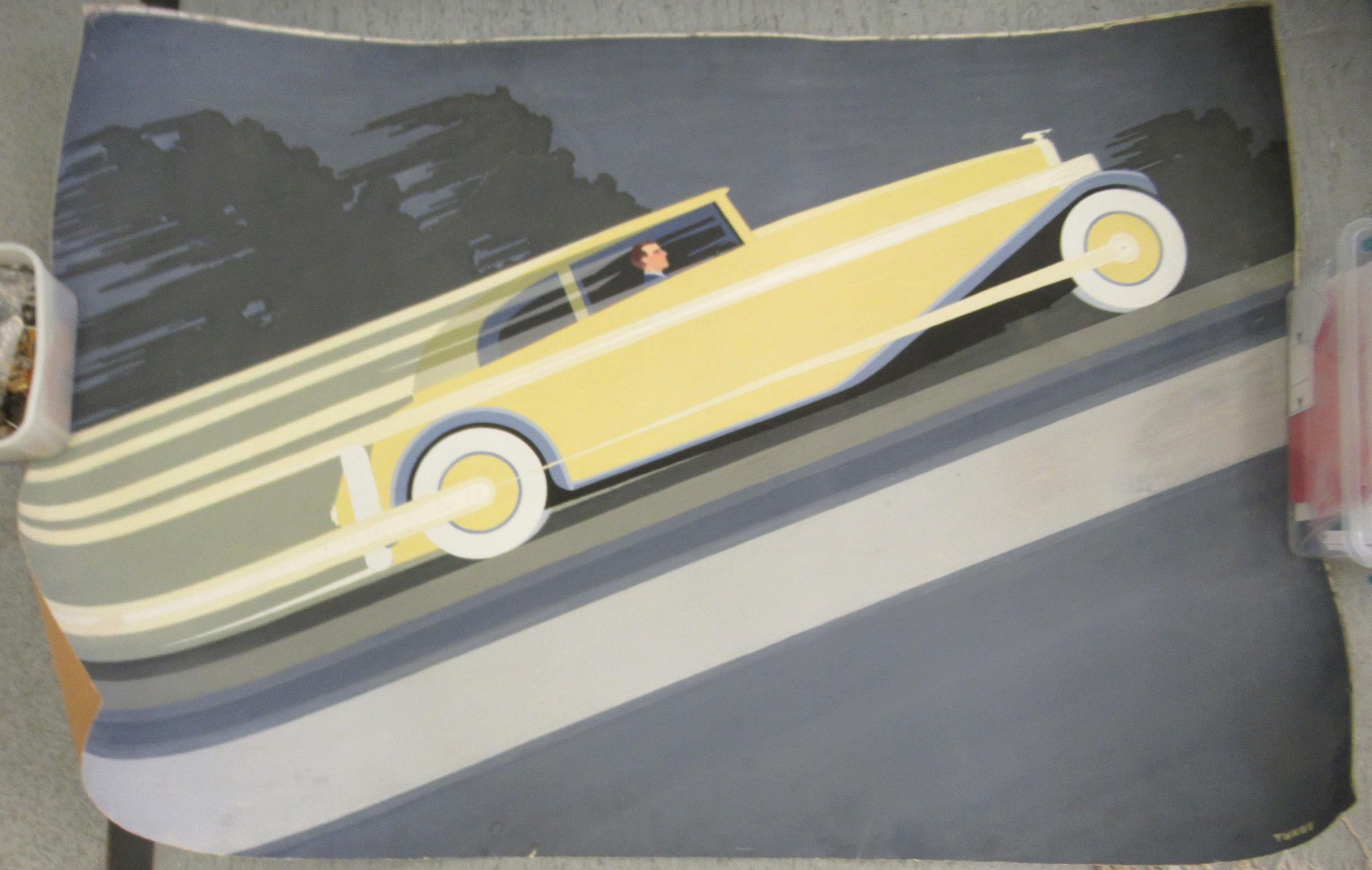 A study of a 1930s Shell Oil advertising sign, a motorcar watercolour bears a signature 'Yunge' 30" x 44"