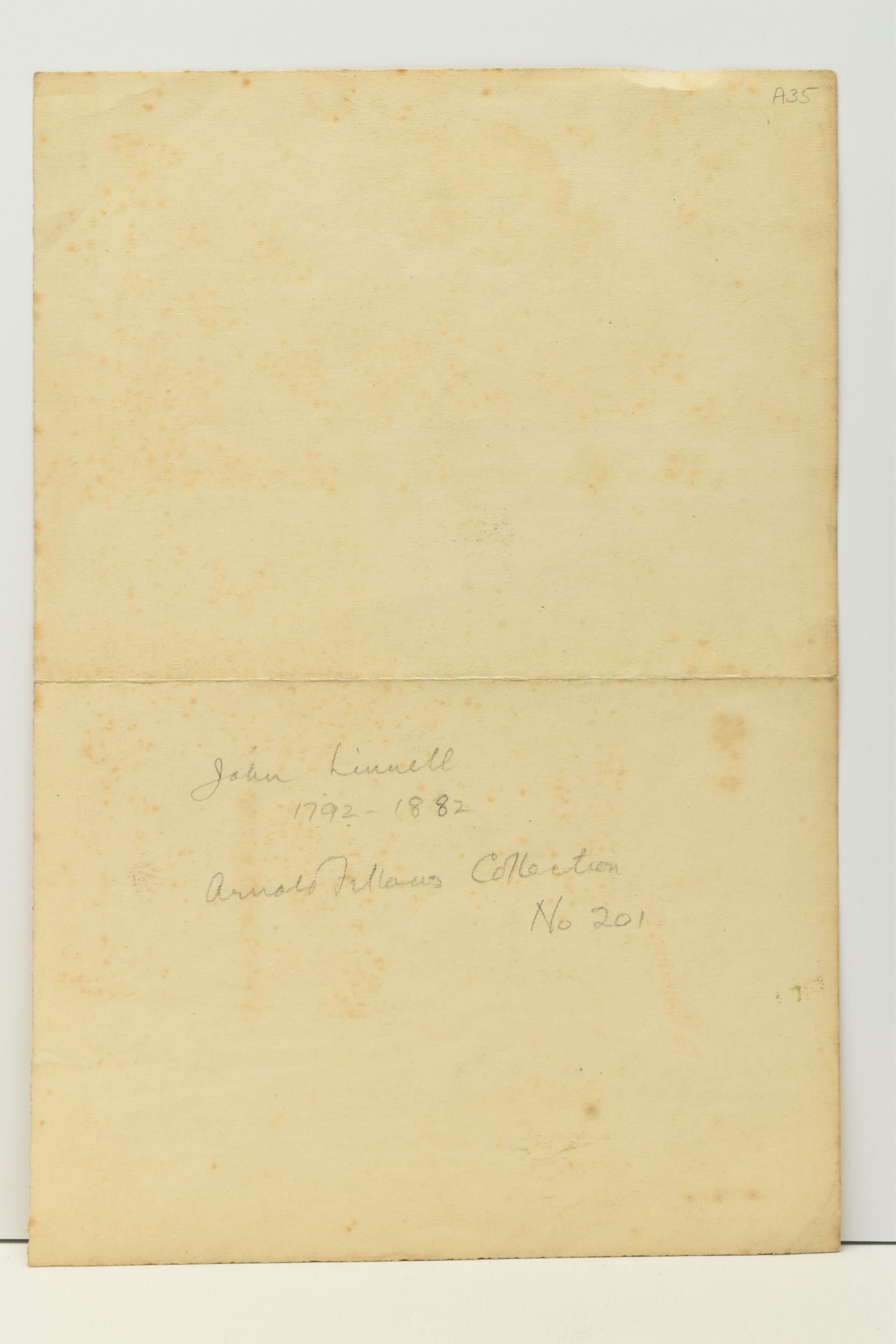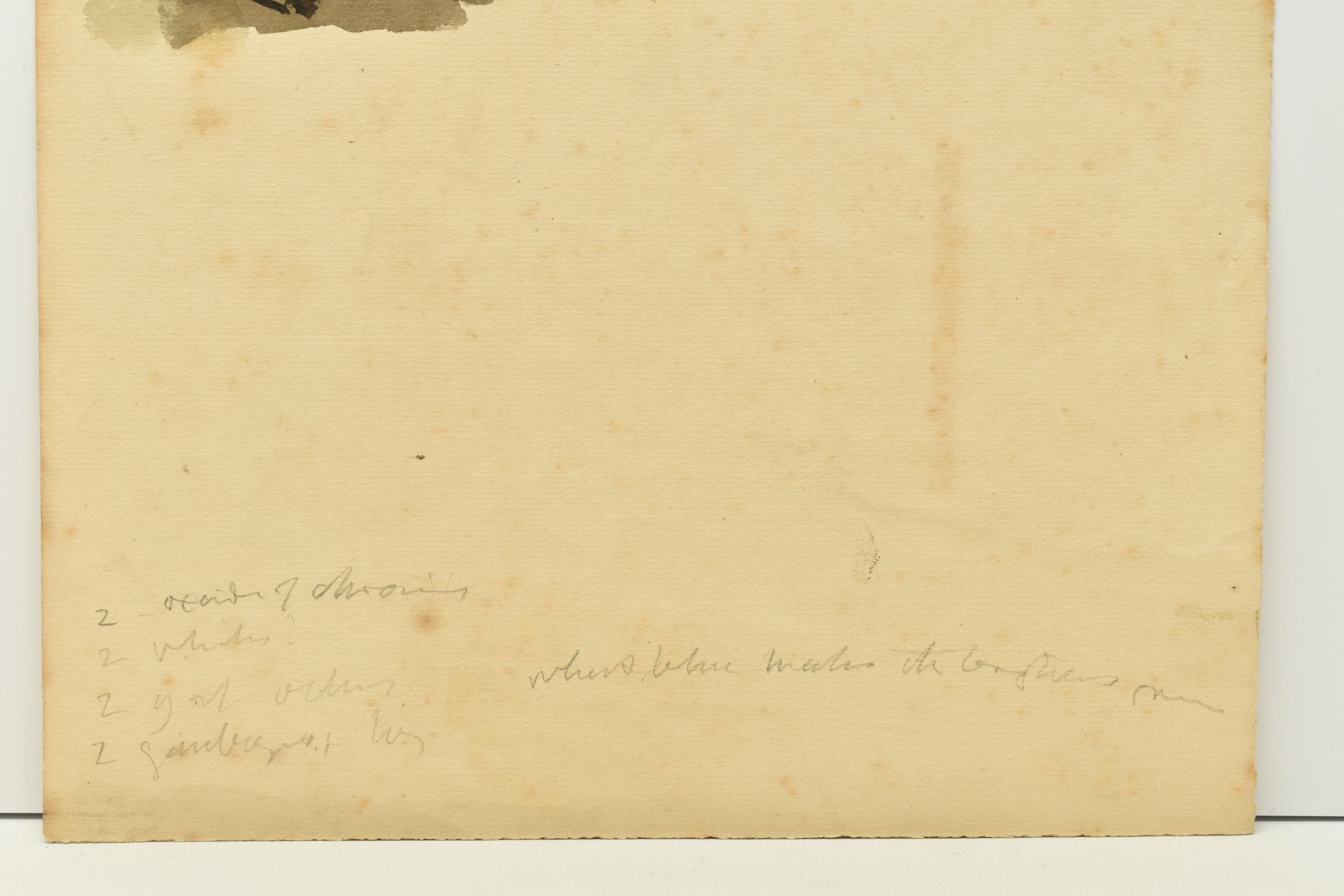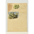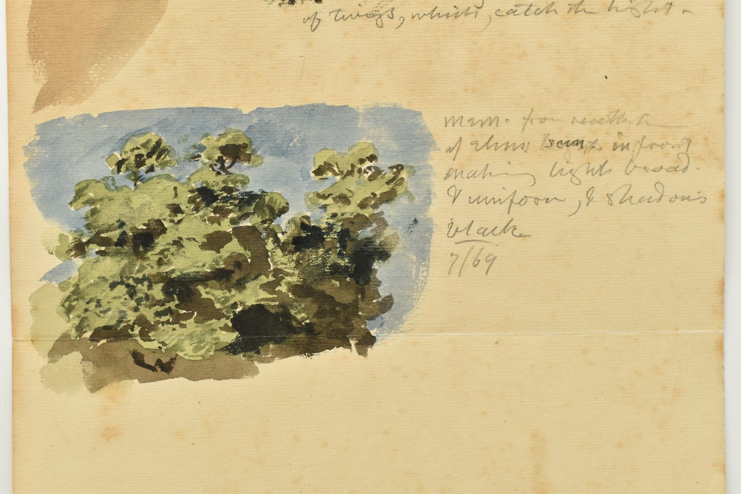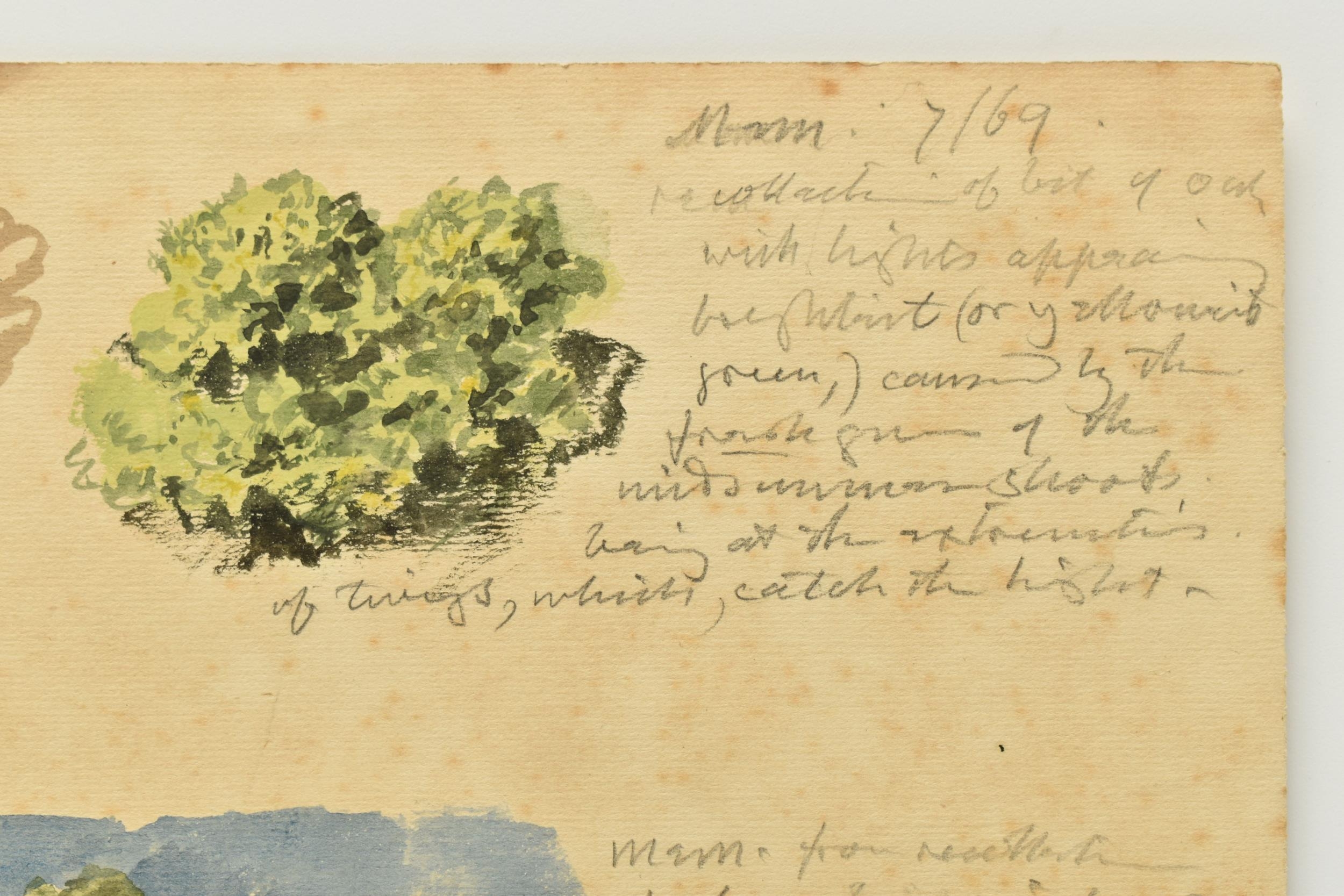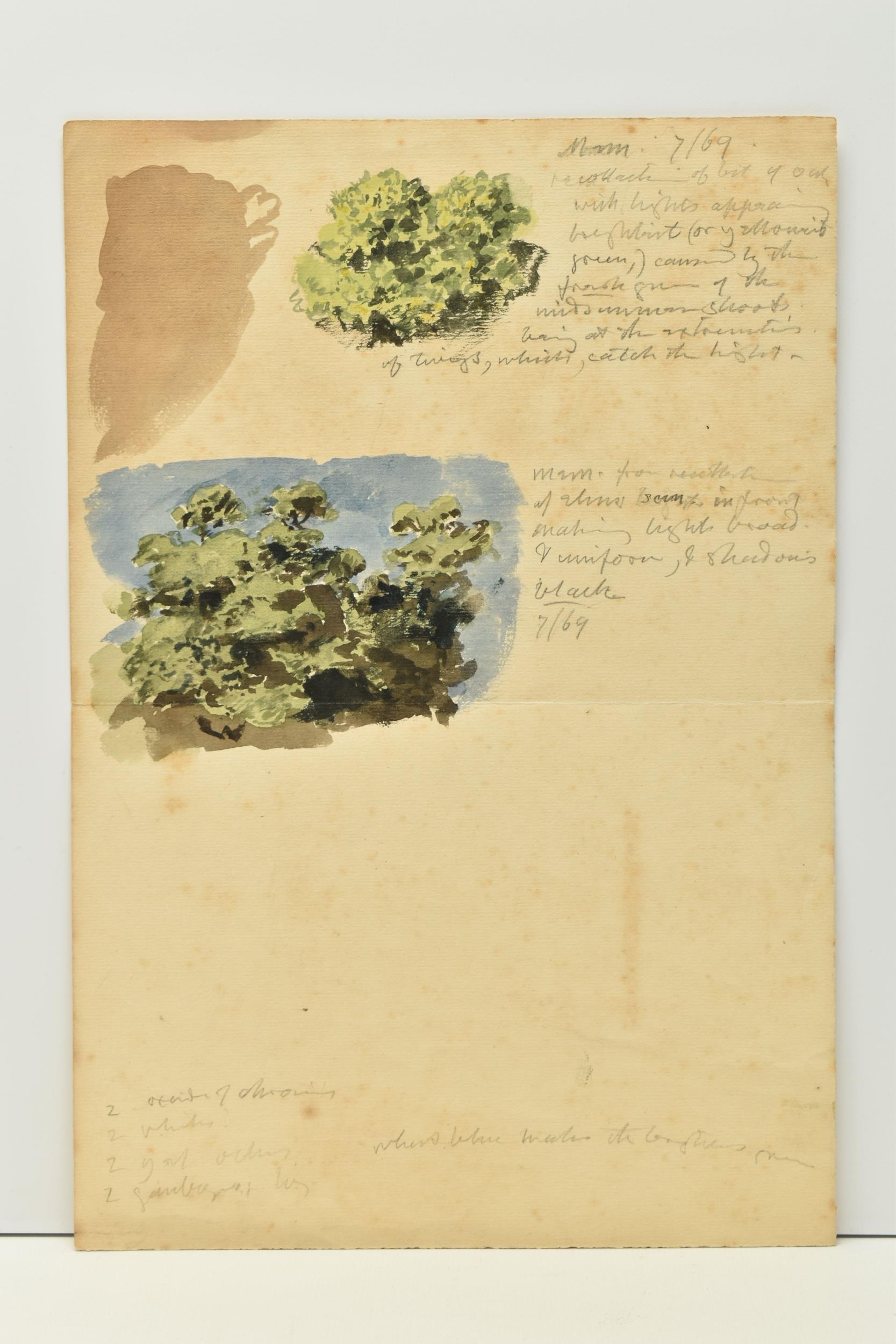CIRCLE OF JOHN LINNELL AN UNSIGNED STUDY OF FOLIAGE WITH NOTES, two watercolour studies on the same page with notes relating to them, dated 7/69, approximate size 29cm x 19cm, Condition Report: foxing and dirty marks to the paper, horizontal fold (a descendant of John Linnell has indicated that this may be the work of John Linnell JR 1821-1906)