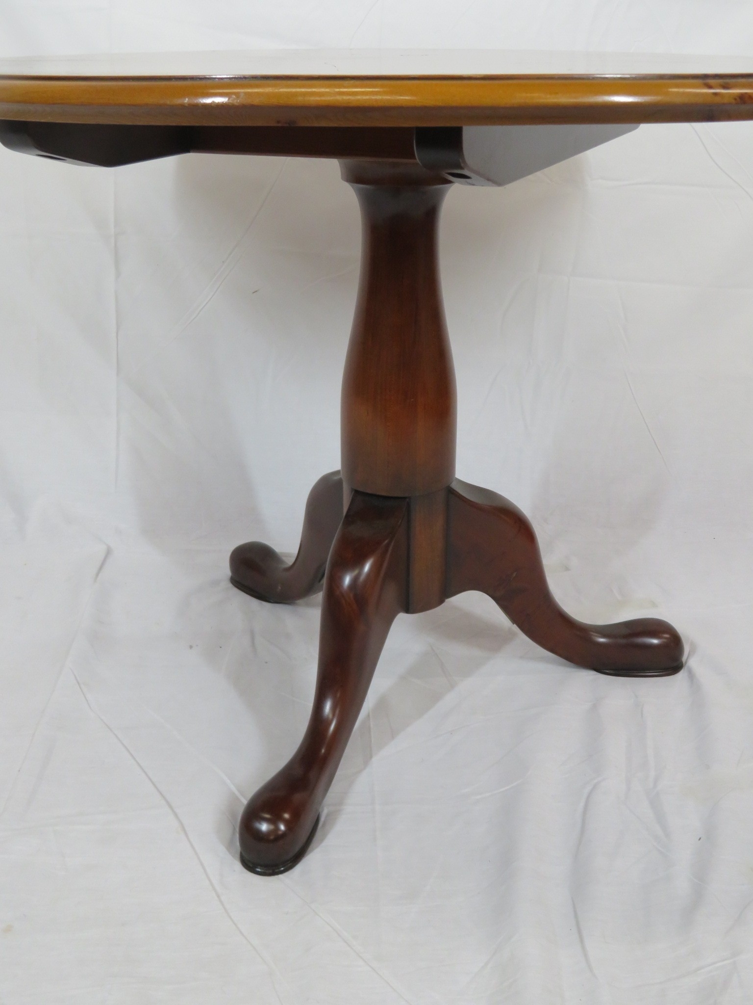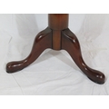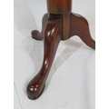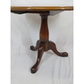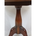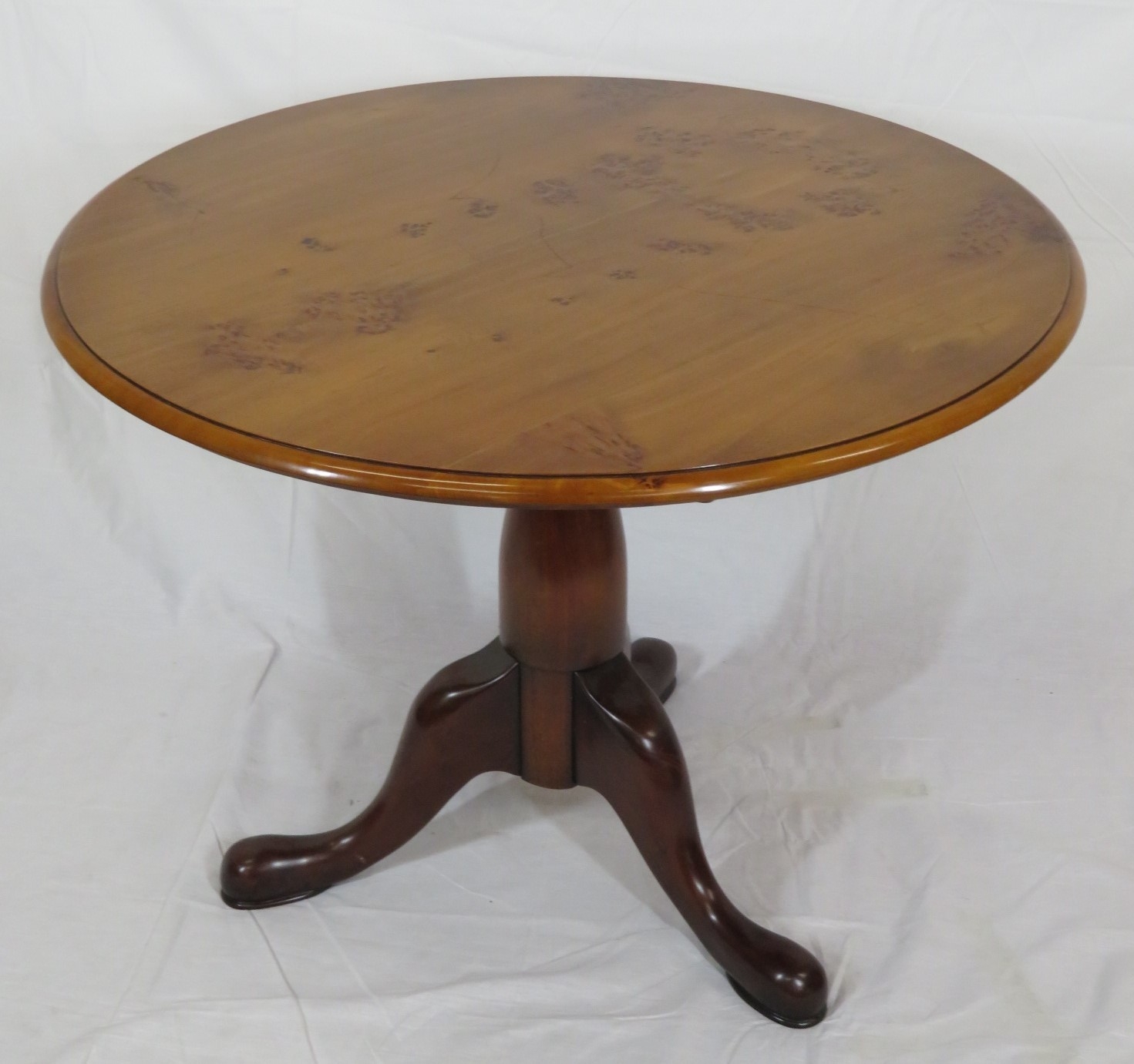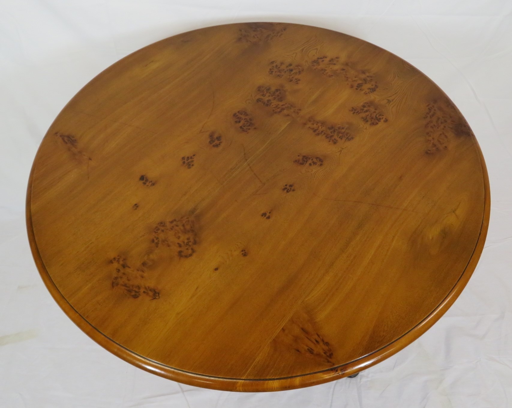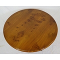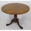 Victorian burr elm topped round occasional table with shaped mahogany column on yew tripod with pad feet