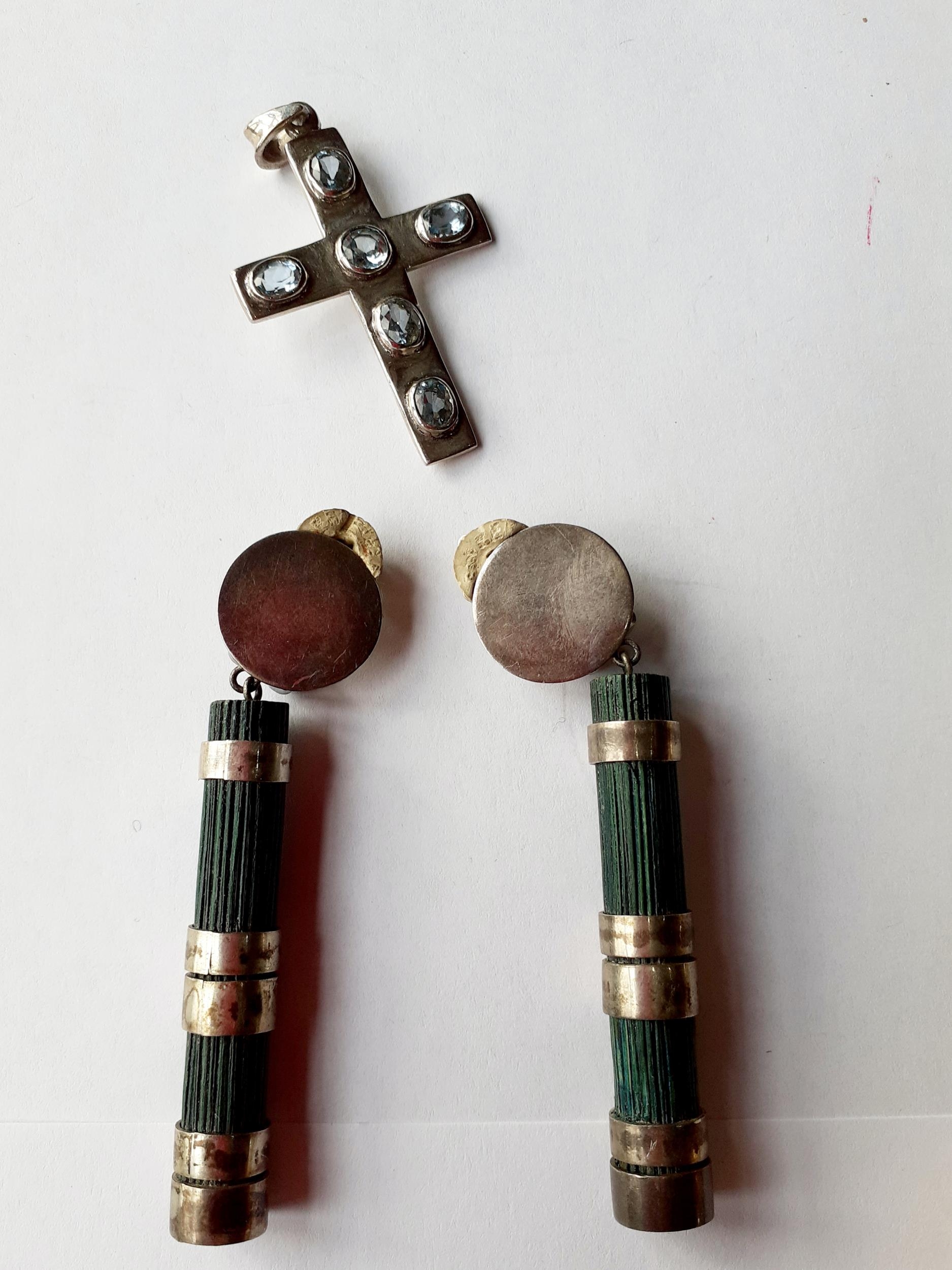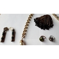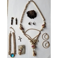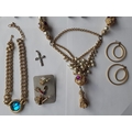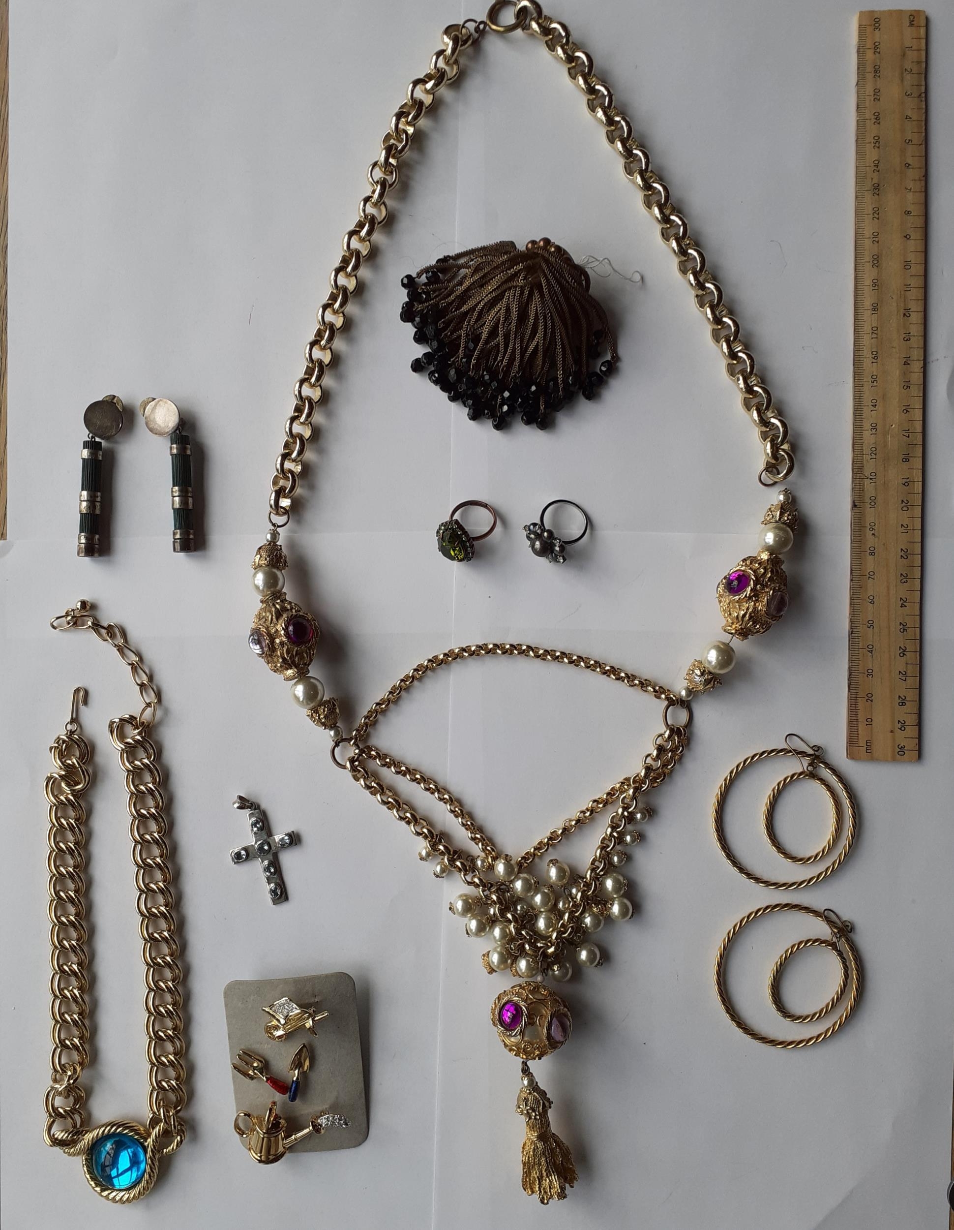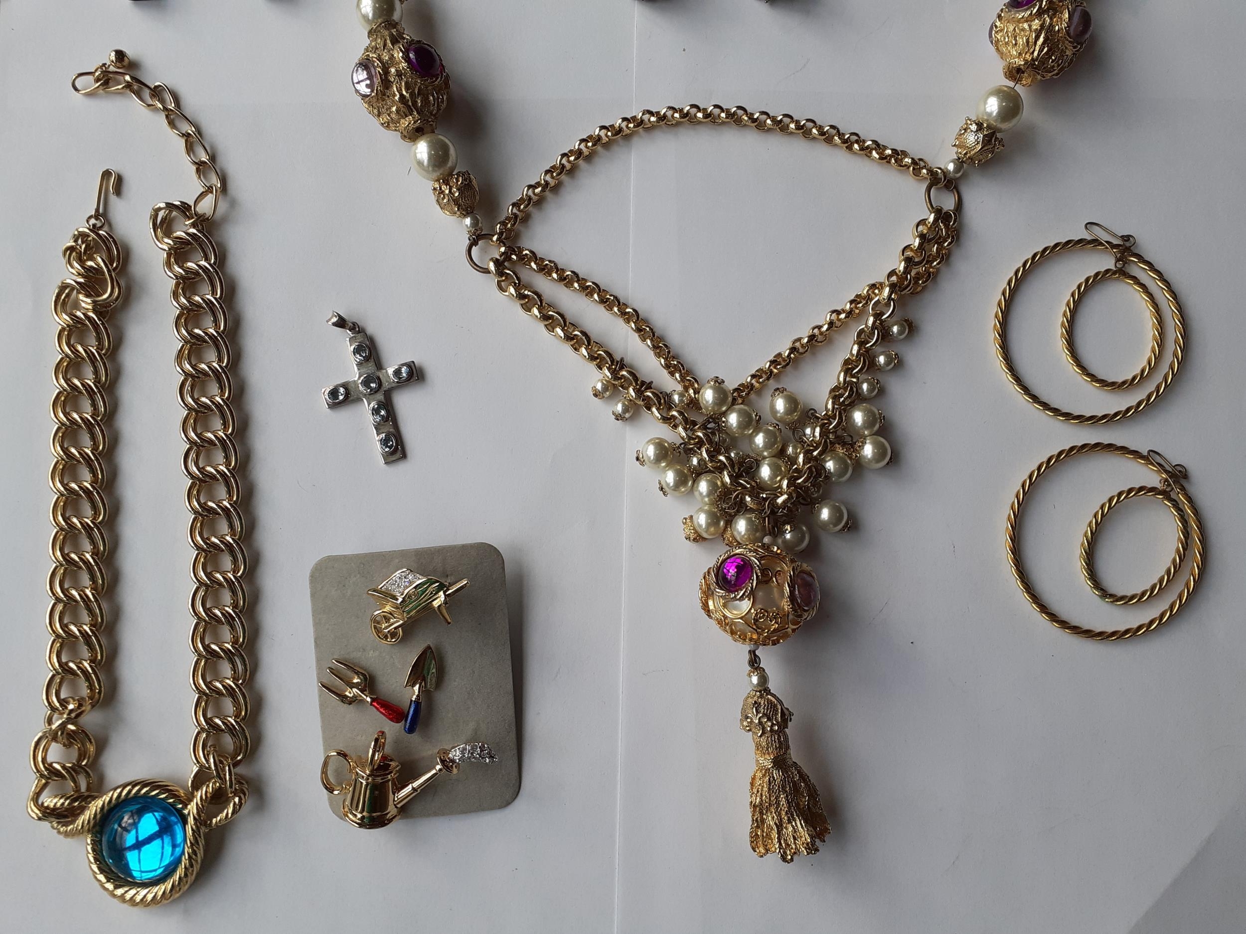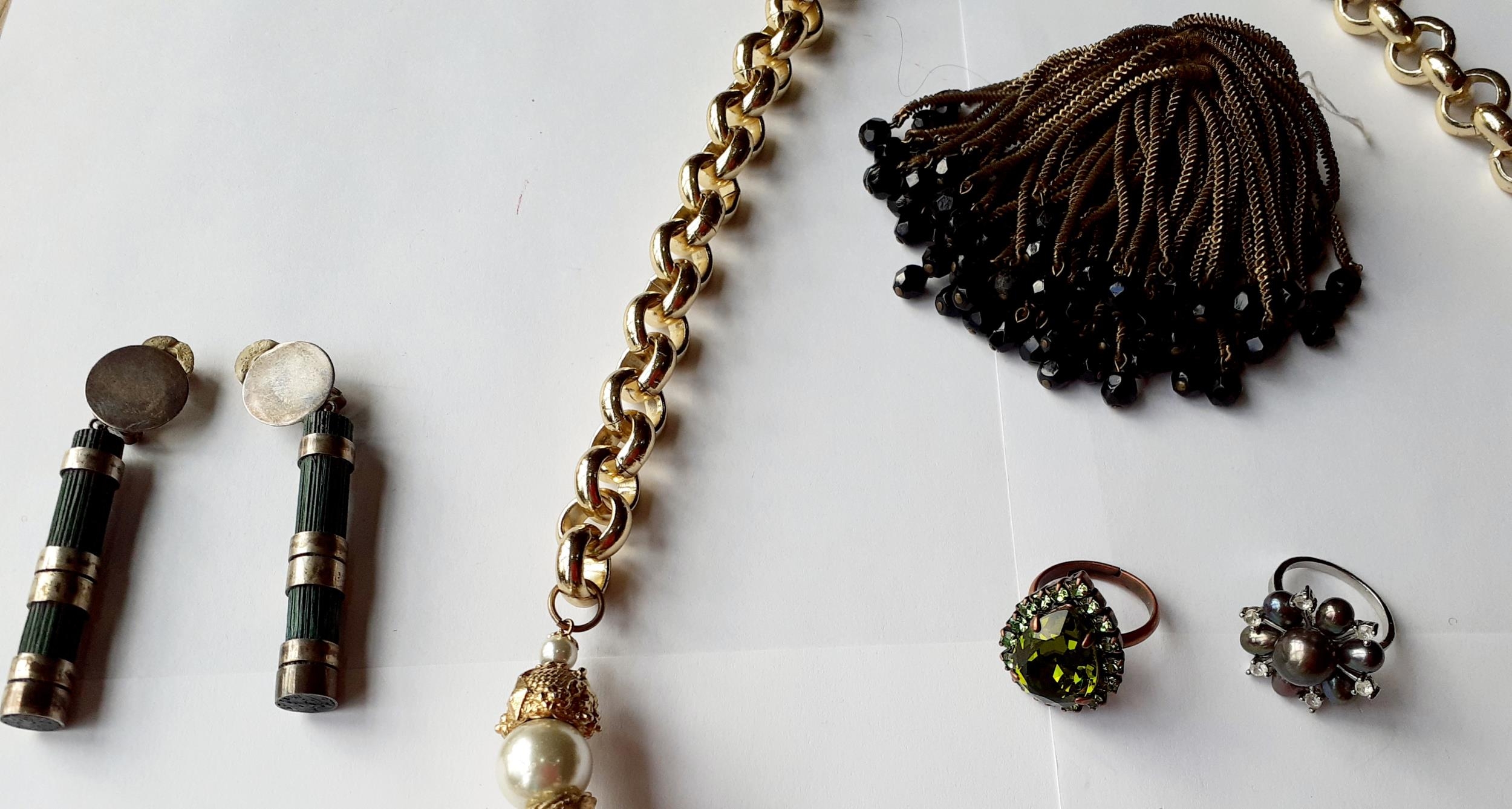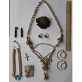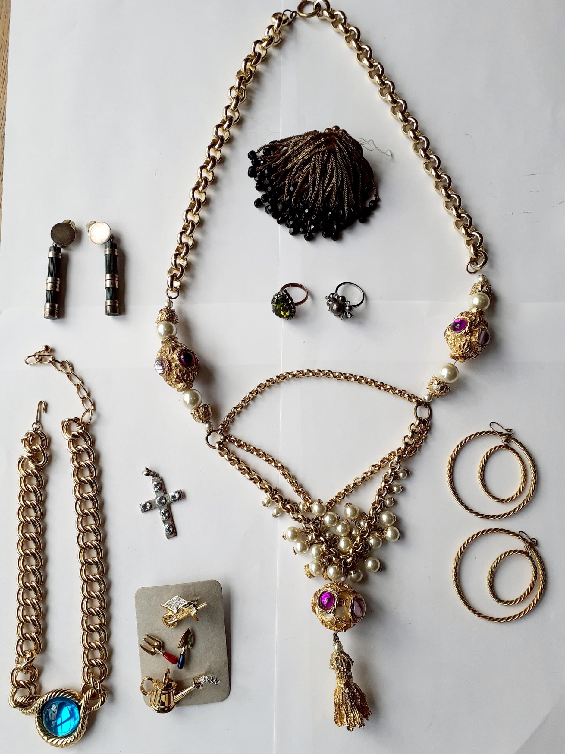 A late 20th Century Trifari gold tone open link chunky necklace with turquoise cabochon pendant and other gold tone and silver tone costume jewellery items to include 2 rings and earrings.