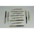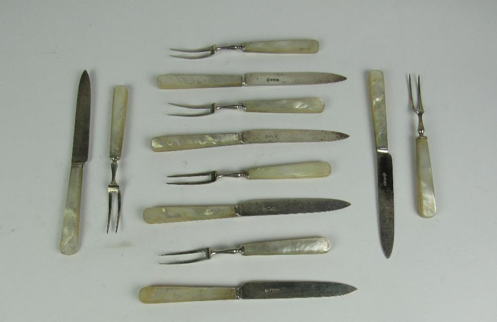 A set of 6 silver Fruit Knives and 6 matching two-prong Forks, Sheffield c. 1905, by Martin Hall & Co., each with mother-o-pearl handles. (12)