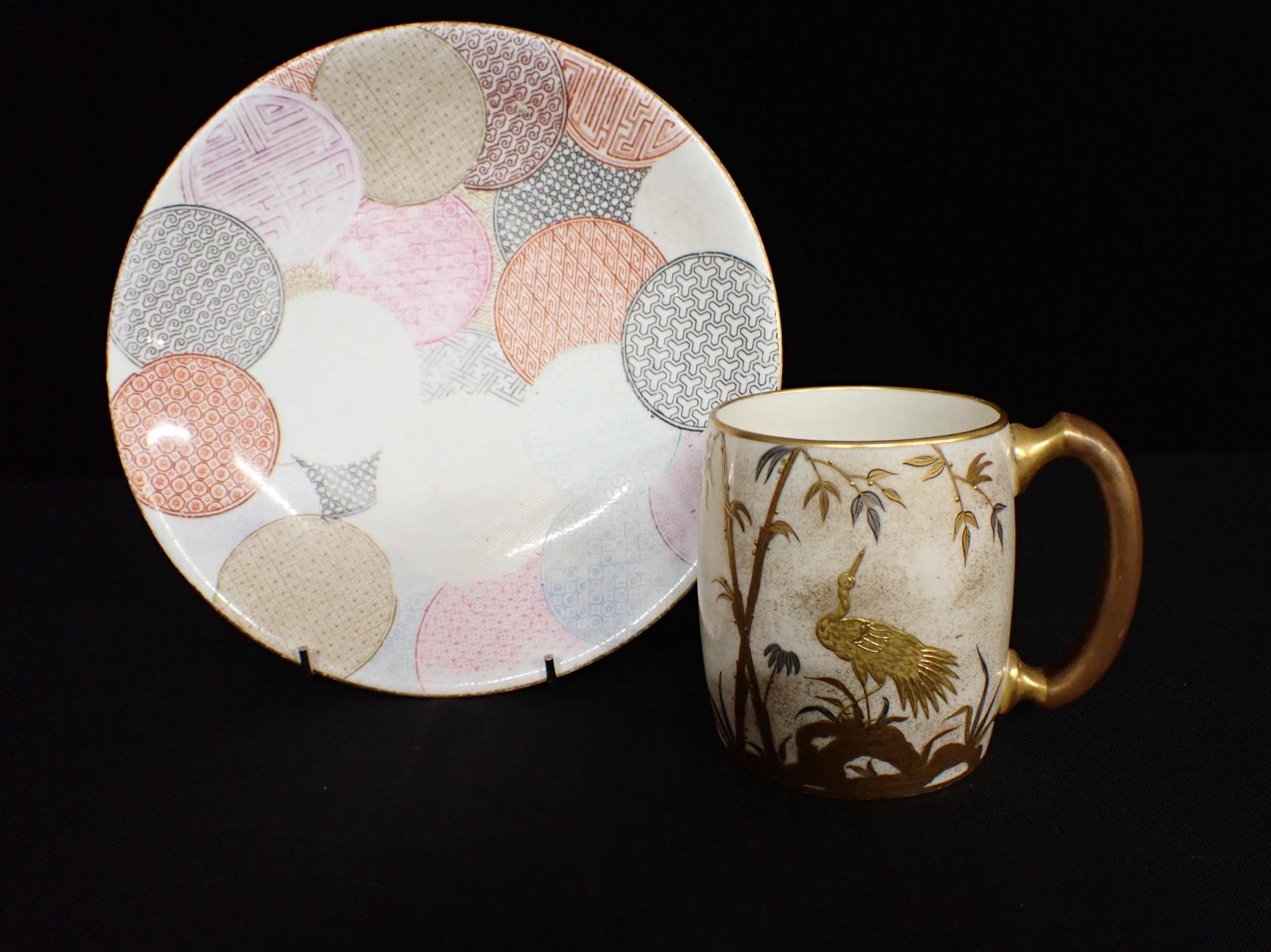 ROYAL WORCESTER TANKARD IN THE STYLE OF JAPANESE LACQUERivory ground, 10cm high, with a Royal Worcester Japanism style plate
