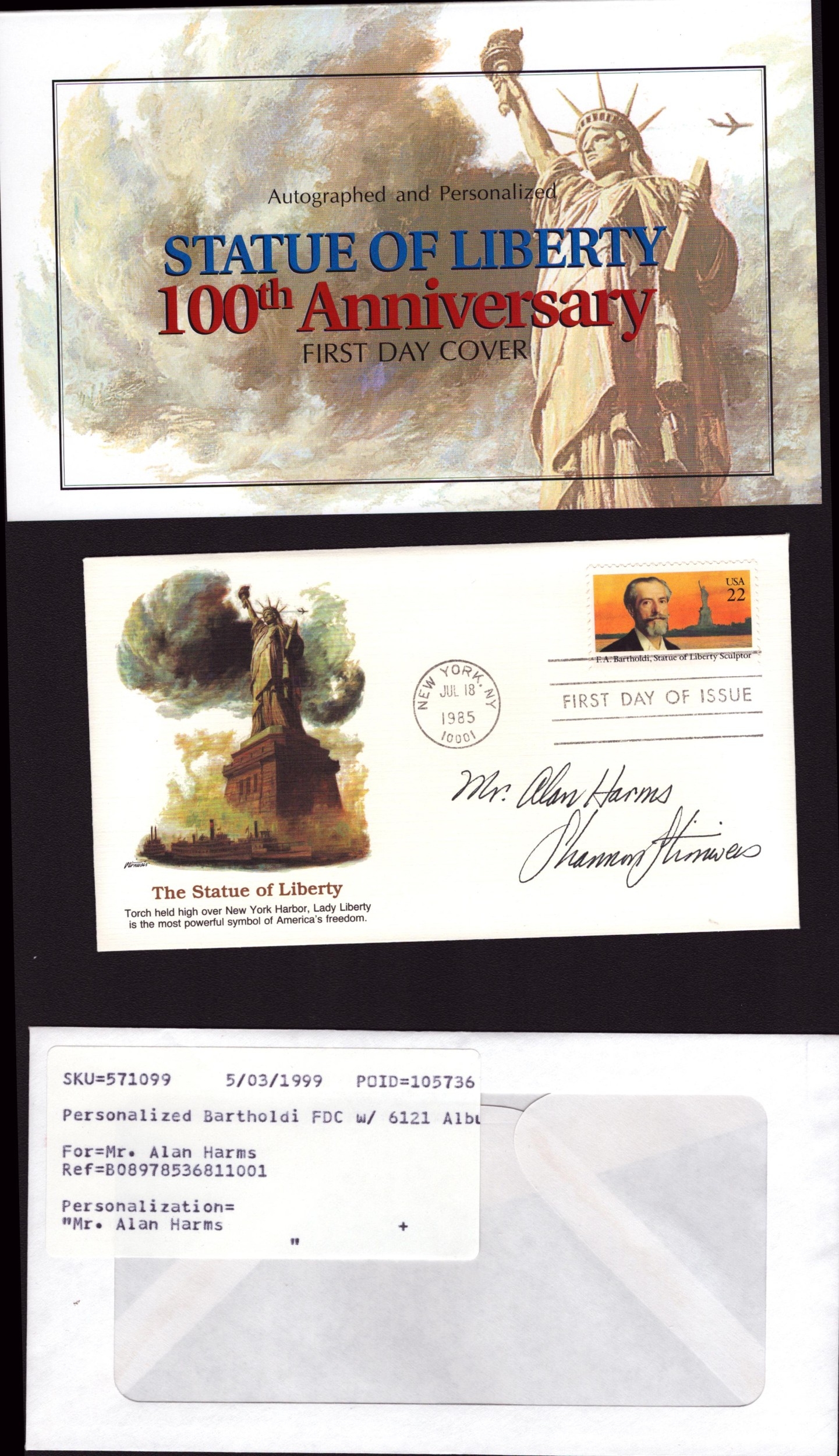 Shannon Stirnweis signed Statue of Liberty 100th Anniversary FDC stamped NYC 18 Jul 1985, dedicated.