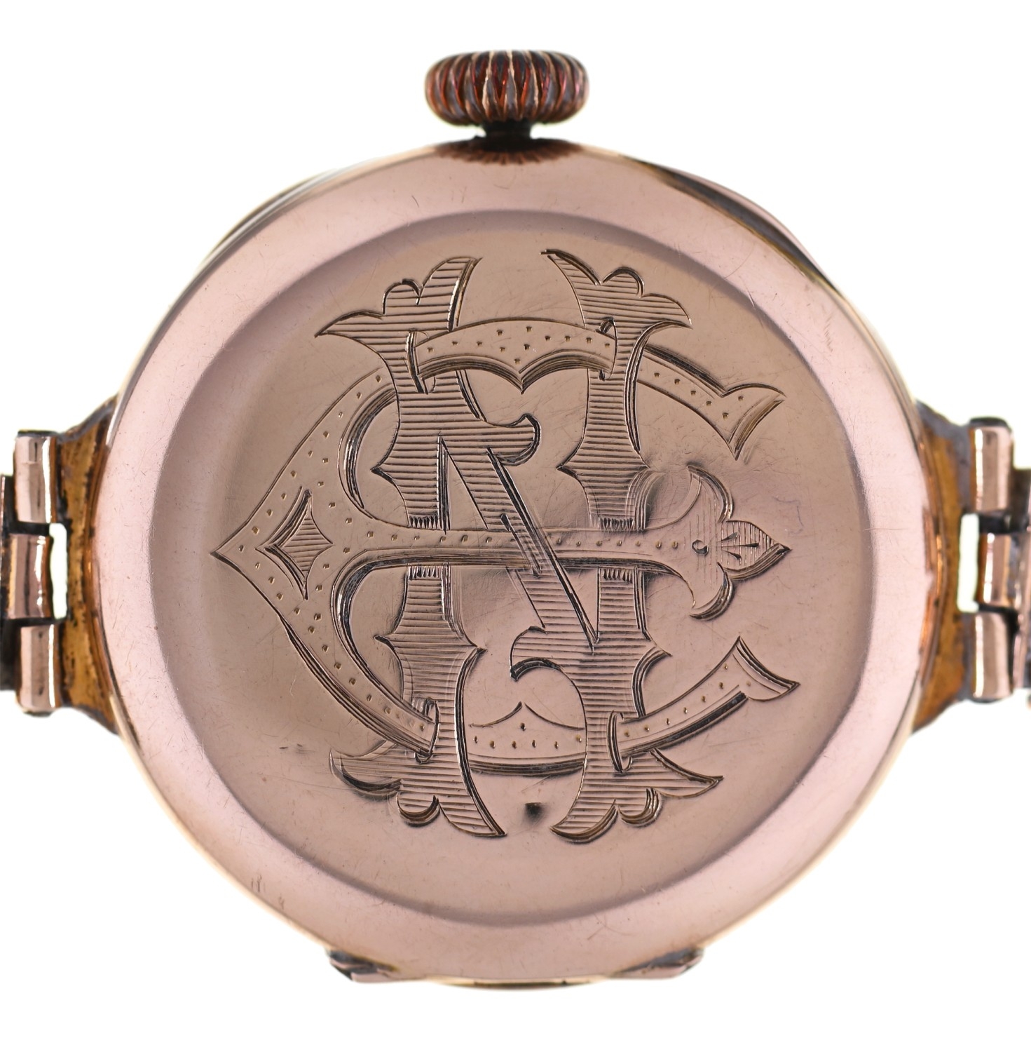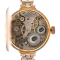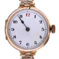 A 9ct gold lady's wristwatch, with enamel dial and Buren movement, 2.8cm diam, import marked, London 1915, on expanding gold bracelet marked 9ct, 26g