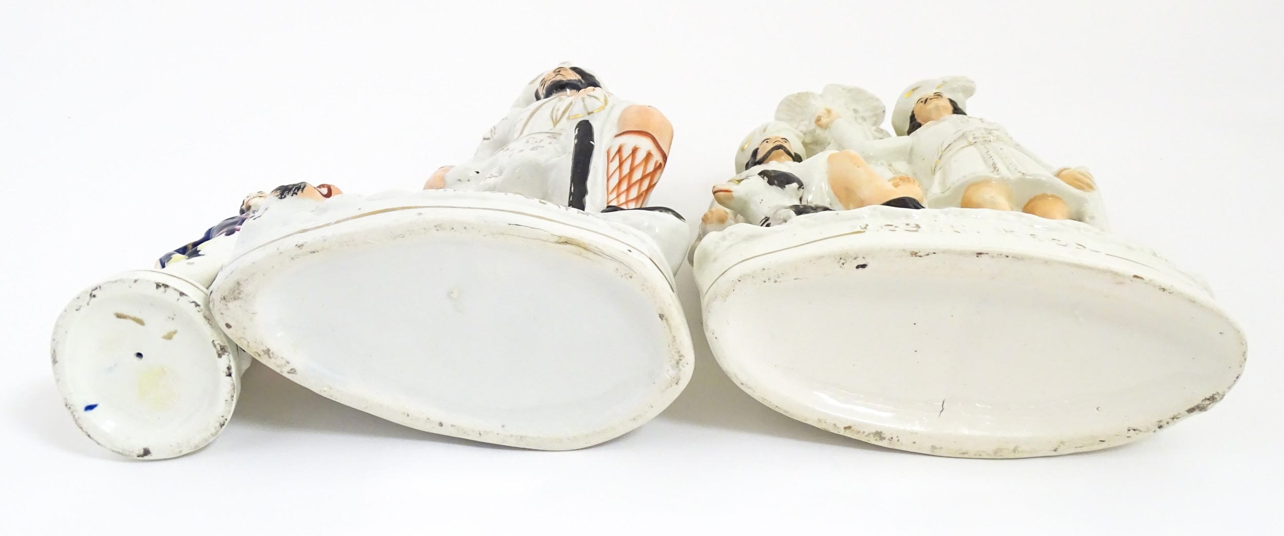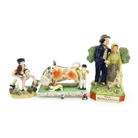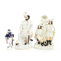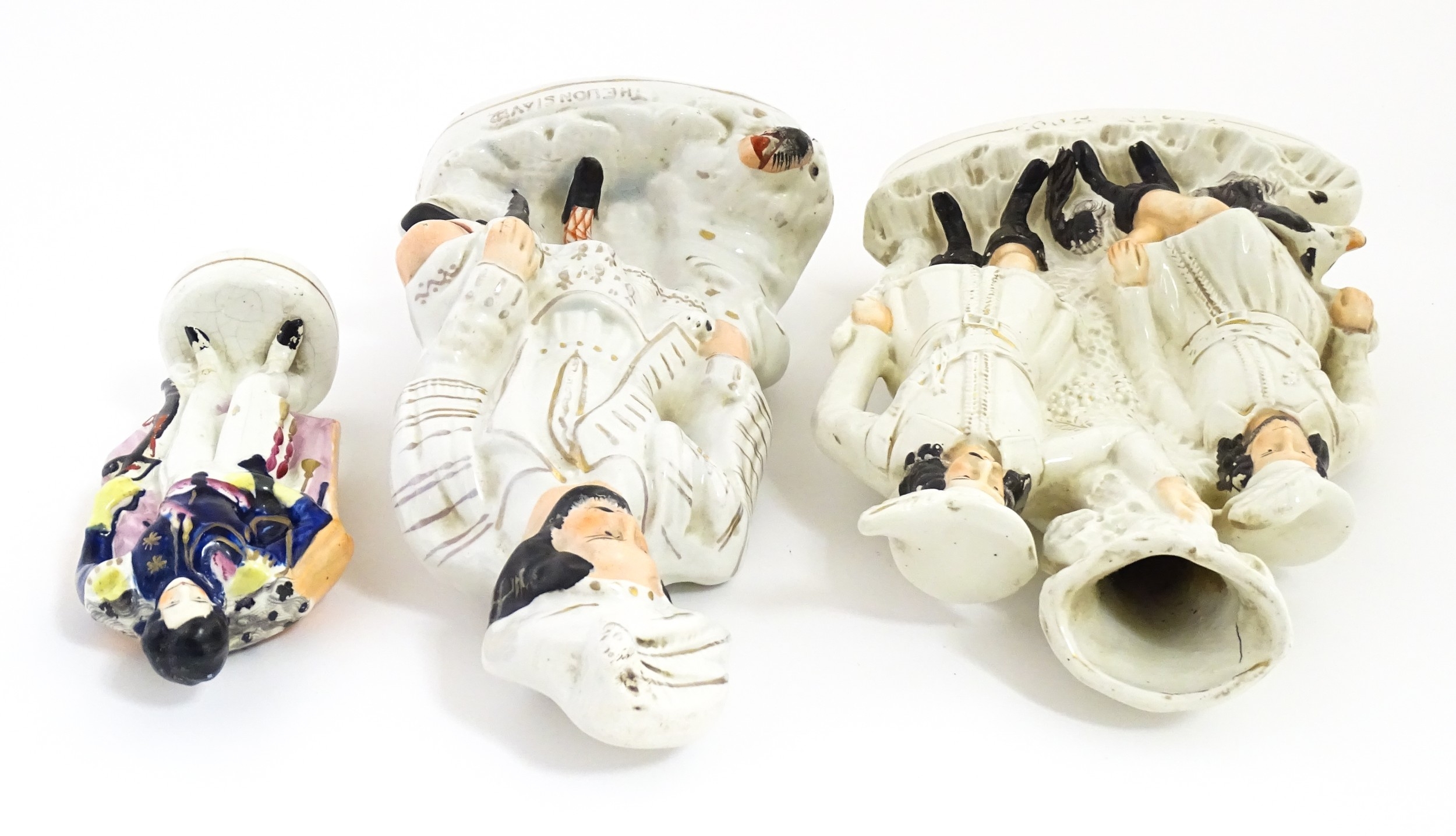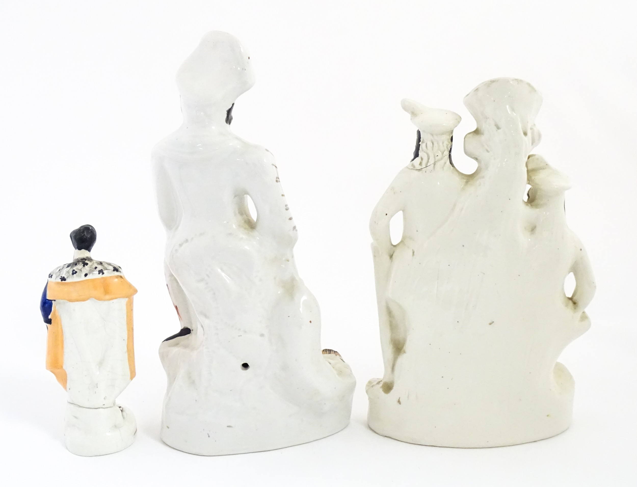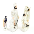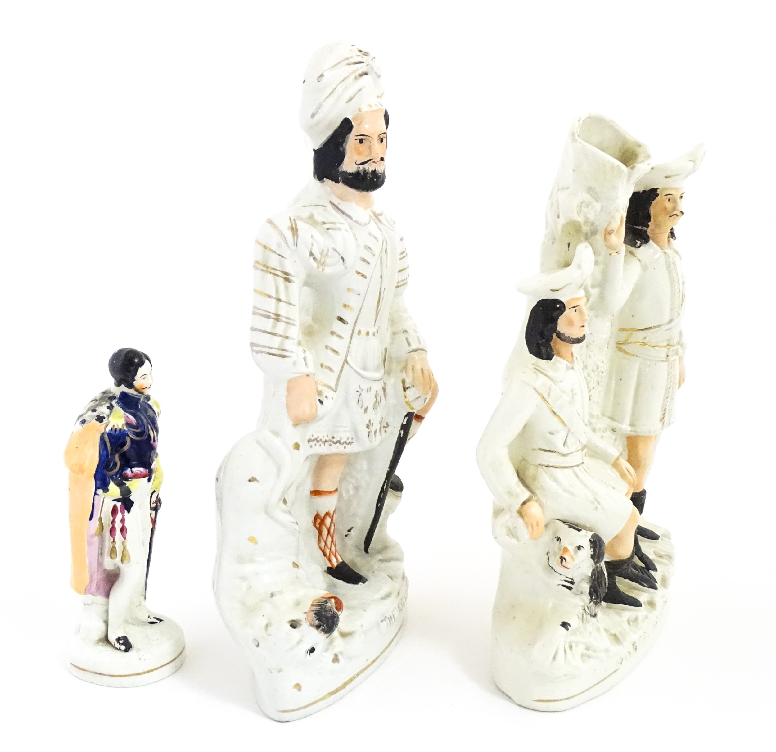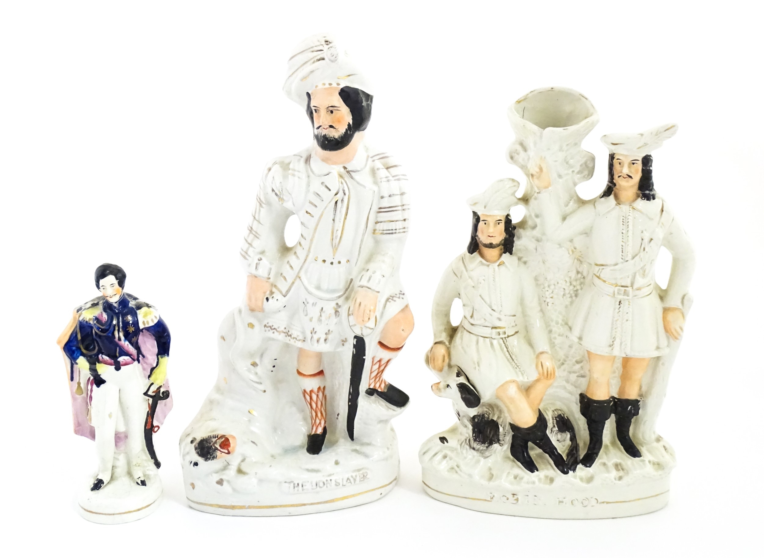 Three Staffordshire pottery figures comprising The Lion Slayer, a spill vase titled Robin Hood, and a model of Prince Albert. Largest approx. 15 3/4" high (3)