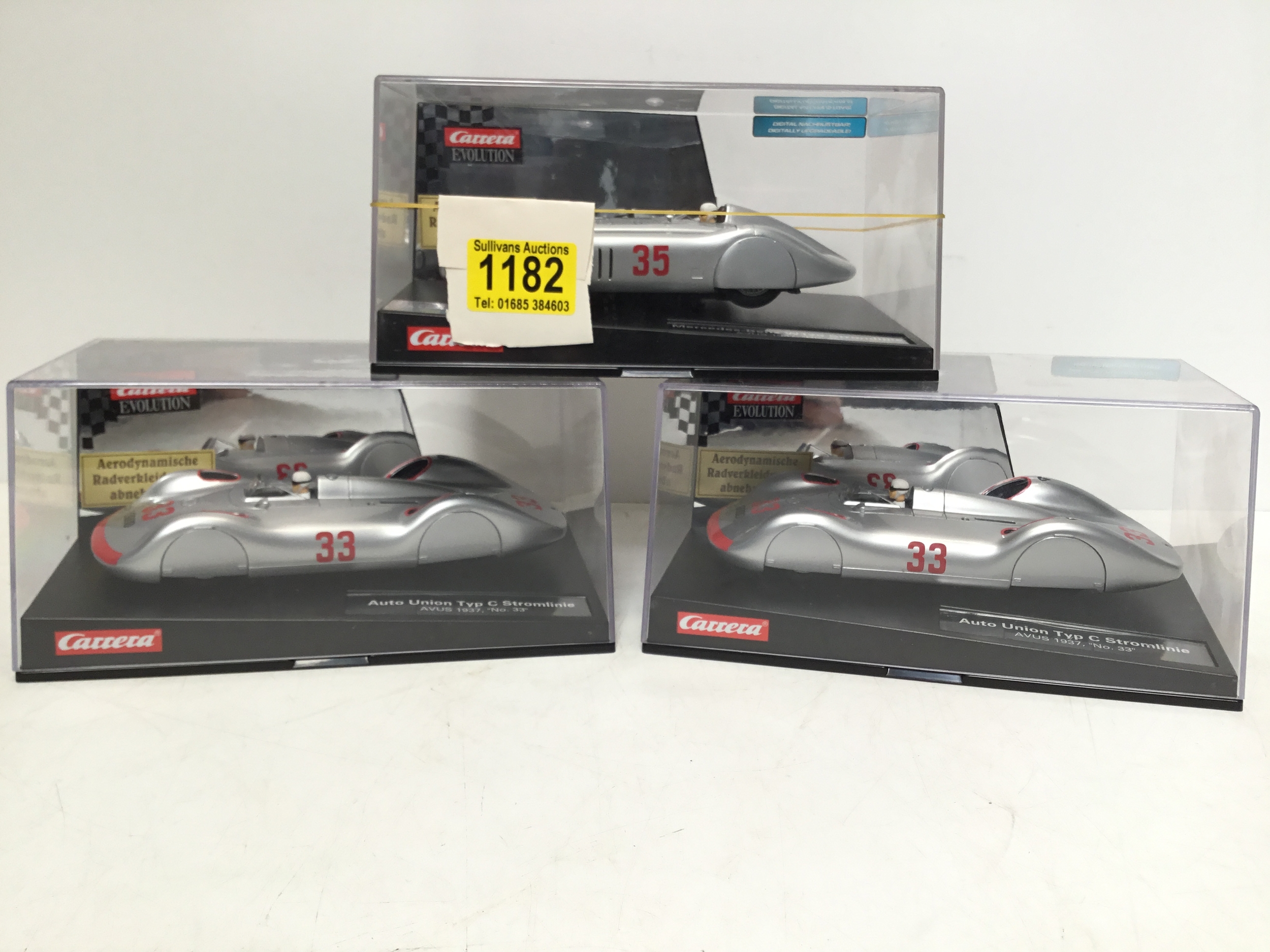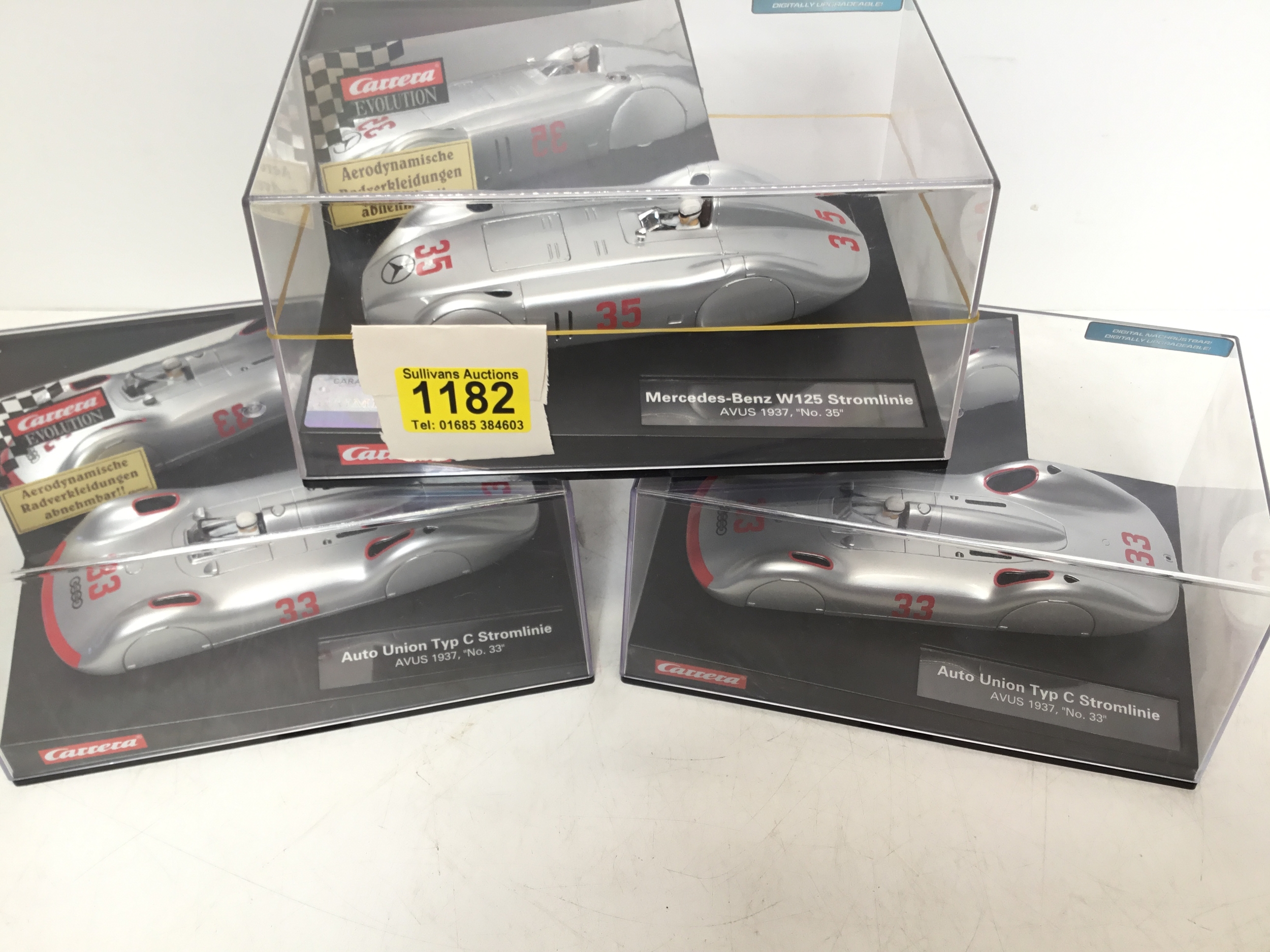 Three Carrera model cars including Auto Union Type C Stromlinie AVUS 1937 no. 33 and Mercedes Benz W125 Stromlinie AVUS 1937 no.35