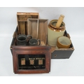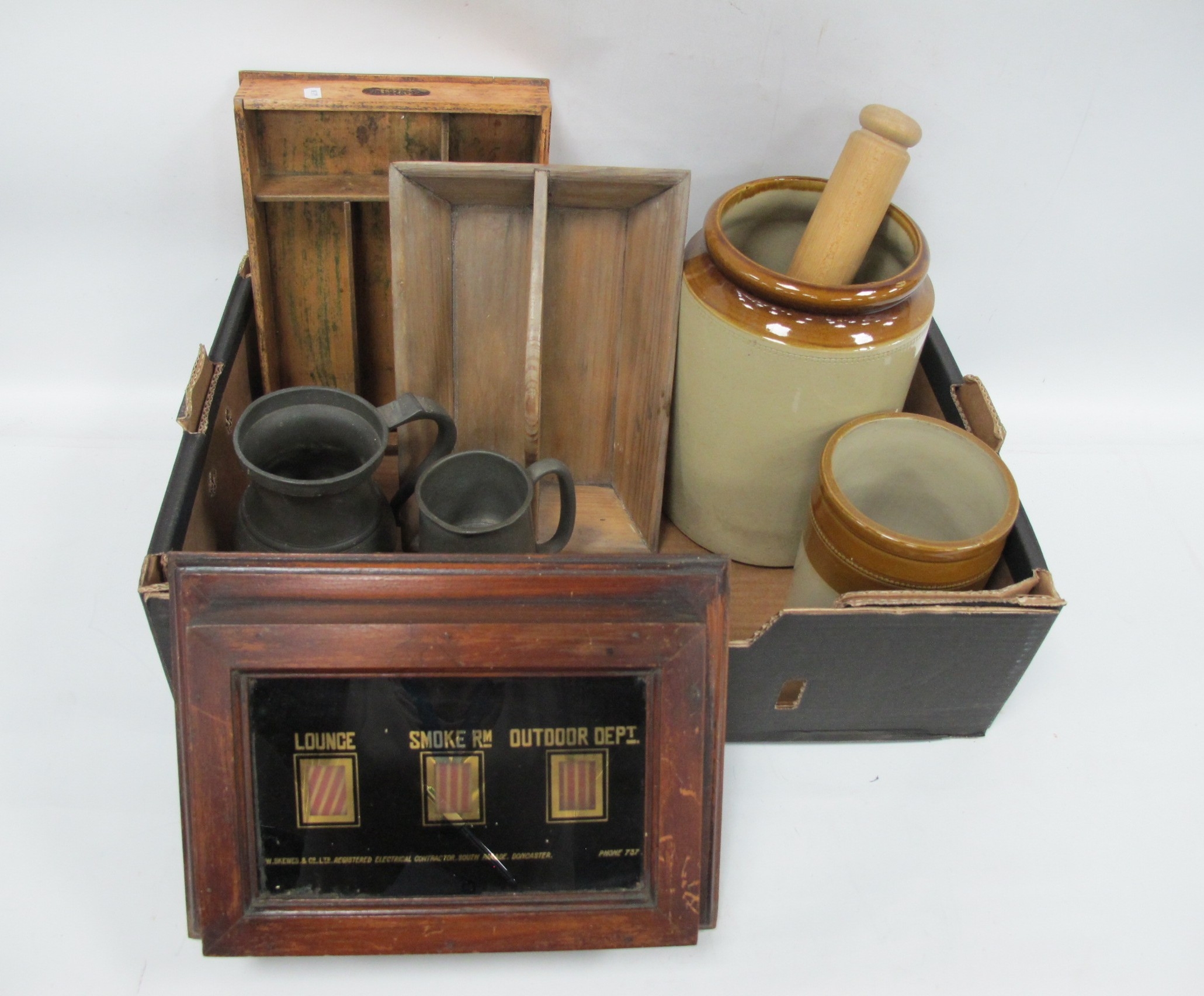 Edwardian Servants Signal, storage jars, XIX Century cutlery tray, XIX Century pewter mug, etc:- One Box.