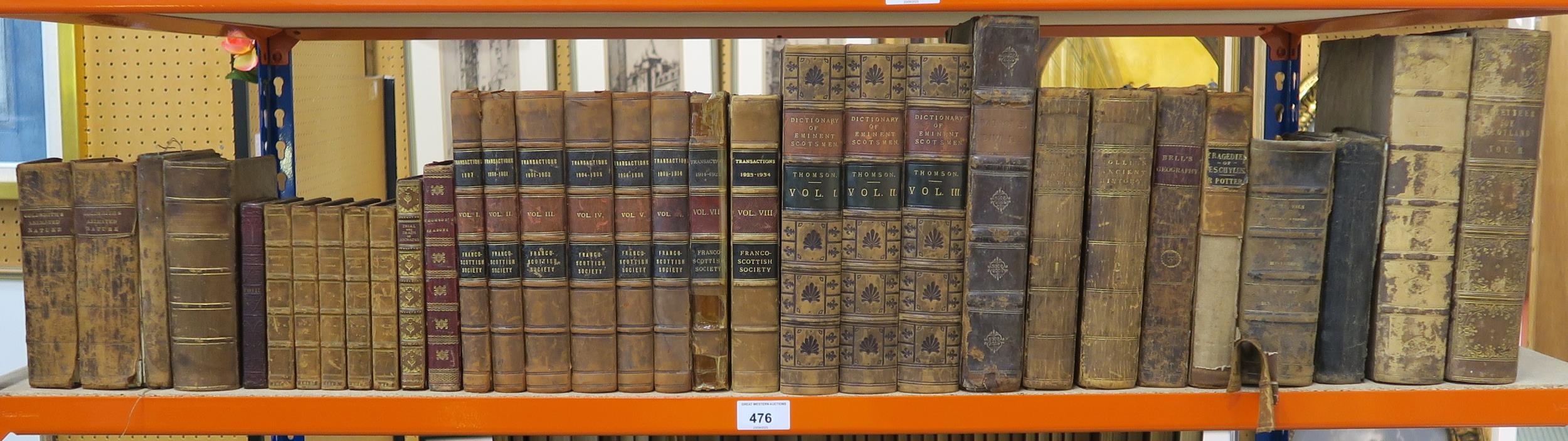 Assorted leather-bound volumes, early-19th century and later, to include Thomson's Dictionary of Eminent Scotsmen in three volumes, Transactions of the Franco-Scottish Society 1897-1934 in eight volumes, Demosthenis: Opera, fully bound in tan calf, five volumes, dated 1813, Rollin's Ancient History of the Egyptians, Cartheginians, Assyrians, Babylonians, Medes, and Persians, Grecians, and Macedonians in two volumes, 1826 etc.