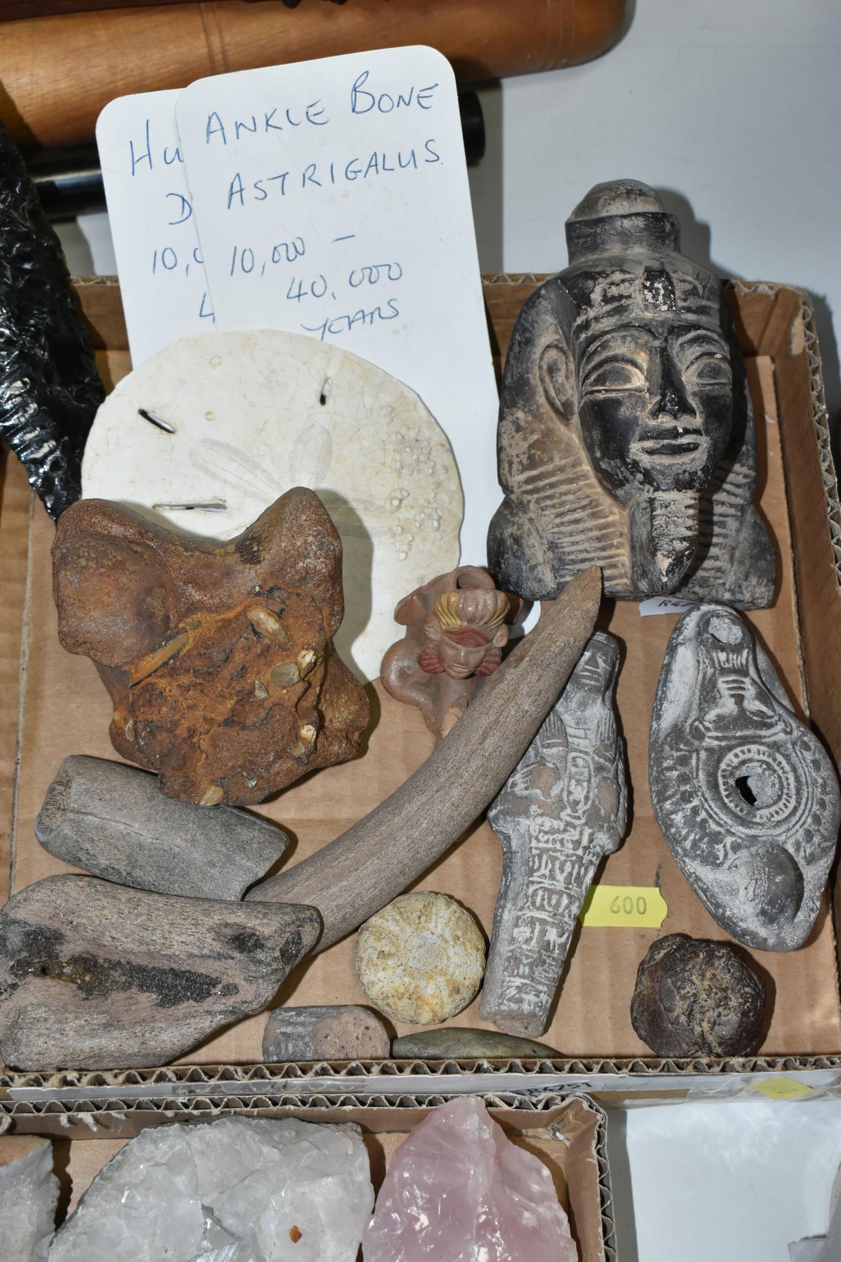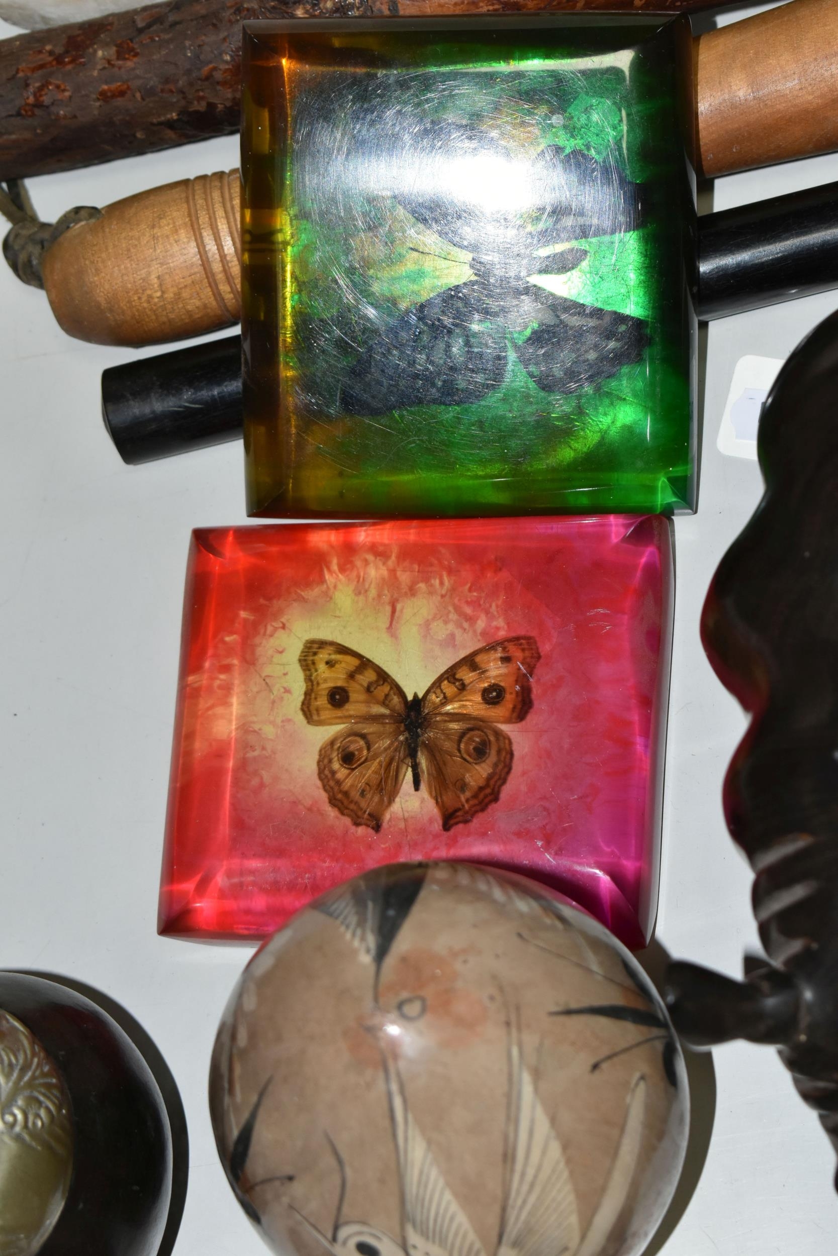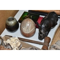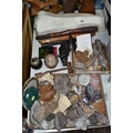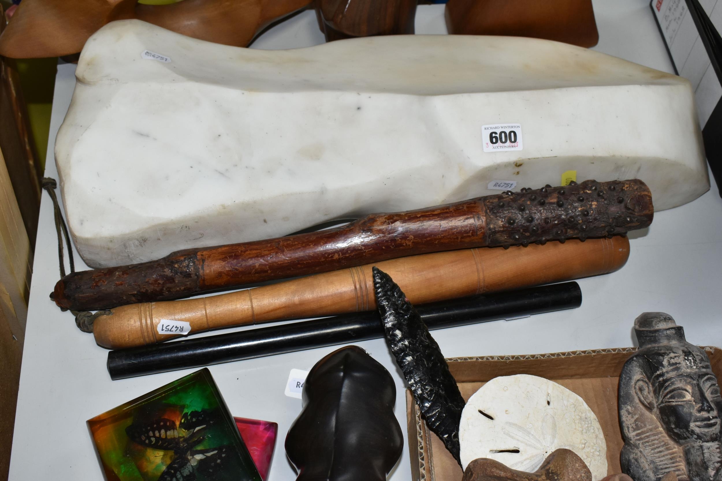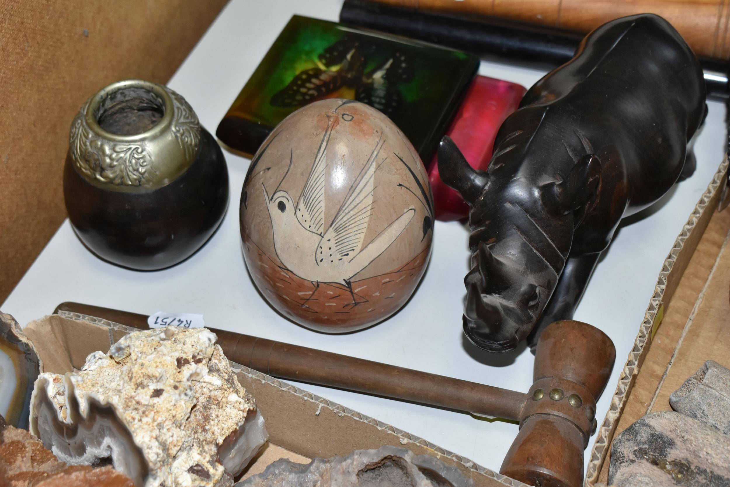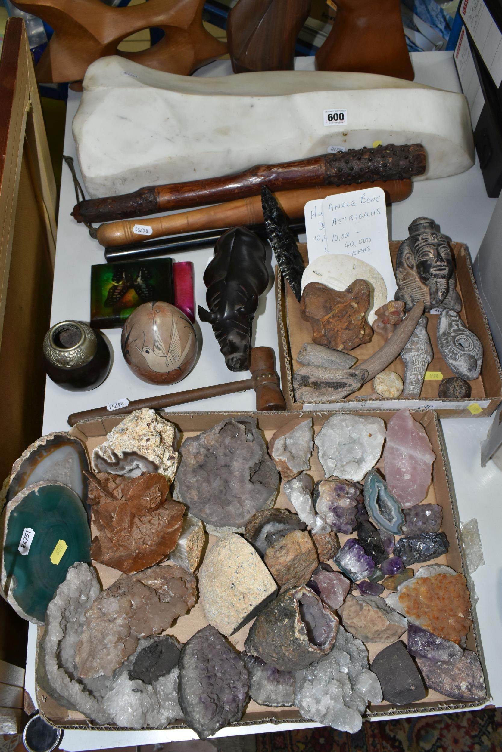 A COLLECTION OF SEMI-PRECIOUS MINERALS, GEODES, FOSSILS AND VINTAGE STUDIO CRAFT SCULPTURES, comprising three mid-century naturalistic wooden sculptures, a naturalistic white marble sculpture, length 57cm x 23cm, a turned wooden truncheon, an Aztec/Mayan style pipe, a South Asian style club, a hardwood hand carved Rhinoceros figure, a Yerba Mate gourd cup with an embossed white metal rim, two Butterflies encased in coloured resin, Desert Rose gypsum selenite crystal, an Agate crystal geode, amethyst geodes, fossilised deer bone and horn, etc. (2 trays + loose)