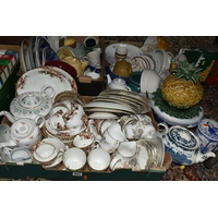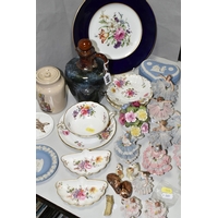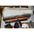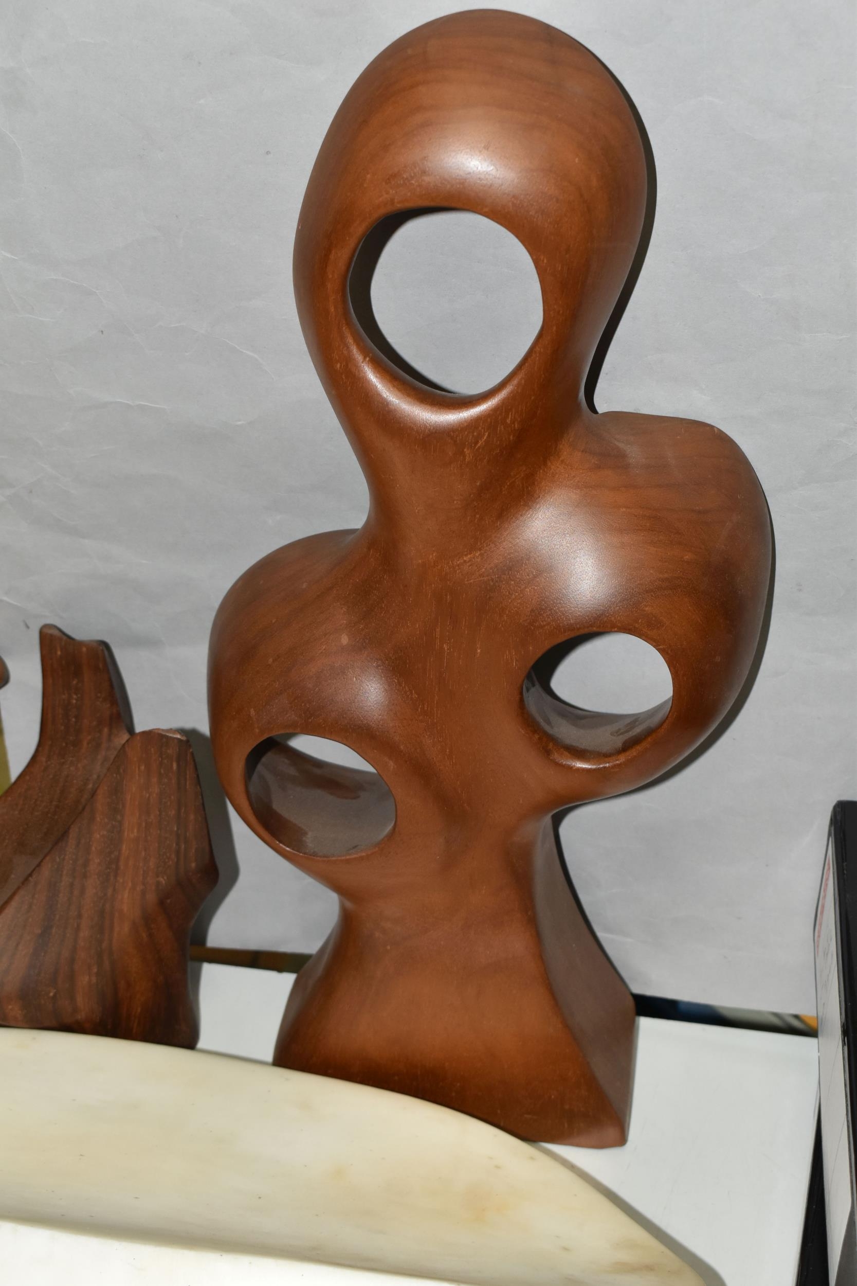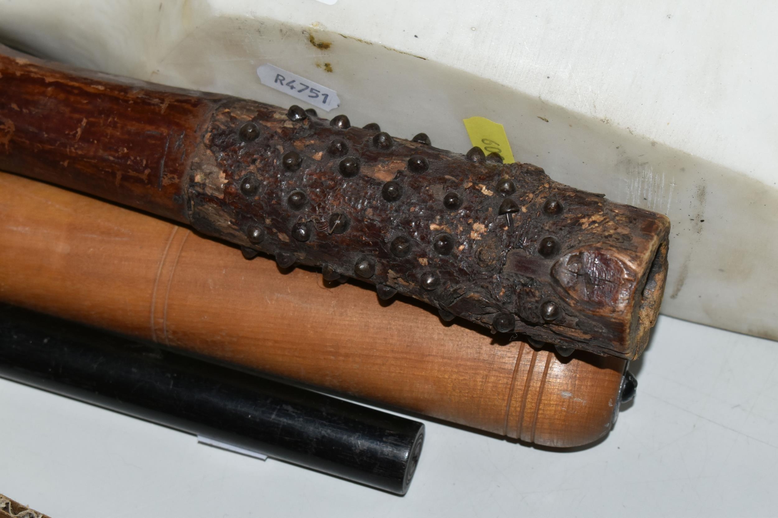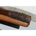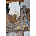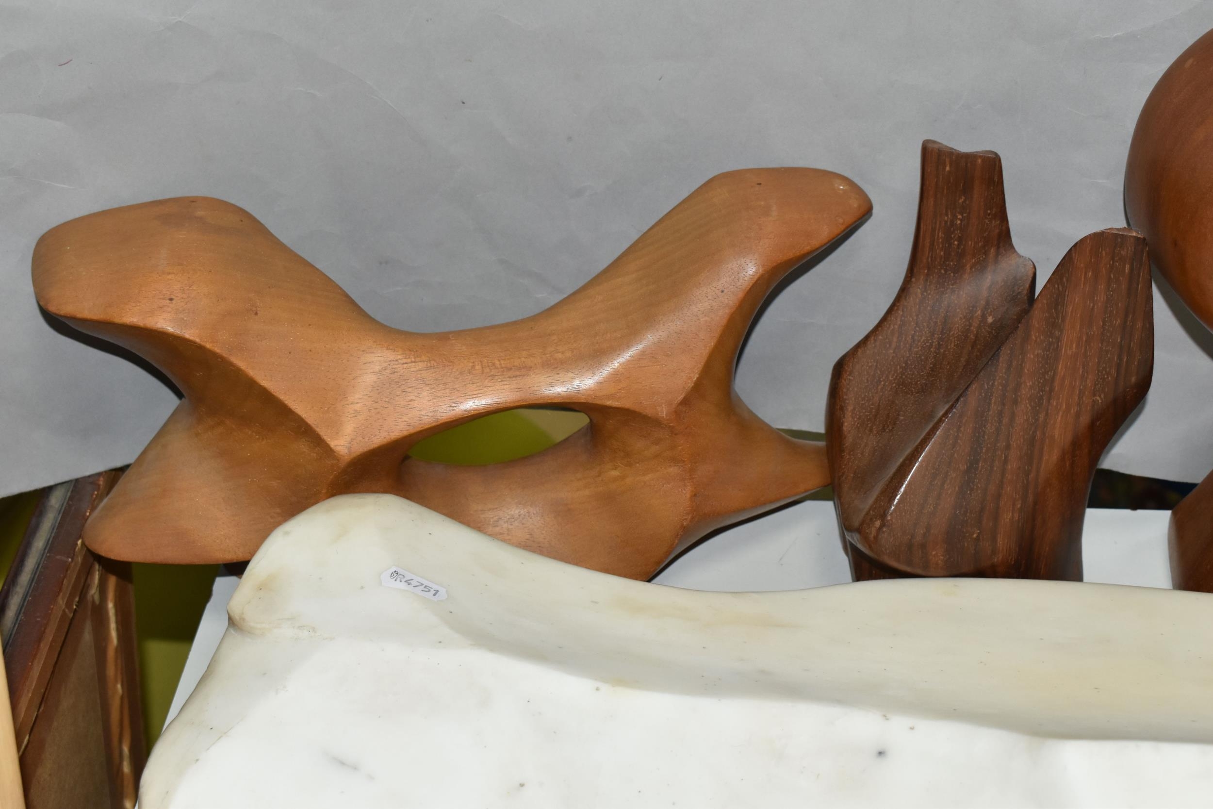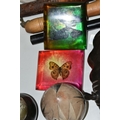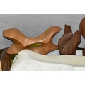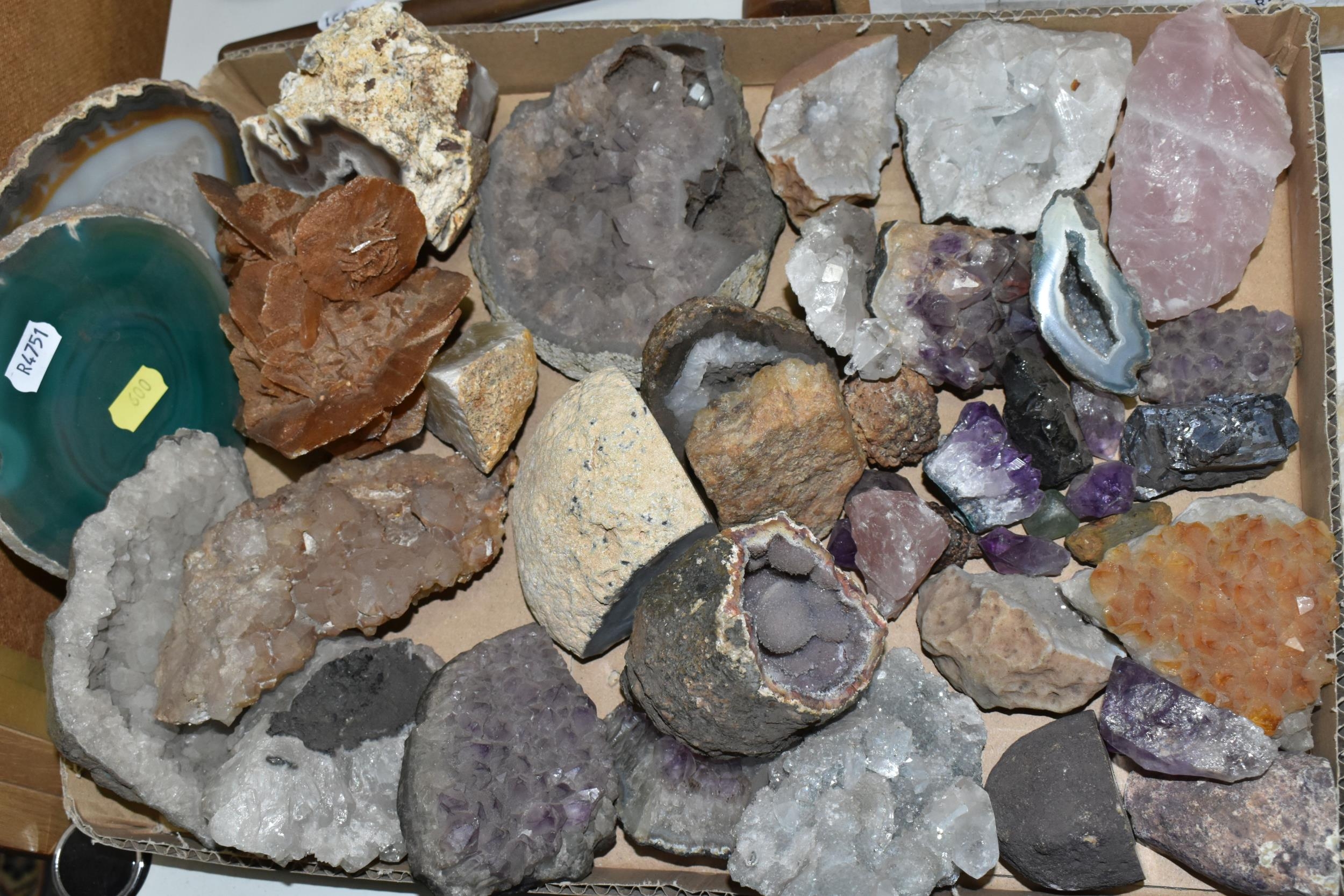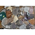 A COLLECTION OF SEMI-PRECIOUS MINERALS, GEODES, FOSSILS AND VINTAGE STUDIO CRAFT SCULPTURES, comprising three mid-century naturalistic wooden sculptures, a naturalistic white marble sculpture, length 57cm x 23cm, a turned wooden truncheon, an Aztec/Mayan style pipe, a South Asian style club, a hardwood hand carved Rhinoceros figure, a Yerba Mate gourd cup with an embossed white metal rim, two Butterflies encased in coloured resin, Desert Rose gypsum selenite crystal, an Agate crystal geode, amethyst geodes, fossilised deer bone and horn, etc. (2 trays + loose)