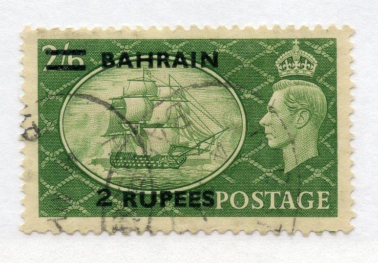 BAHRAIN 1950 - 55 2r on 2/6 yellow green type 2 surcharge fu. SG 77a. Cat £55.