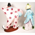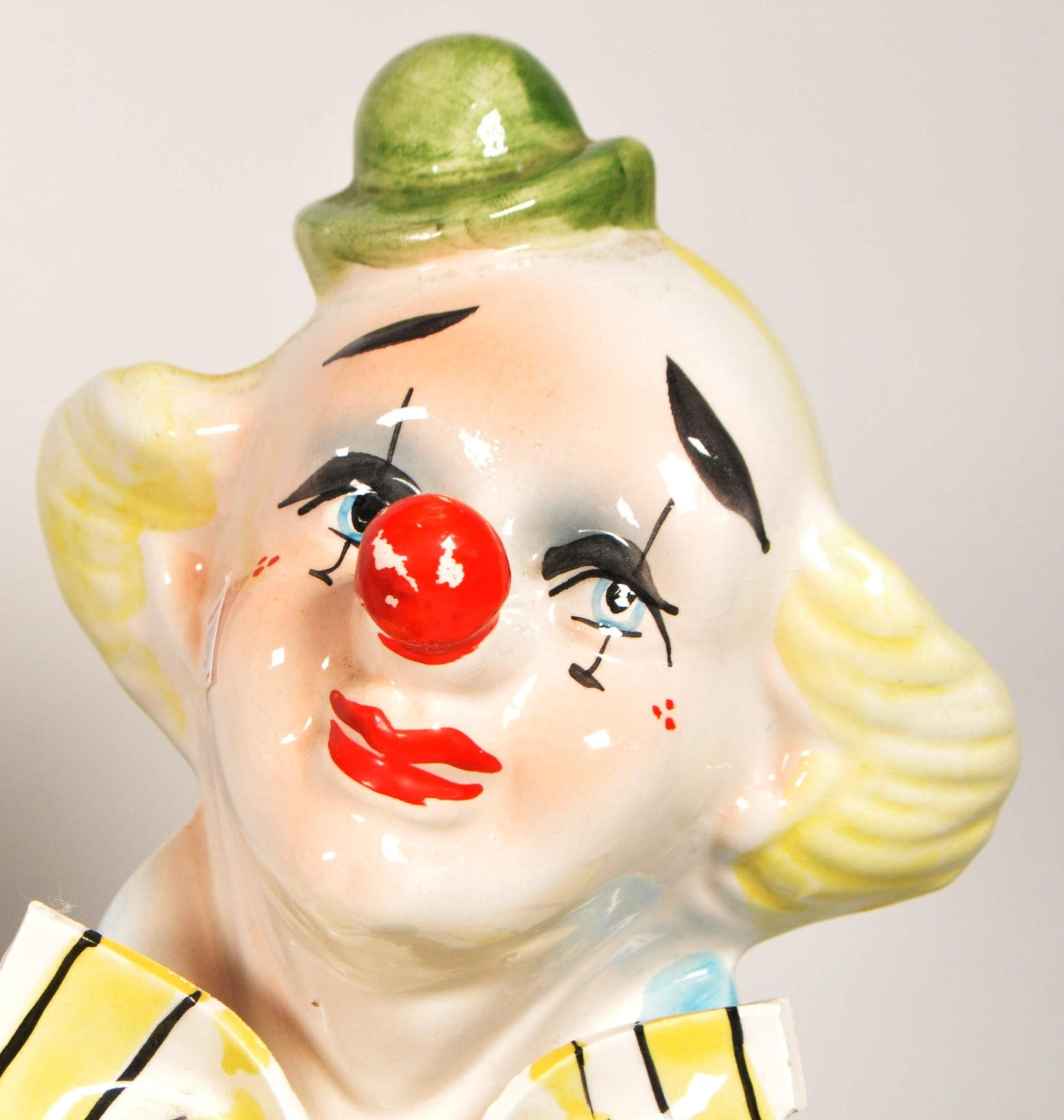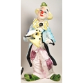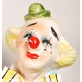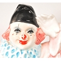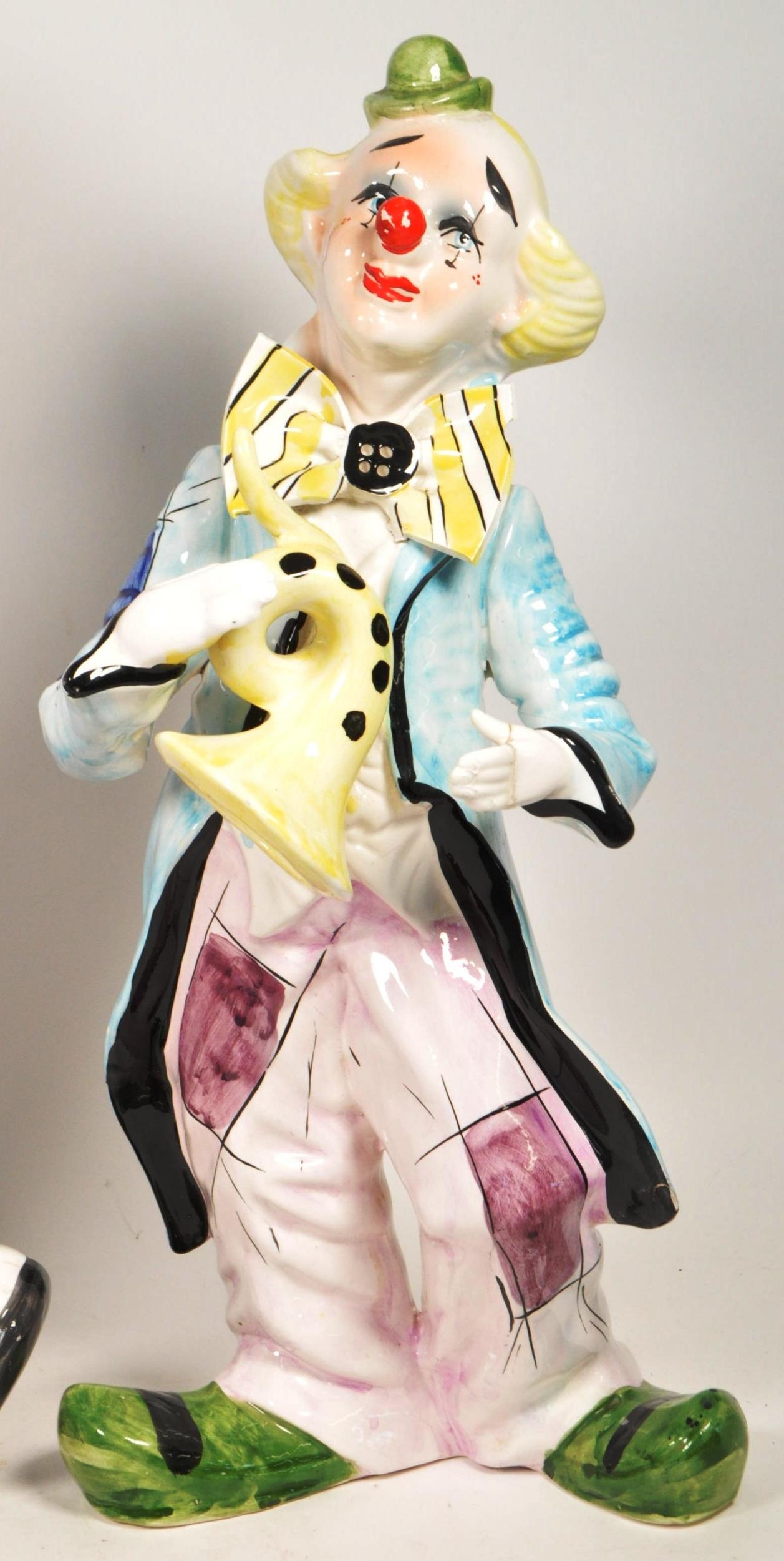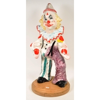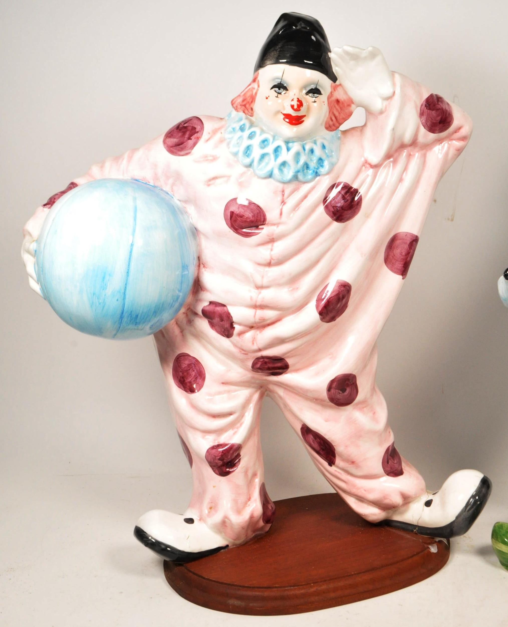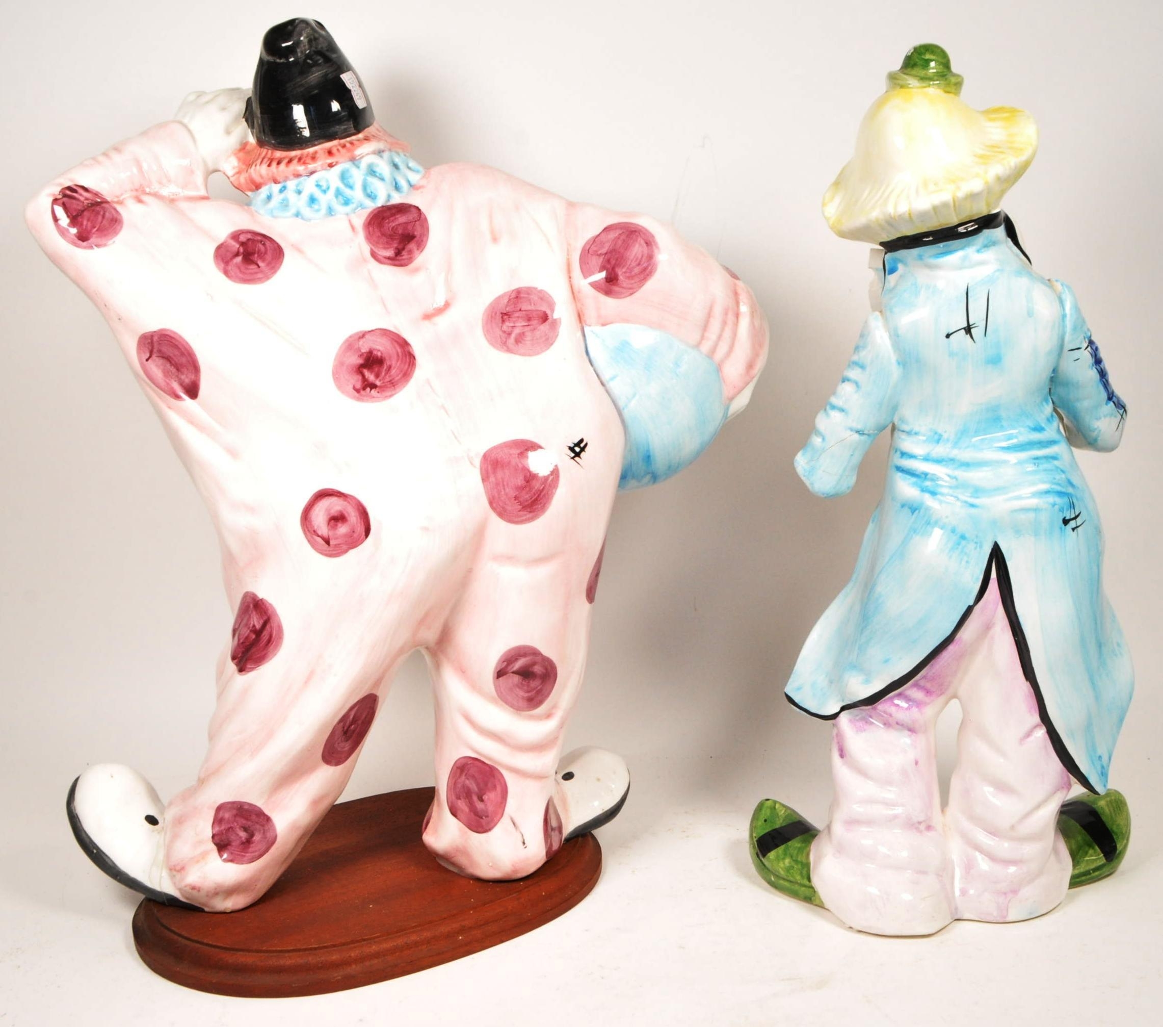 Two large late 20th century vintage ceramic clown figures. Comprised of one positioned holding a ball in a pink, purple and blue colourway raised on a wooden plinth style base, and another in a yellow, blue, pink and green colourway depicted holding a trumpet. Largest measuring approx. 51cm tall. Unmarked. Sold AF.