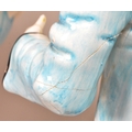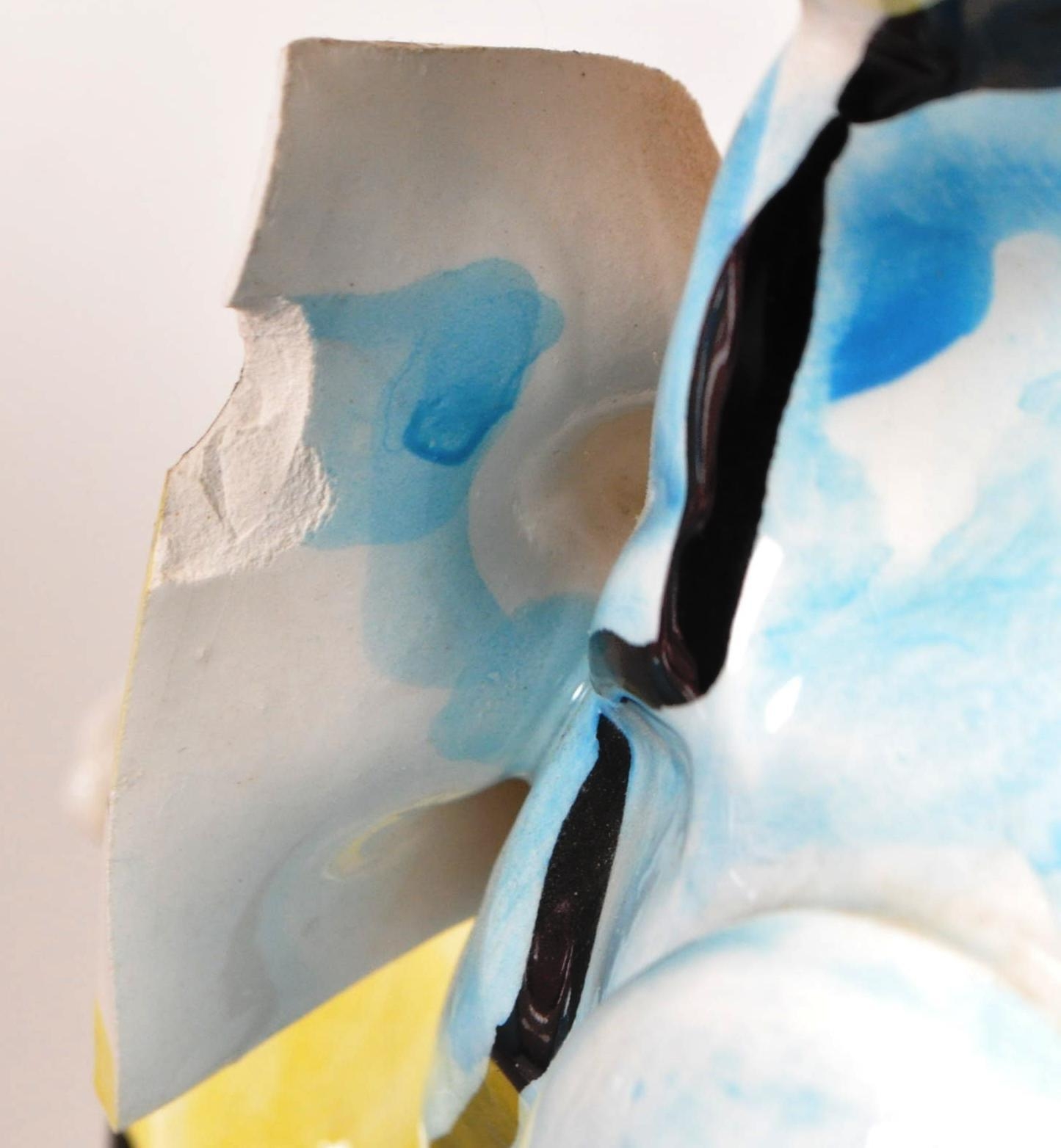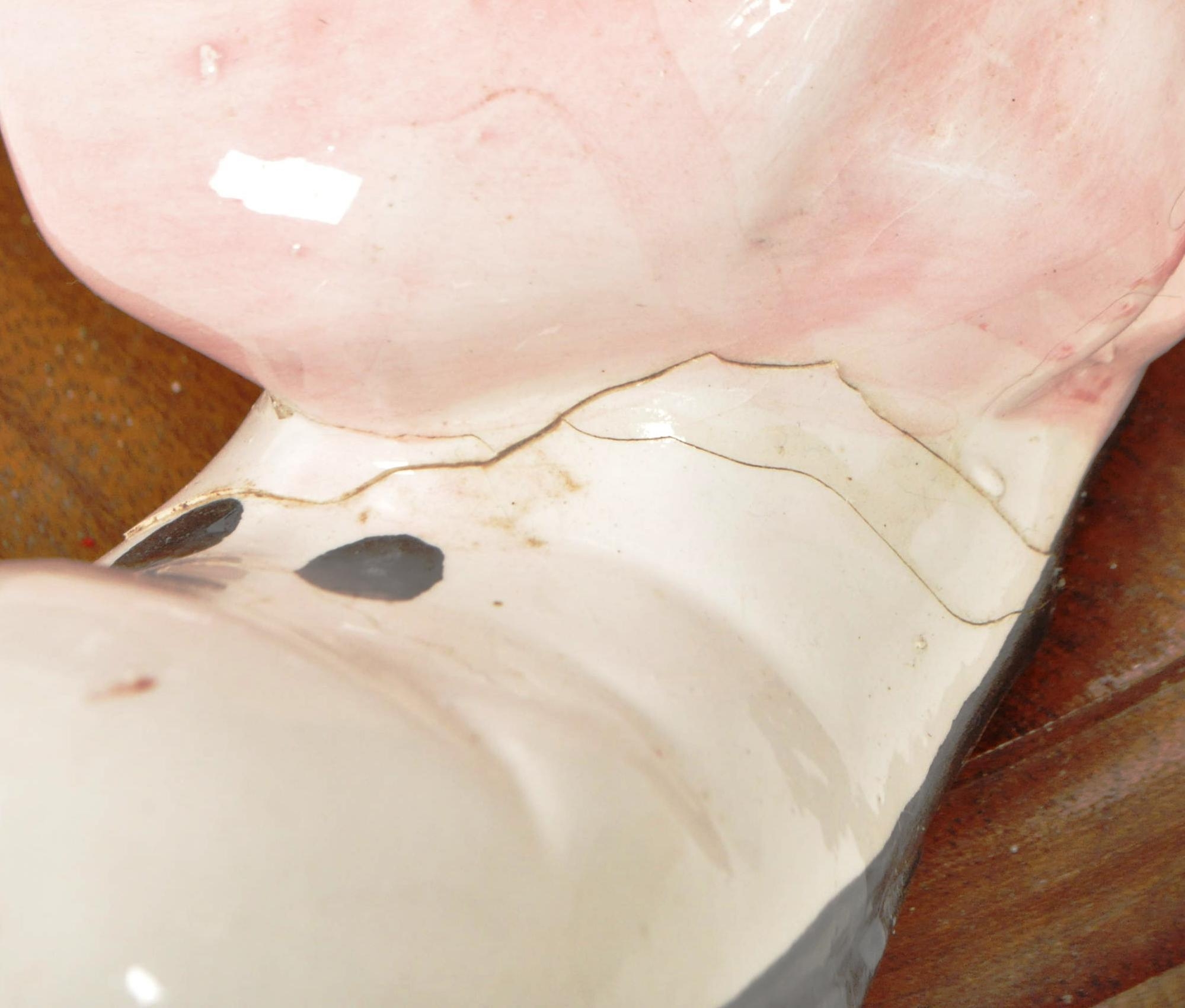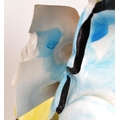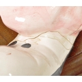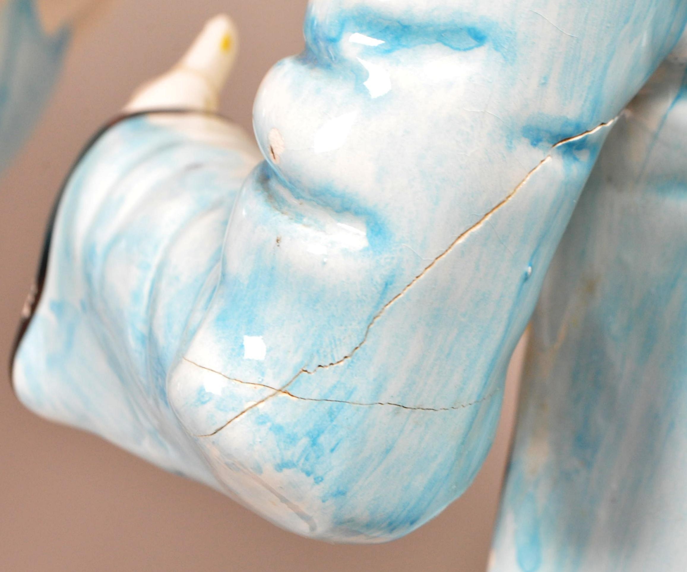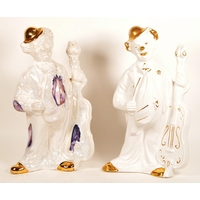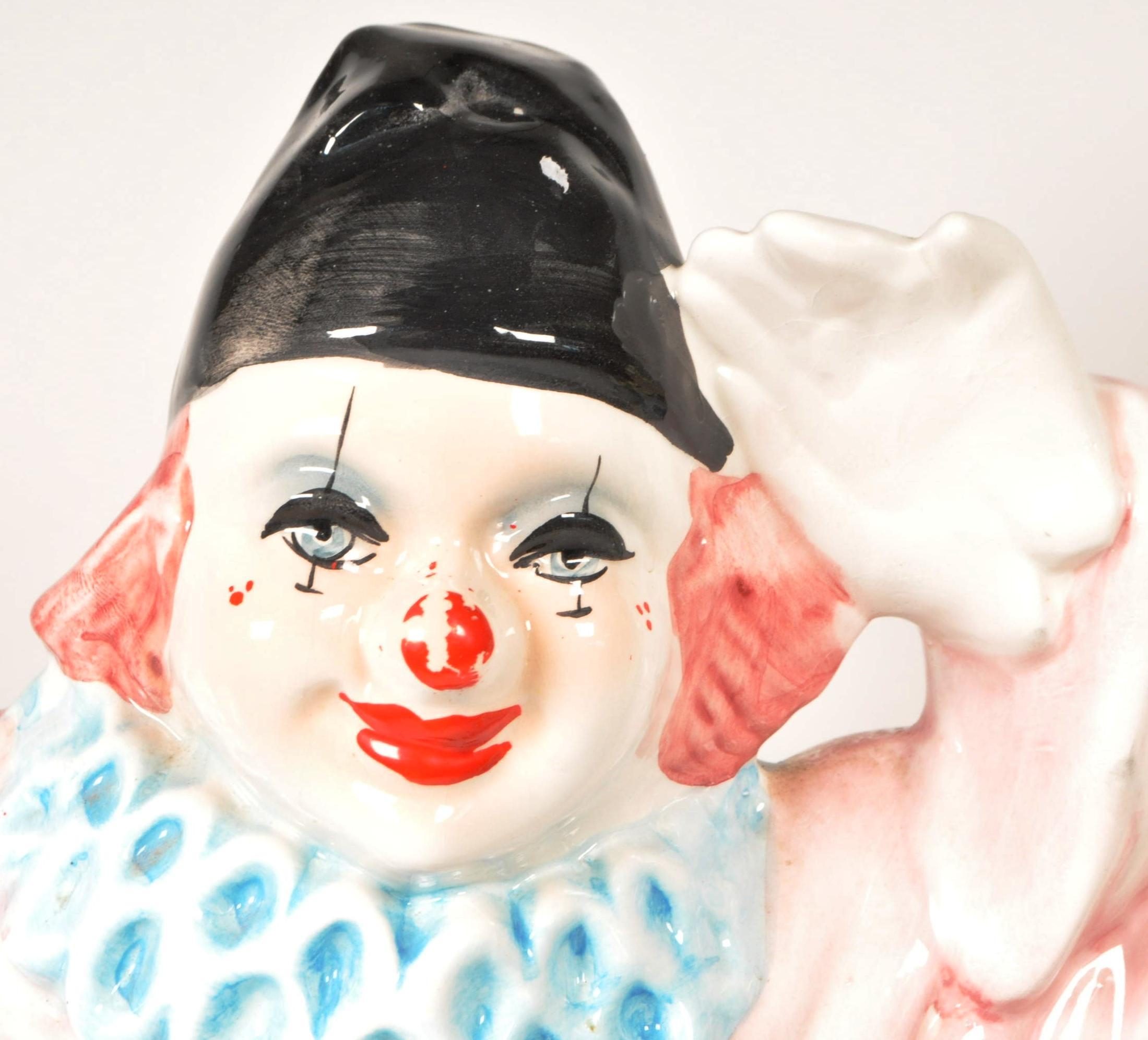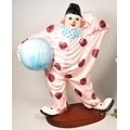 Two large late 20th century vintage ceramic clown figures. Comprised of one positioned holding a ball in a pink, purple and blue colourway raised on a wooden plinth style base, and another in a yellow, blue, pink and green colourway depicted holding a trumpet. Largest measuring approx. 51cm tall. Unmarked. Sold AF.