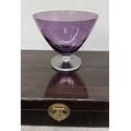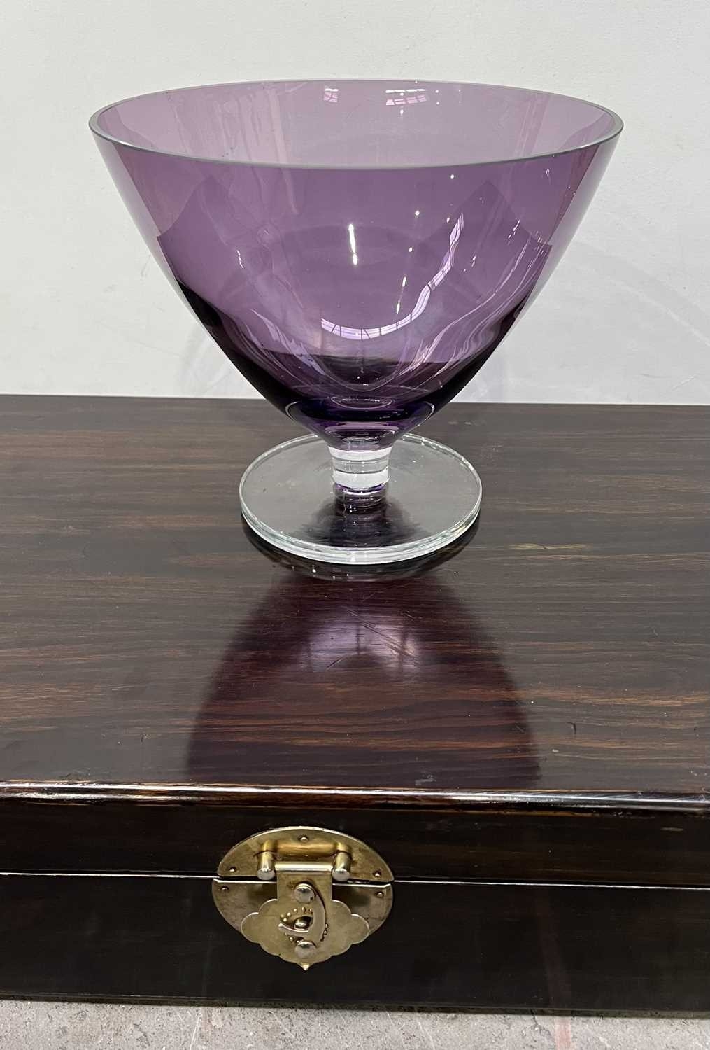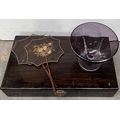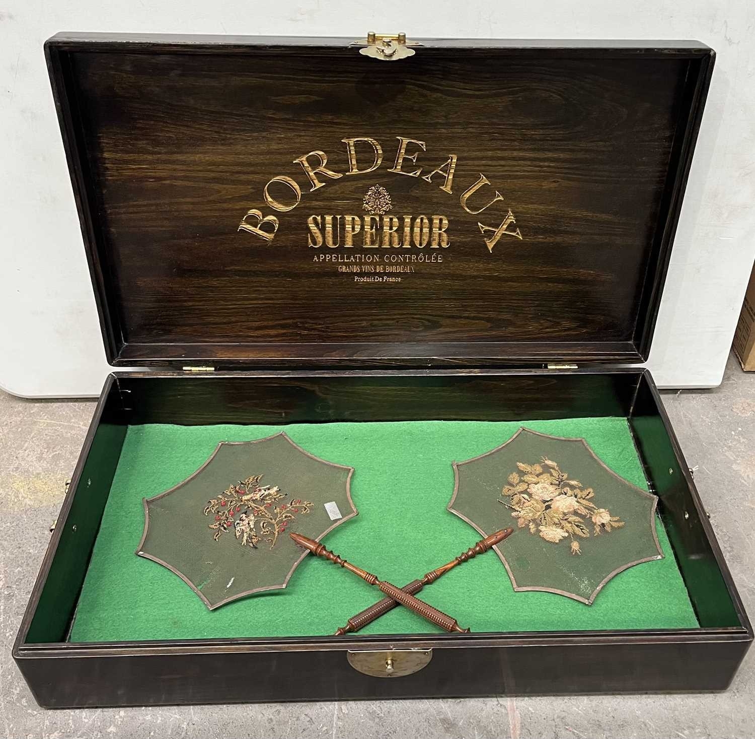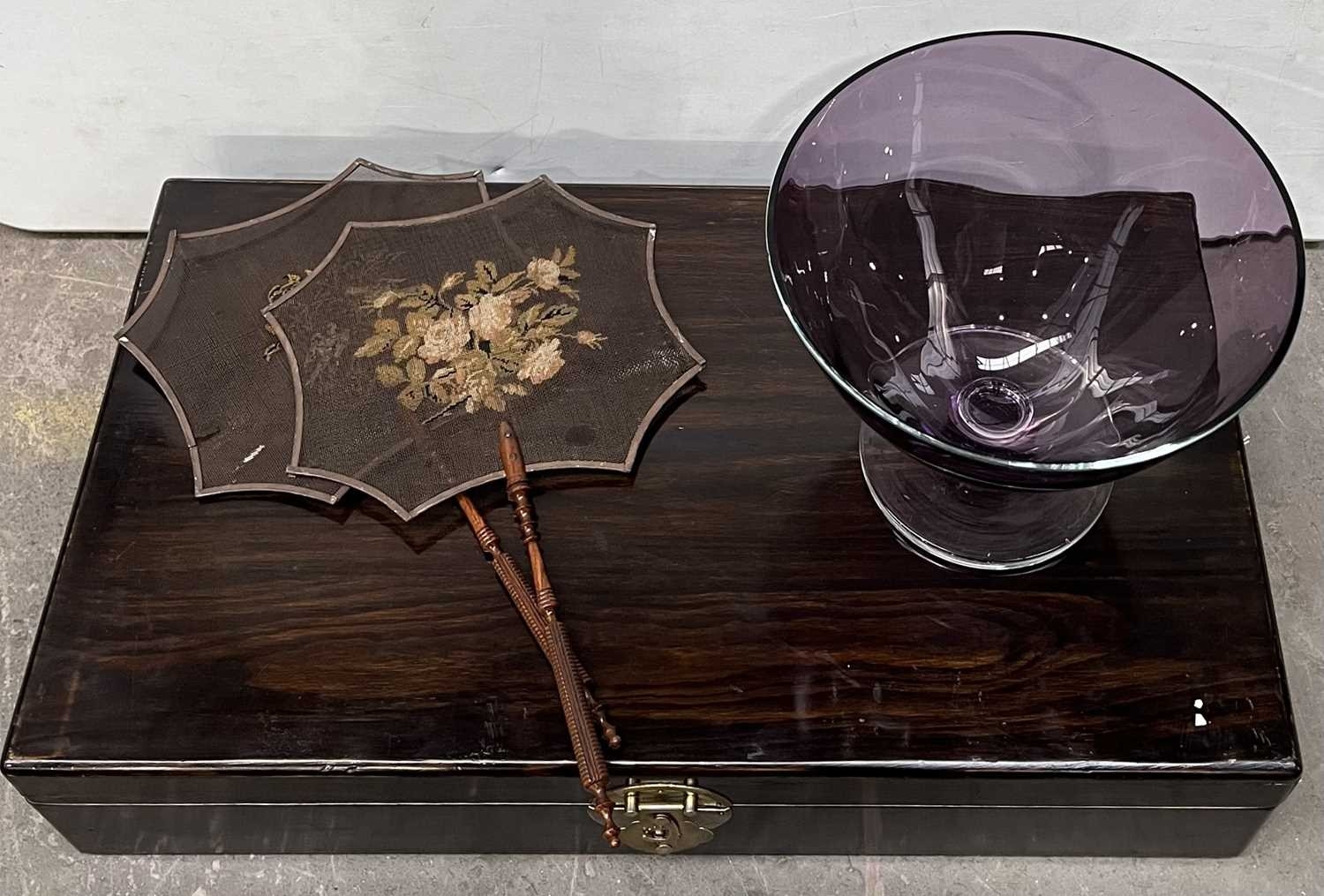 A Chinese hardwood wine box with brass drop handles and a brass front fastener, L: inc handles 64cm, a large glass, amethyst colour pedestal bowl H: 20.5cm and two hand-held, hand-embroidered fire face screens with turned wooden handles L:39cm (2 trays)