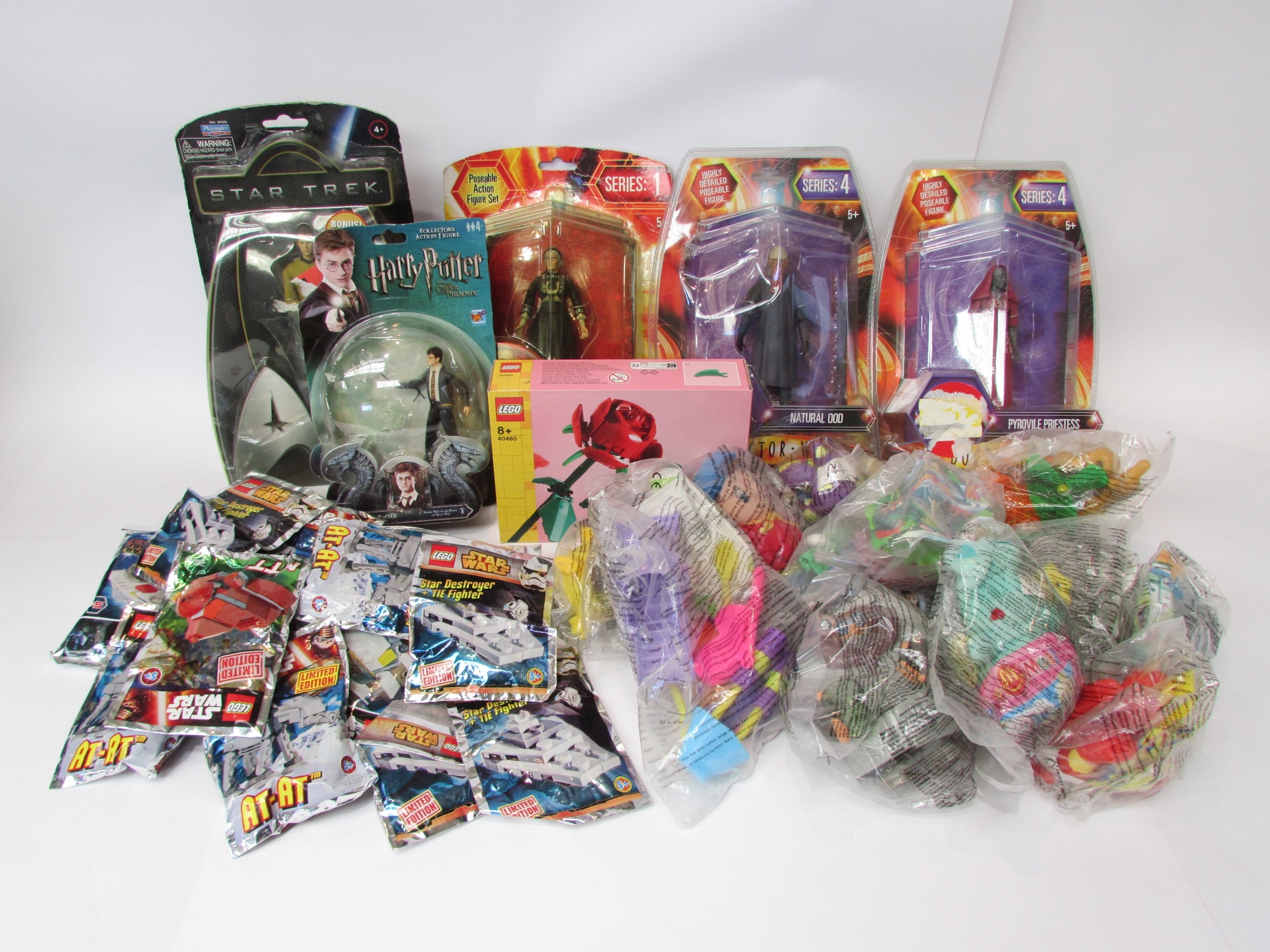 Collection of sealed toys to include Doctor Who action figures series 1 Gelth Zombie, series 4 Natural Ood and series 4 Pyroville Priestess, Harry Potter and the Order of the Pheonix action figure Harry Potter, Star Trek Warp Collection Kirk action figure, various sealed McDonalds plastic Happy Meal toys, and various sealed limited edition LEGO Disney Star Wars miniature vehicles and spaceships, plus a LEGO roses box