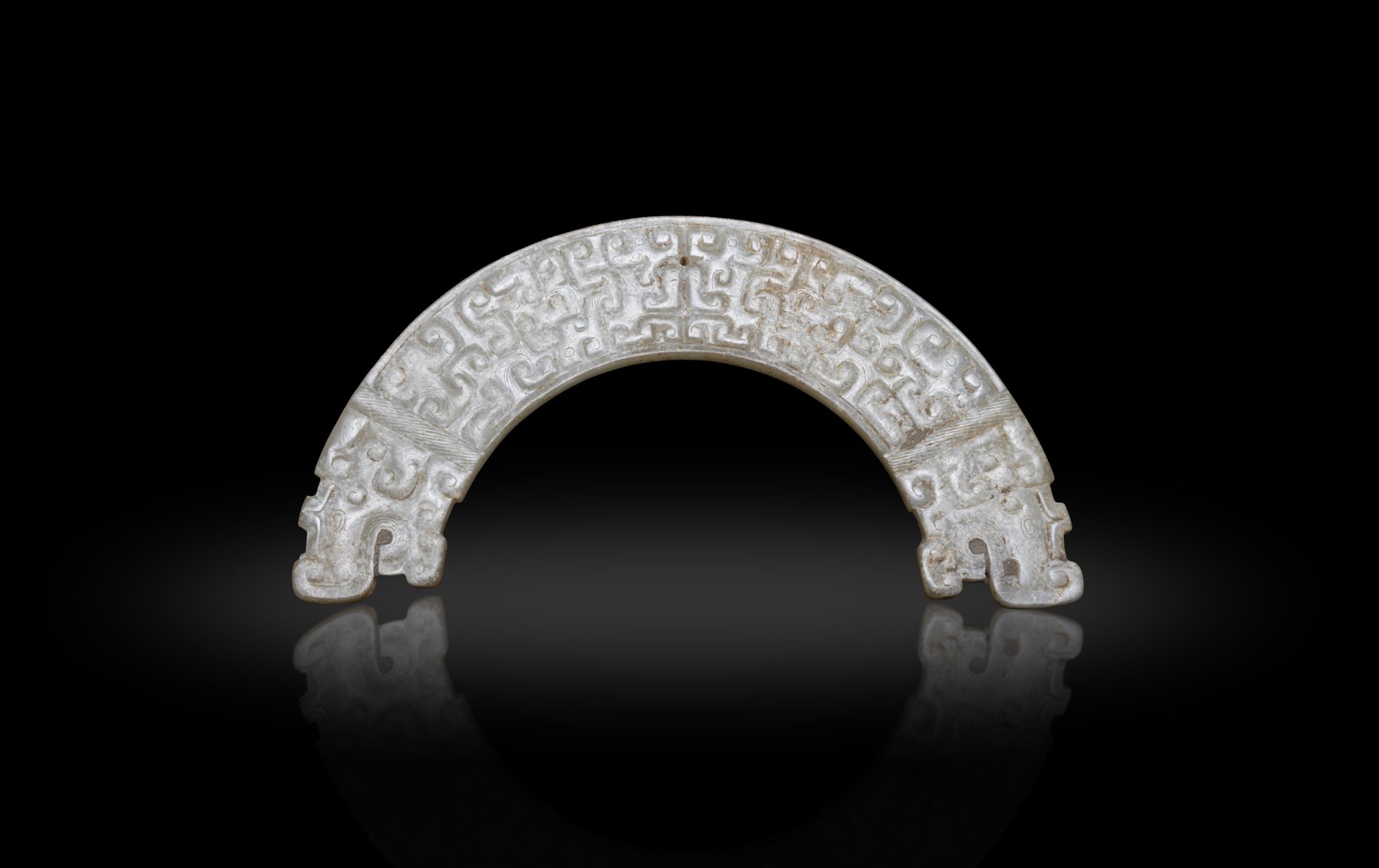AN ARCHAISTIC FLAT, ARC-SHAPED, CALCIFIED JADE HANG WITH DRAGON HEADS AND S-SCROLLS ?? ?????? China, Han dynasty L. 13.7cm