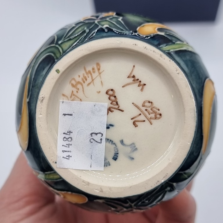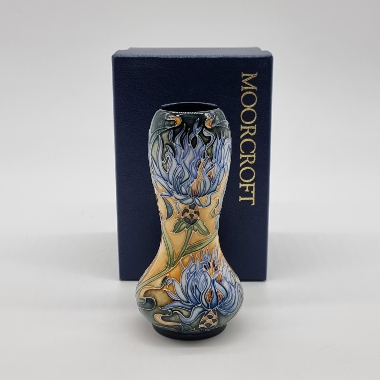 A Moorcroft 'Cornflower' pattern double gourd vase, by Rachel Bishop, signed, dated 2000 and numbered 71/650, 15.5cm high, boxed.