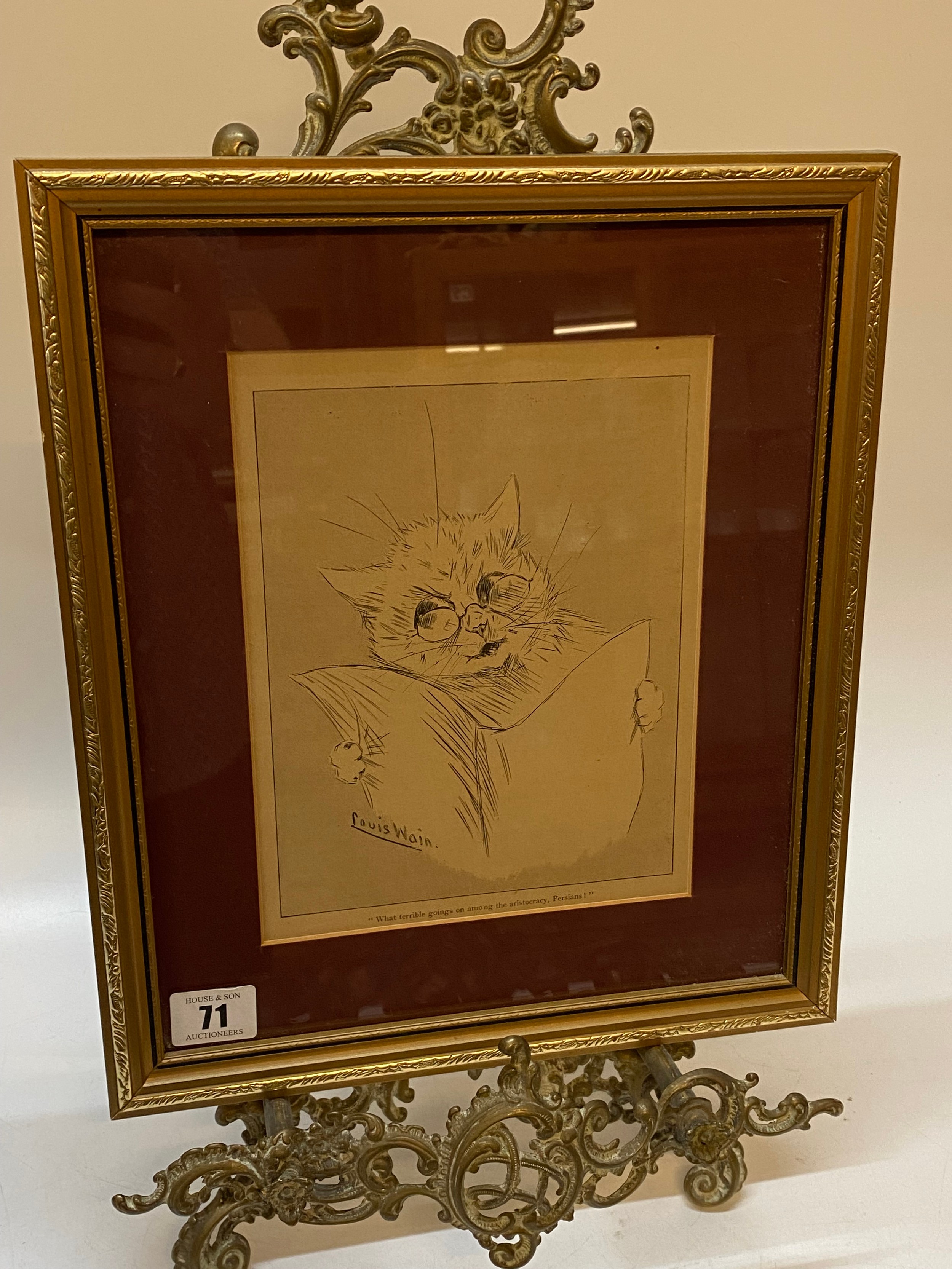 A black and white print after Louis Wain entitled 'What Terrible Goings On Amongst The Aristocracy Persian!', framed and glazed - 8 3/4in. x 6 1/2in.