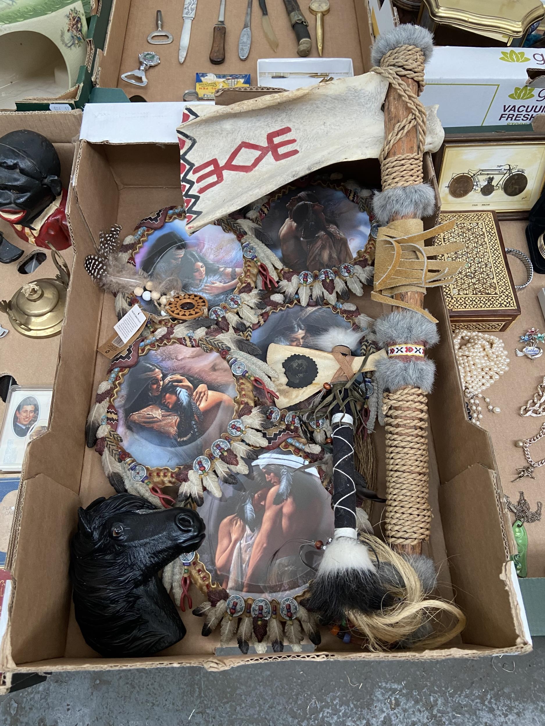 Box containing Native American collector's plates and artefacts