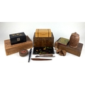 An assortment of assortment of collectable boxes to include a burrwood veneered box and a small Japanese lacquered box