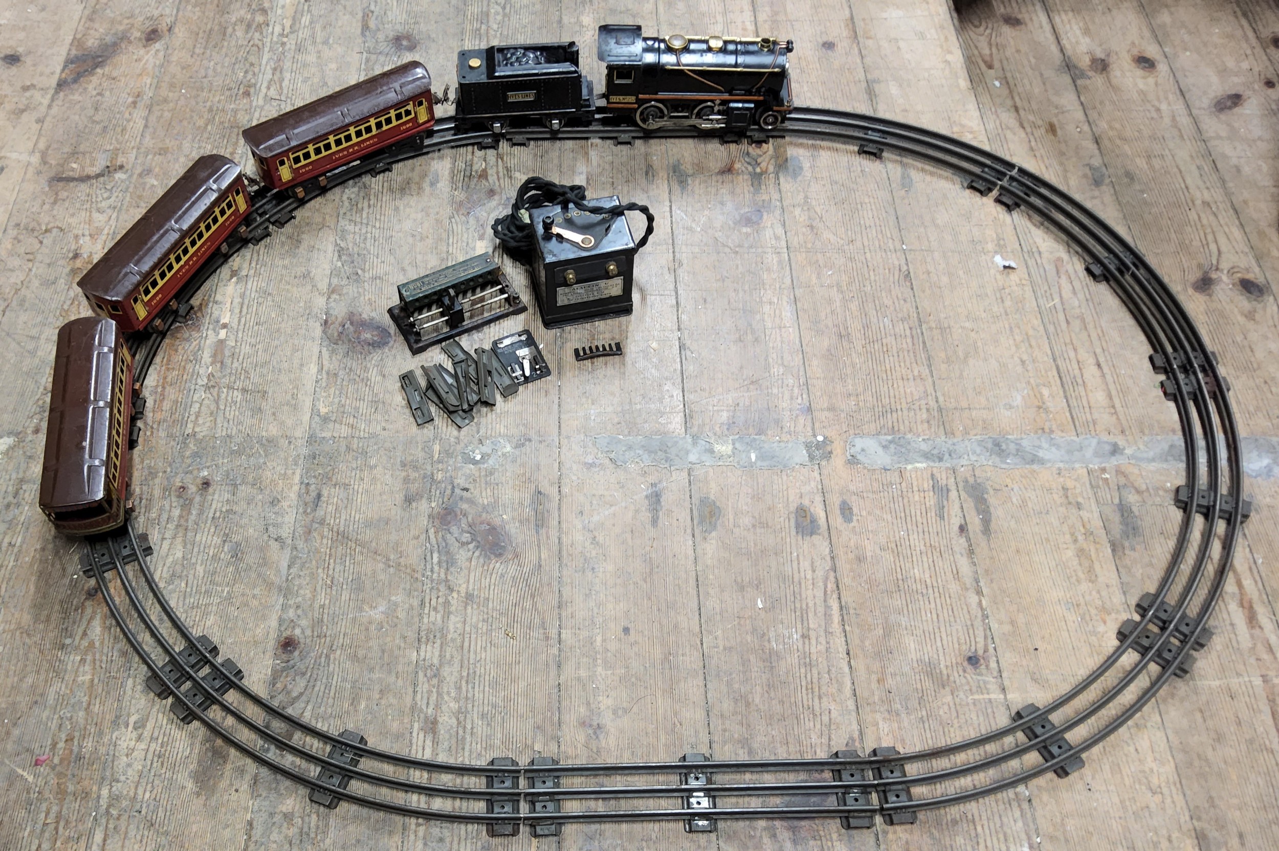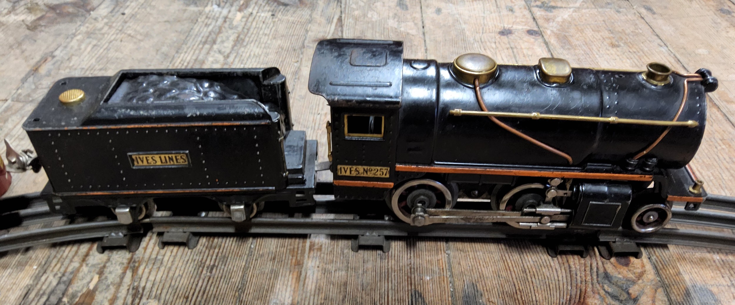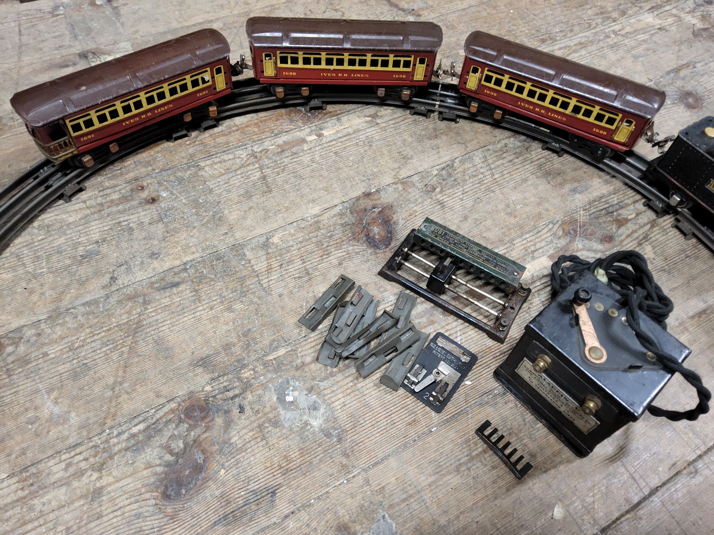 Lionel Ives pre-war O gauge transition 257 2-4-0 steam locomotive and 257T tender, two Pullman coaches no.1690 & an Observation coach no.1691, Aladdin transformer and original No.81 Controlling Rheostat, complete with three rail track etc.