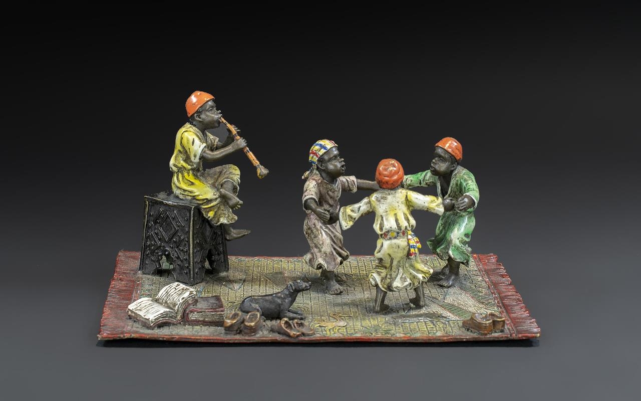 Large Austrian Type Cold Painted Bronze Group of Arab Dancing on a Persian Carpet, with a dog looking on; stamped Austria B, 8 inches (20cms) wide x 6 inches (15cms) deep x 4 inches (10cms) high