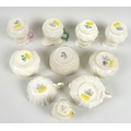 A collection of Belleek jugs and sugar bowls, comprising a Toy Shell creamer jug with yellow lustre, 7cm high, with second black mark to the base (1891-1926), a Limpet creamer jug, second black mark to the base, a Lily creamer jug with green handle and sugar bowl, second black mark to the base, a Low Lily tea cup with green detail, 4.5cm high, second black mark to the base, and a variety of Ribbon design milk jugs and sugar bowls with third green and second and third black marks to the base. (10)