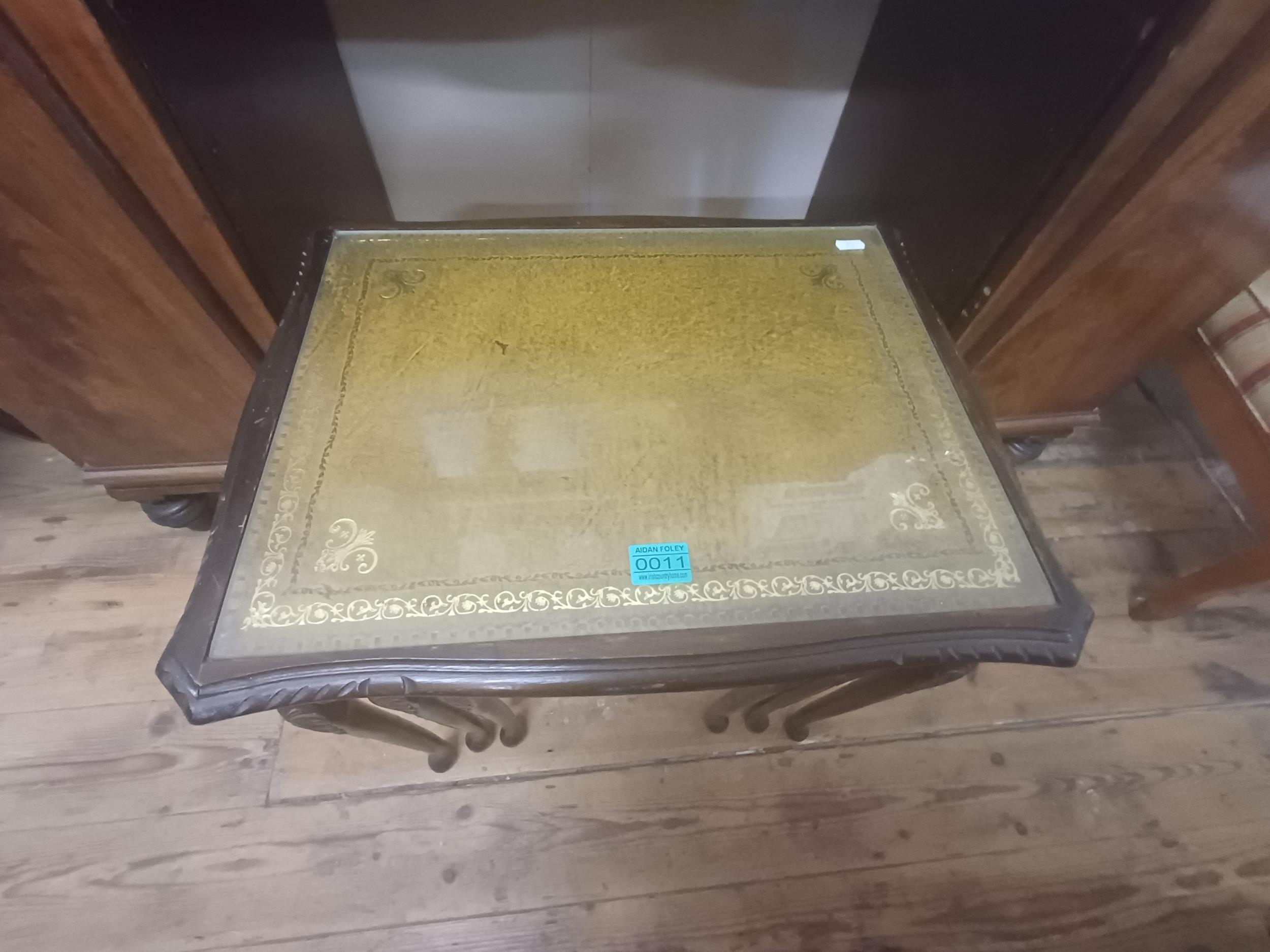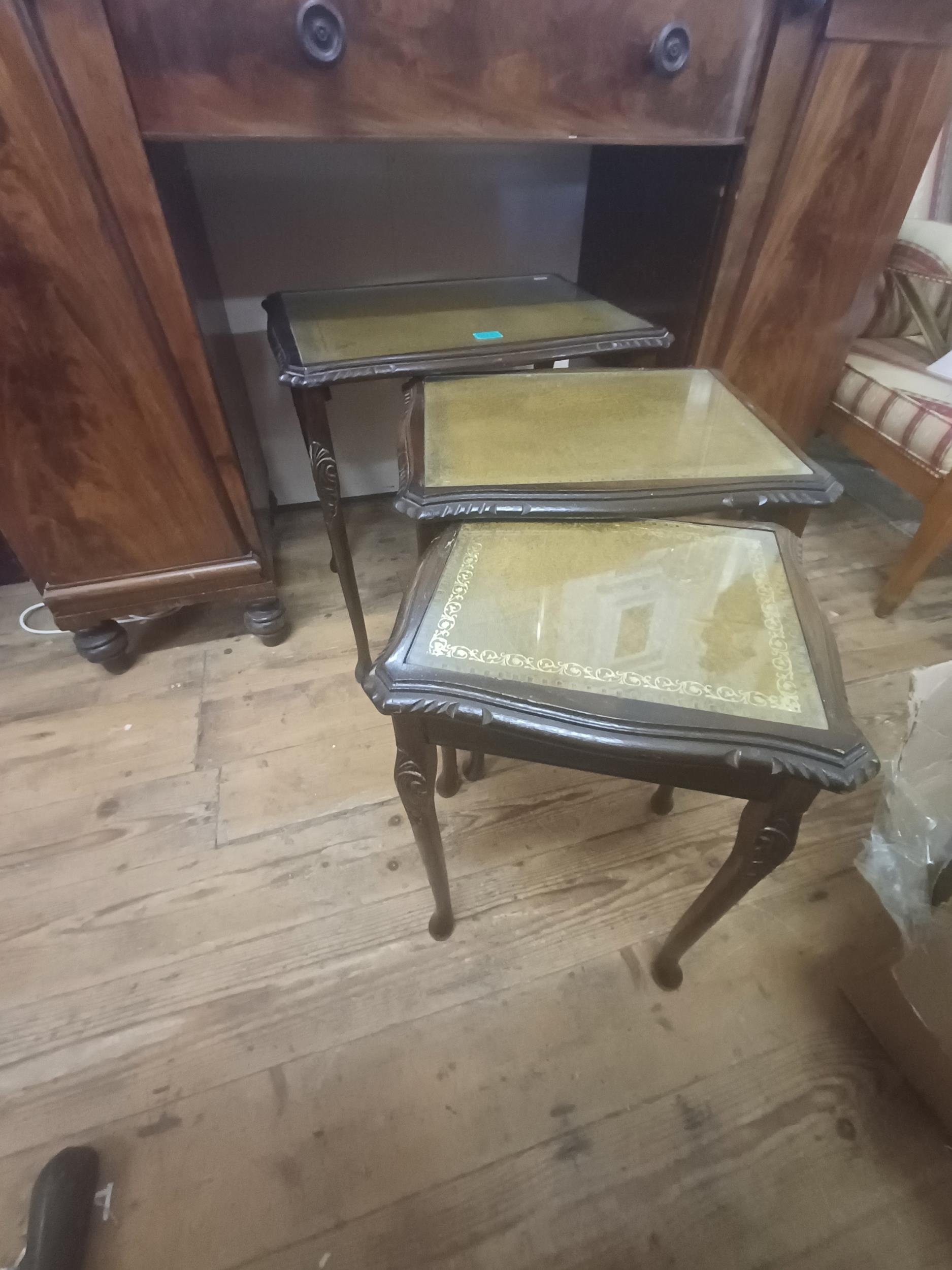Nest of 3 Mahogany Occasional Tables with Gilt Decorated Tooled Leather Tops