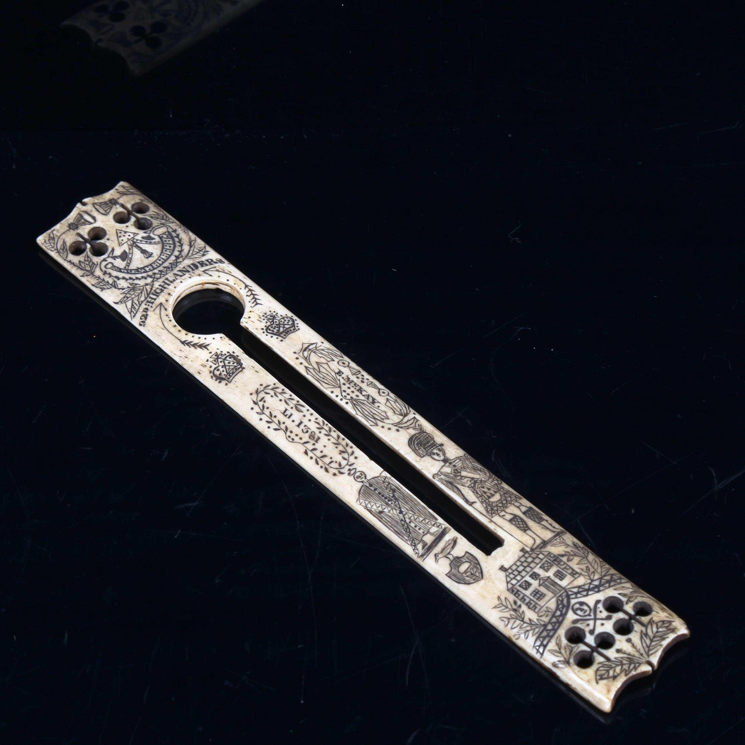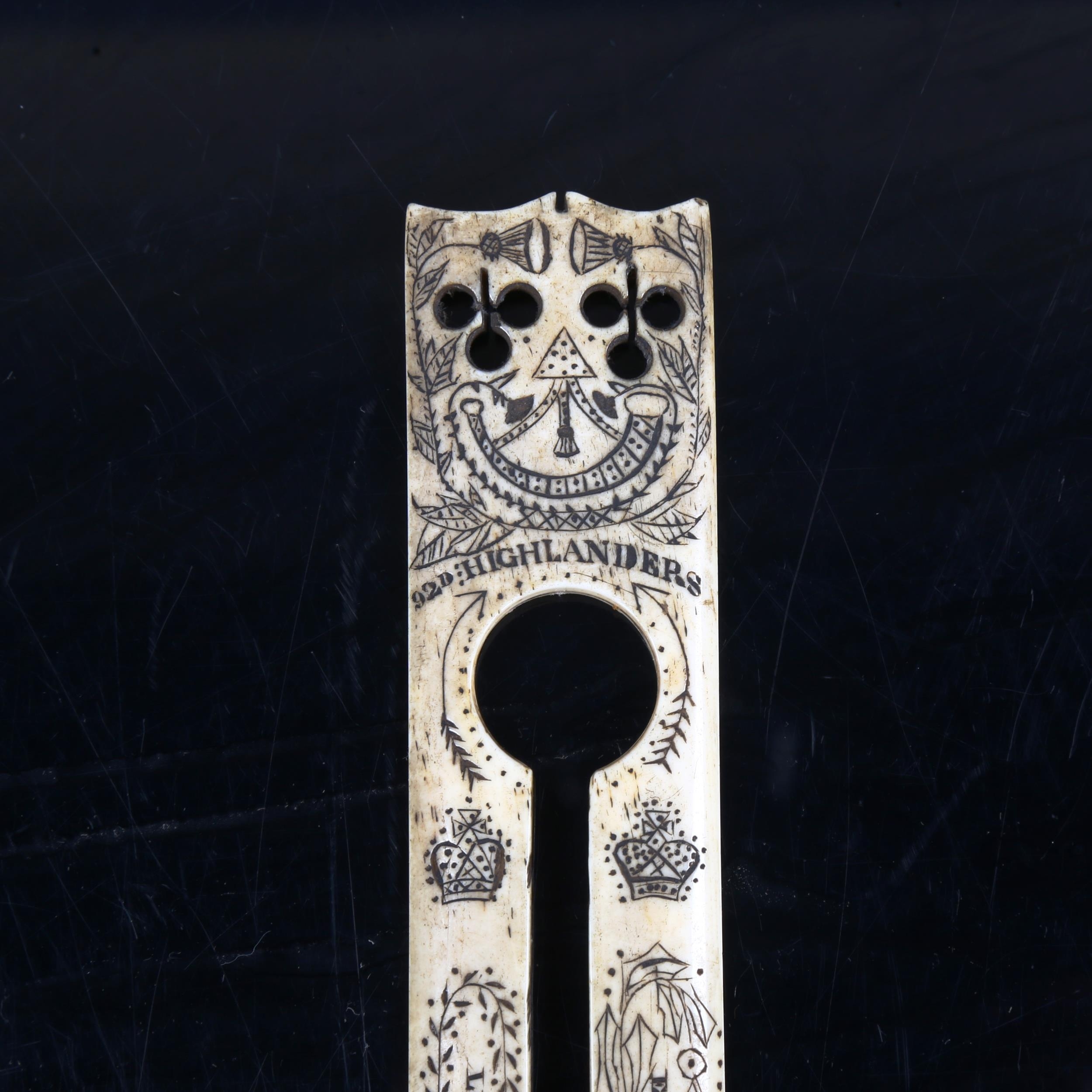 A 19th century Scrimshaw bone button polisher, Indian Mutiny Period circa 1857, engraved Edward Mckay, 92nd Highlanders, length 20.5cm