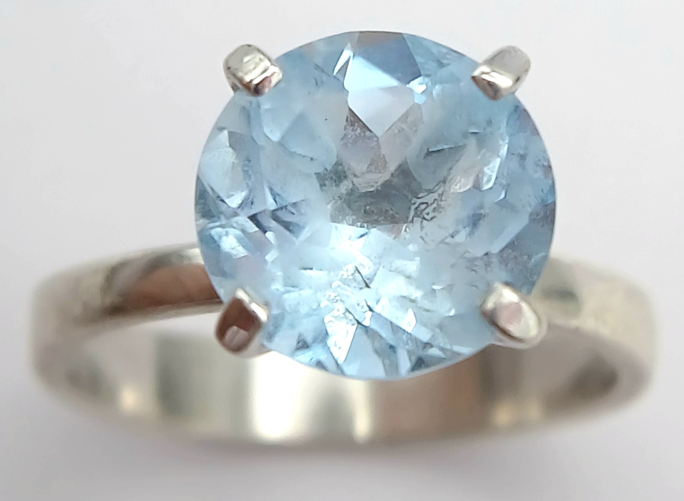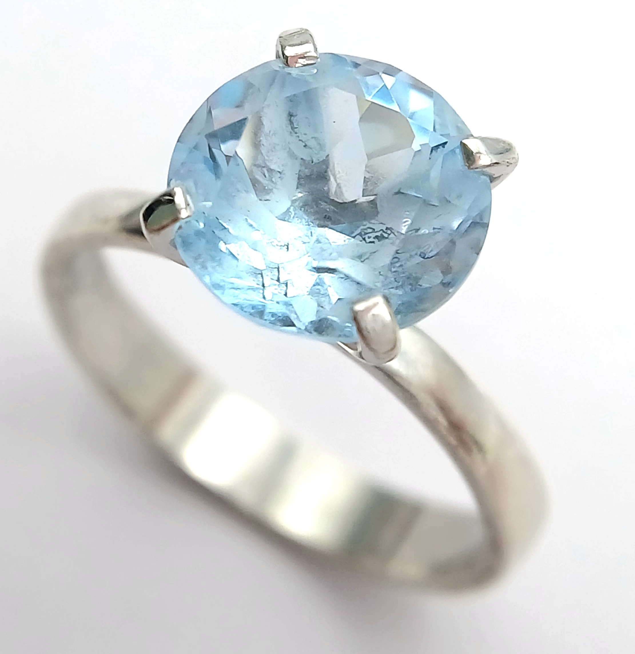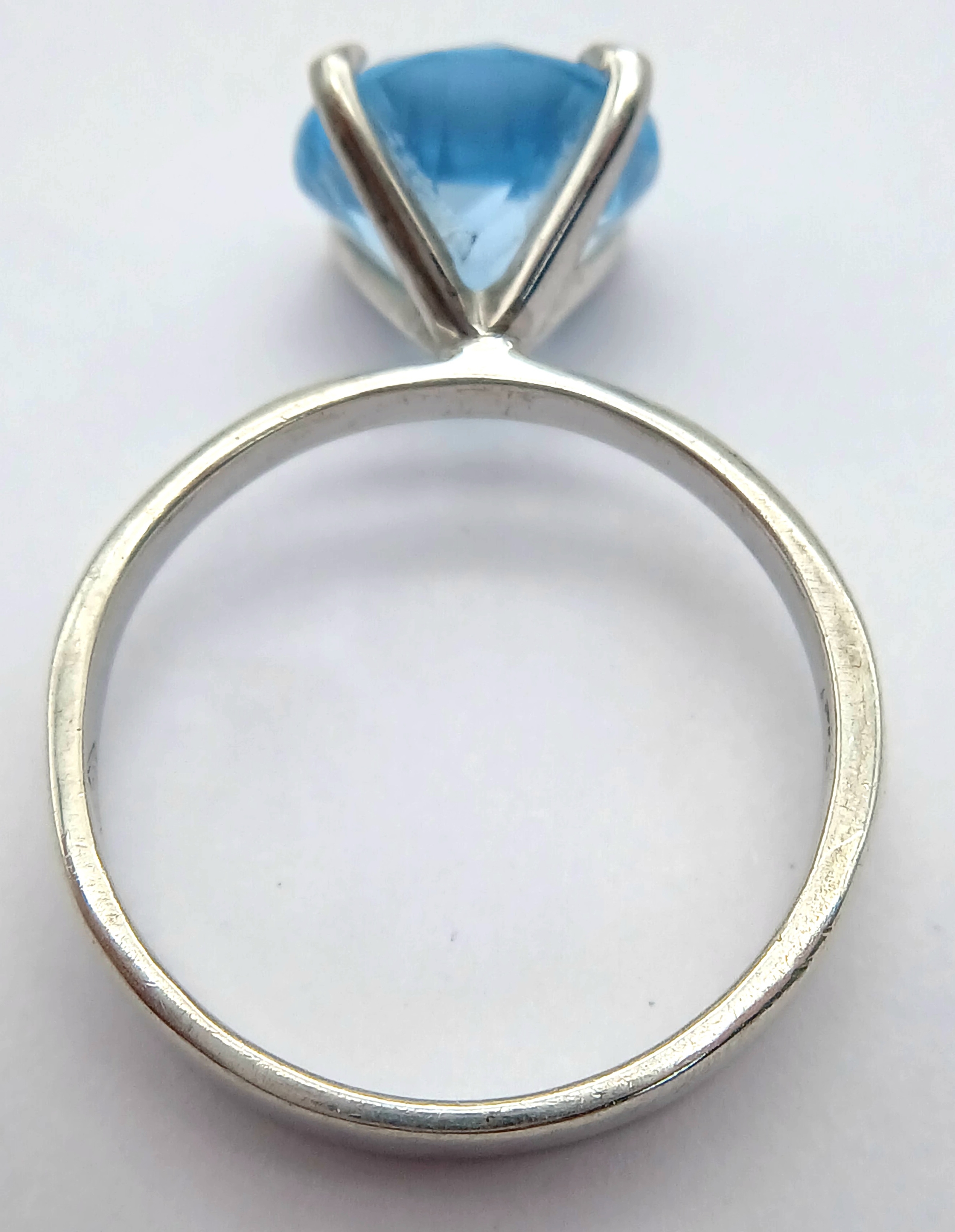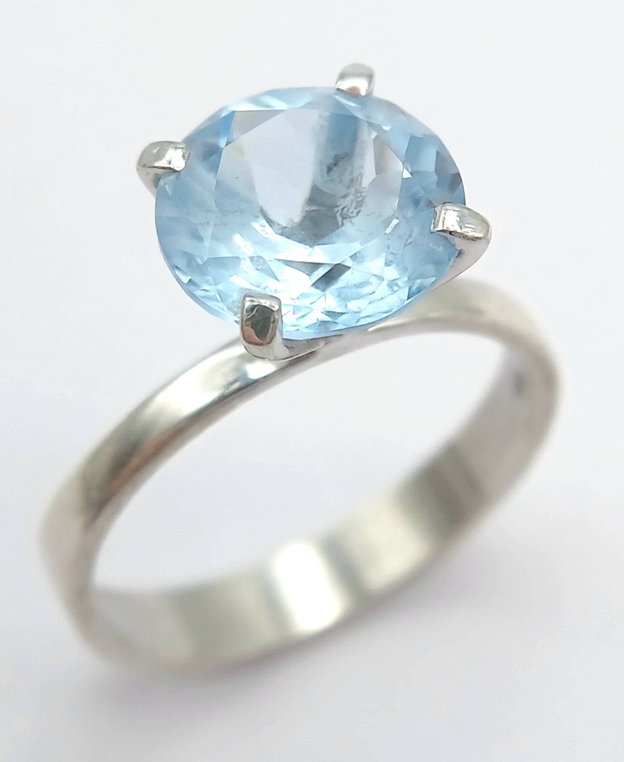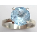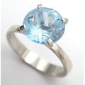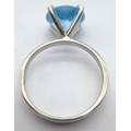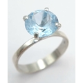 A Stylish Sterling Silver Tiffany Style Mounted Blue Topaz Solitaire Ring Size Q. The Ring is set with a large 1cm Round Cut Blue Topaz, approximately 4 carat. The Ring has a gross weight of 3.38 Grams