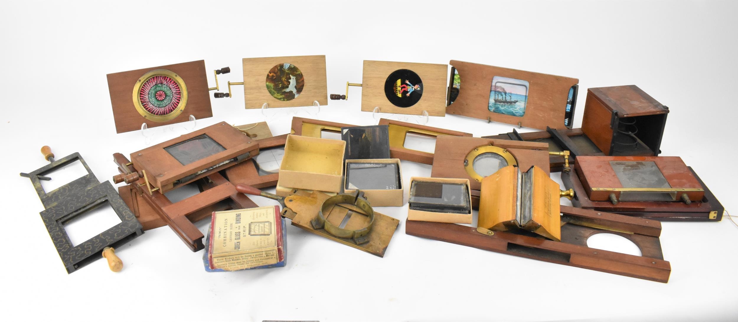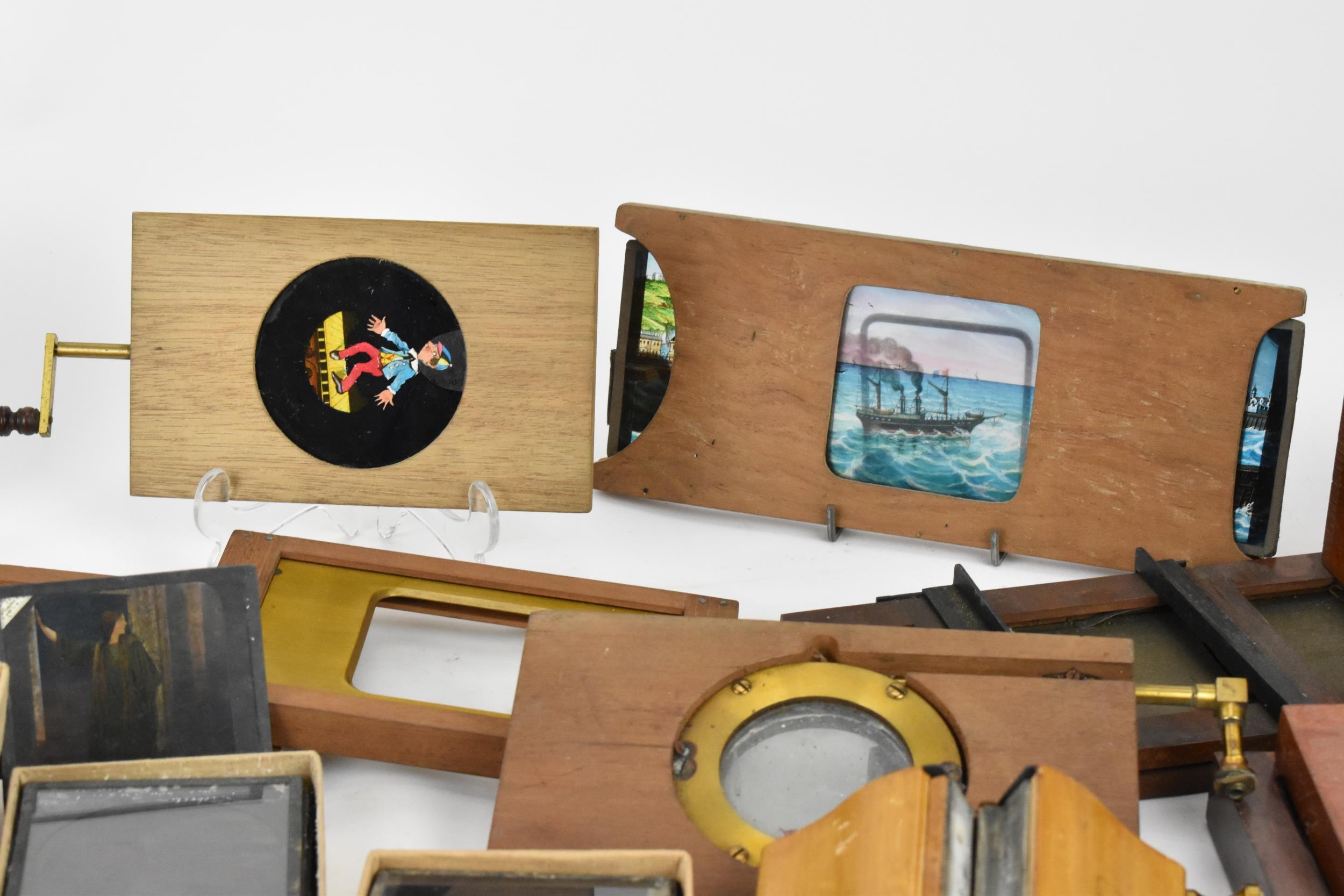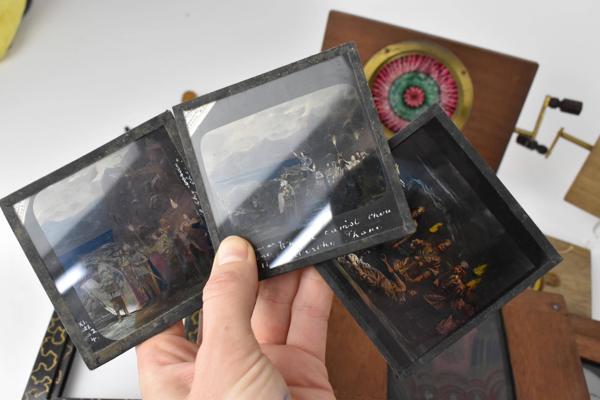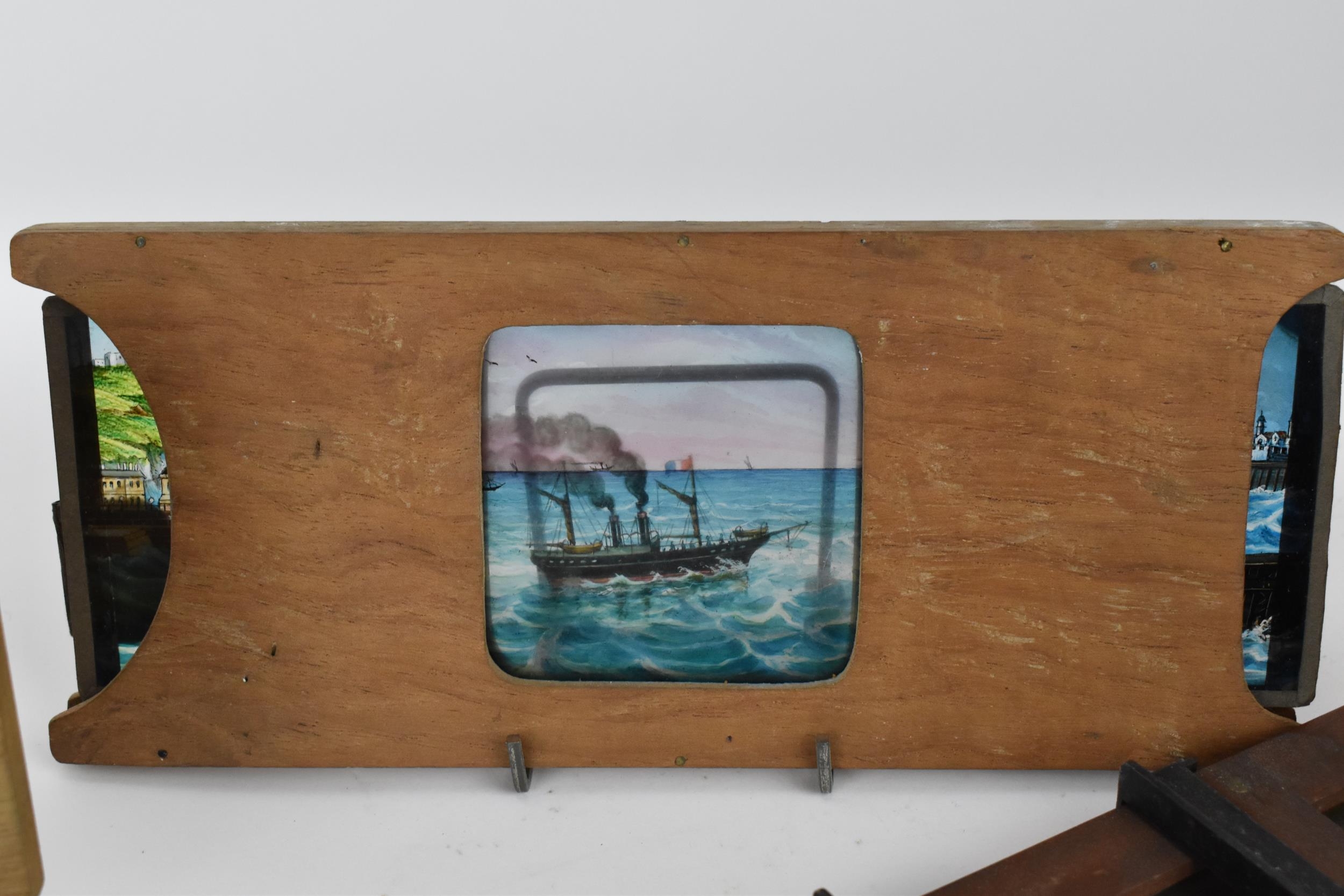 A collection of Victorian mahogany-framed magic lantern slides, to include five with winder handle, another with two plates depicting a French ship moving at sea, together with mahogany lantern frames and equipment, such as a lantern slide binding clamp, combination cover glasses, and pictorial slides with polychrome scenes from a play Location:BWR