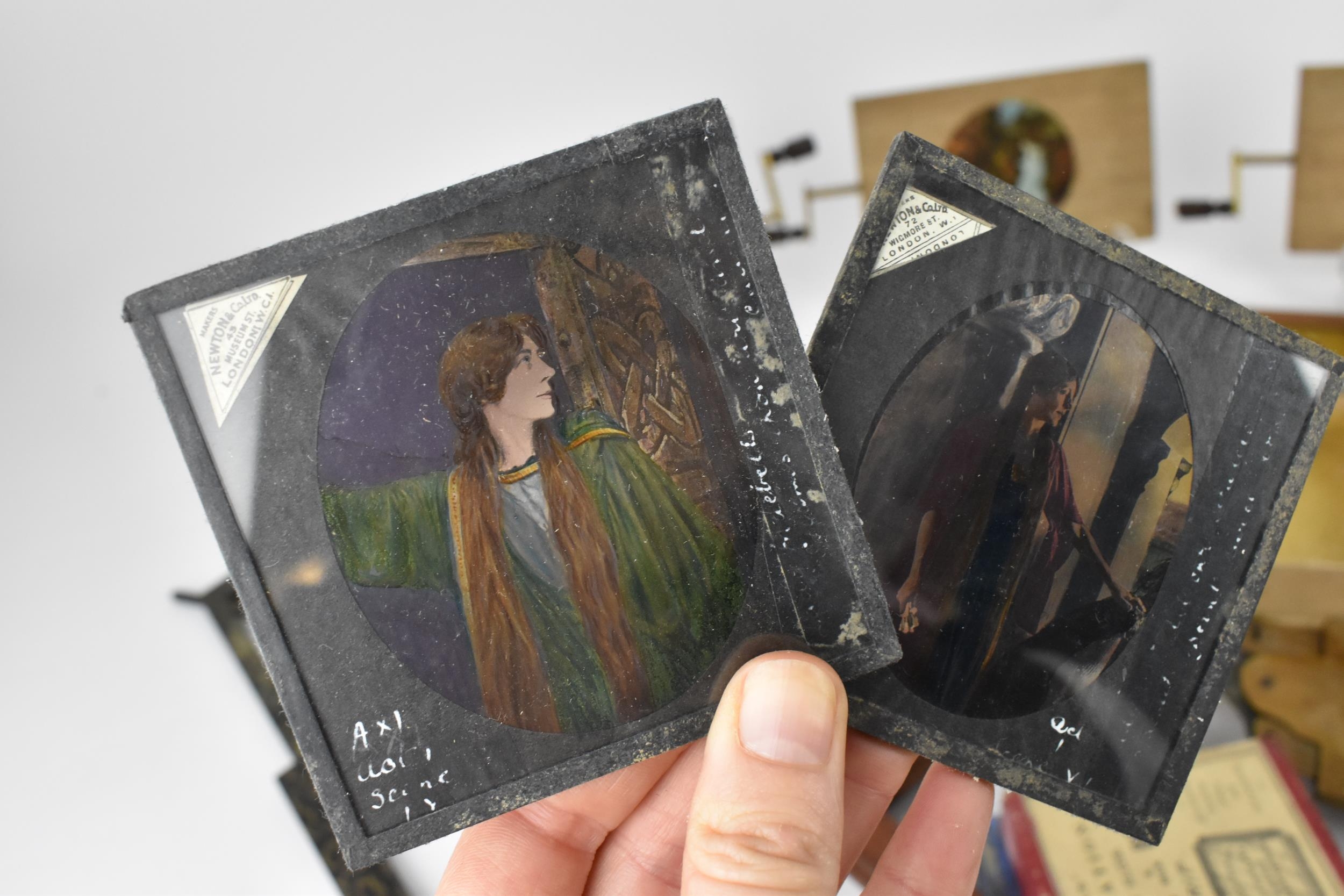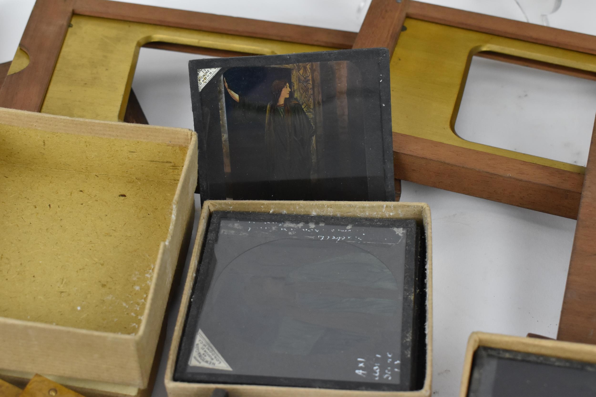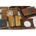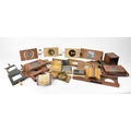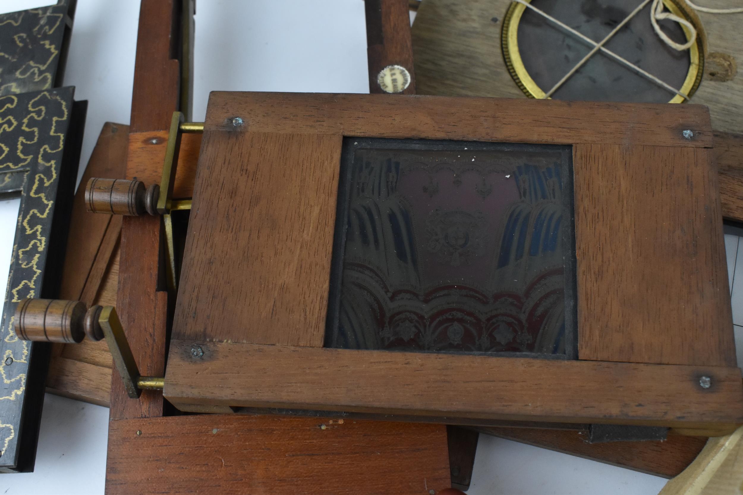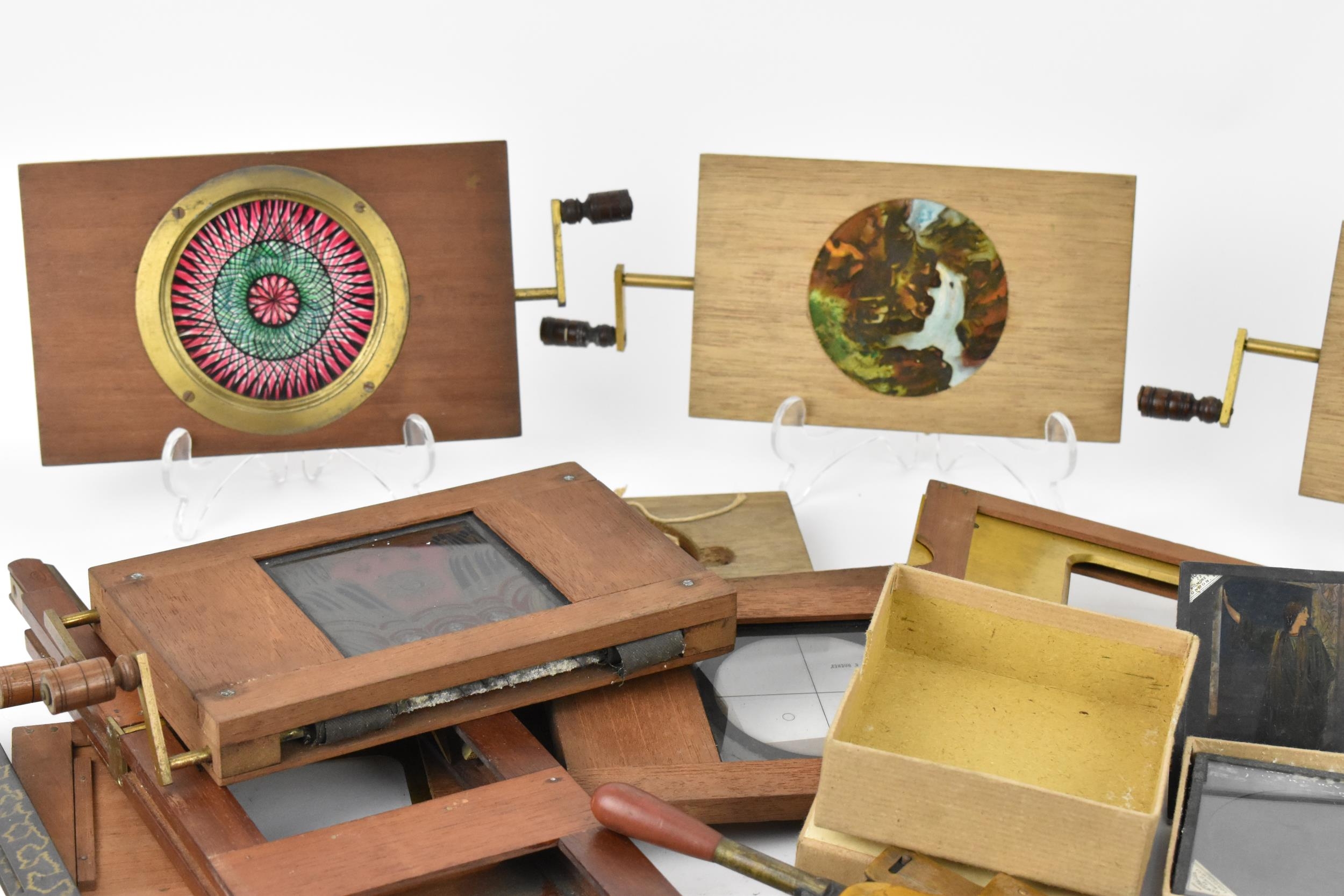 A collection of Victorian mahogany-framed magic lantern slides, to include five with winder handle, another with two plates depicting a French ship moving at sea, together with mahogany lantern frames and equipment, such as a lantern slide binding clamp, combination cover glasses, and pictorial slides with polychrome scenes from a play Location:BWR