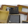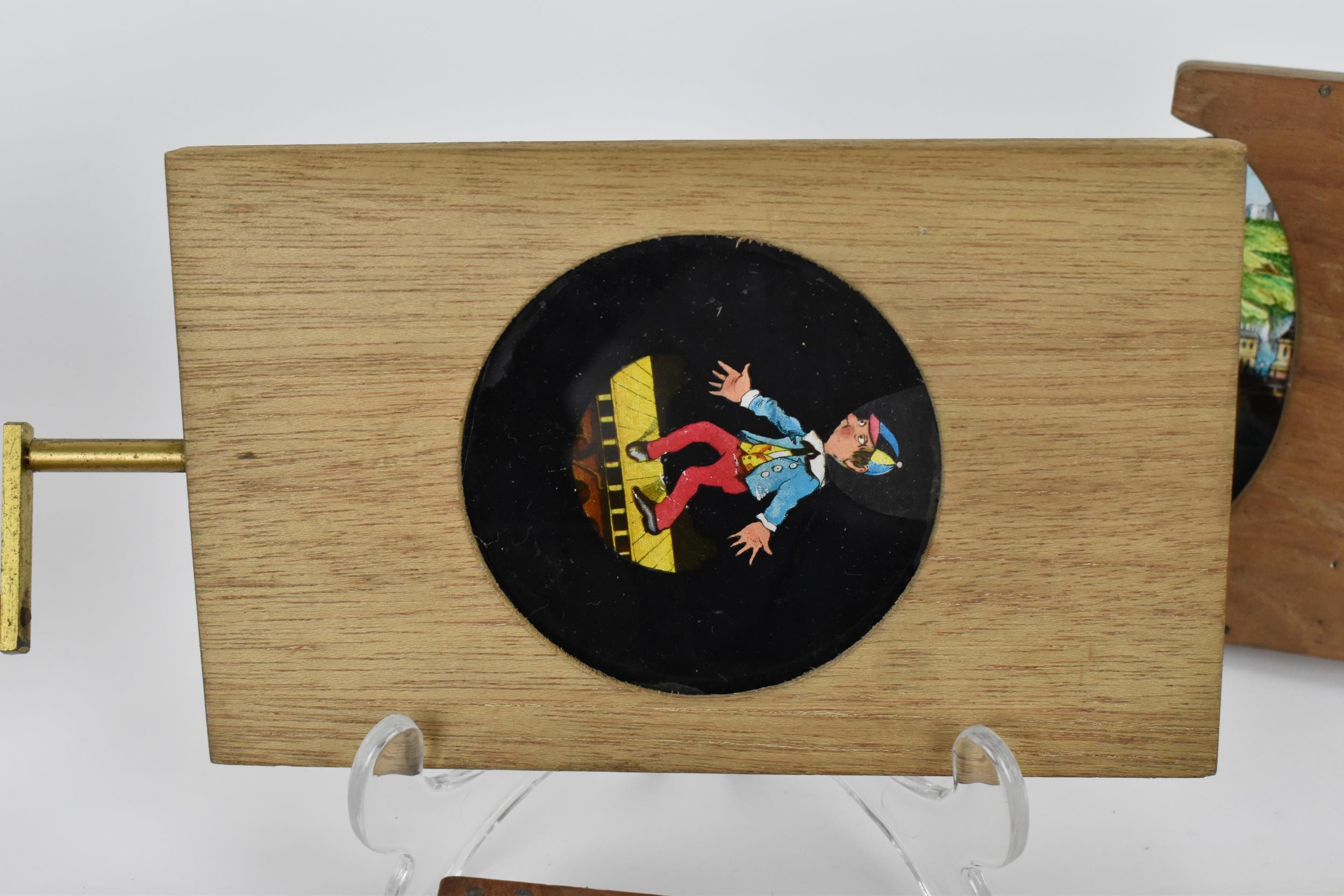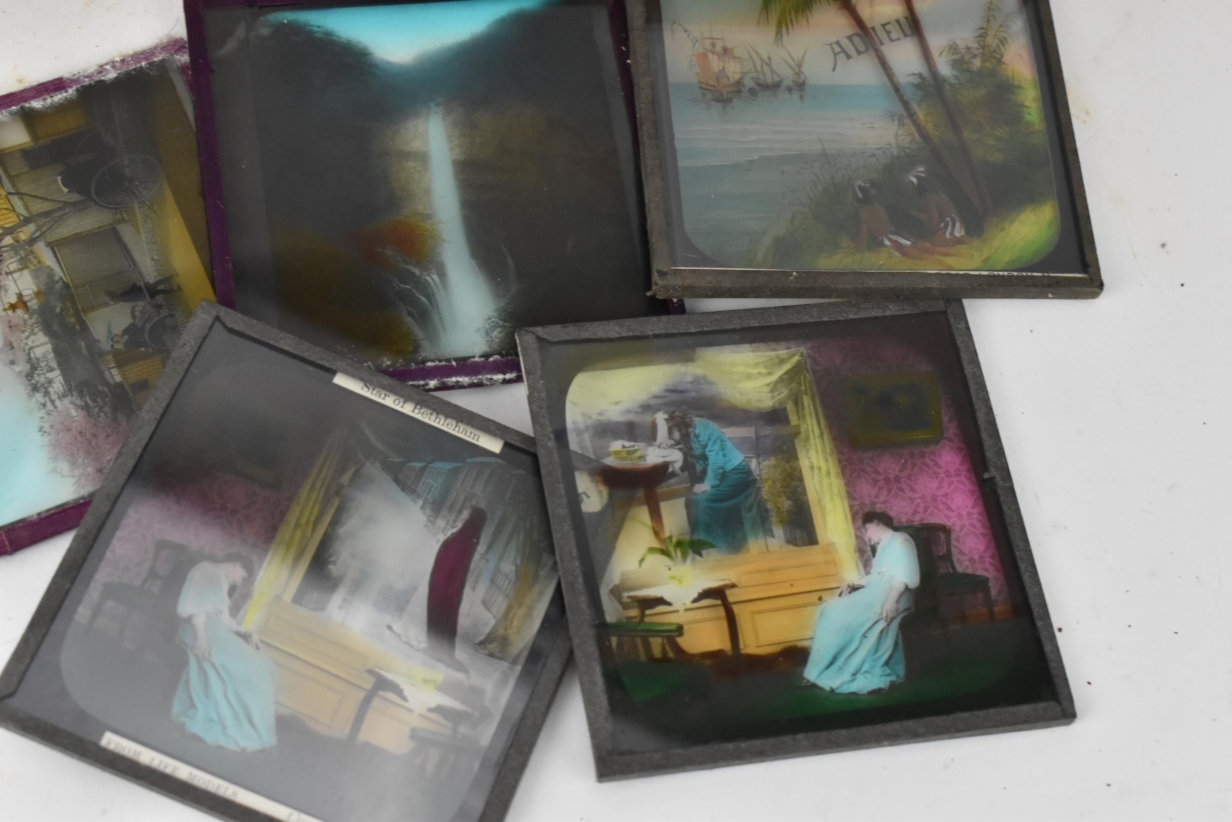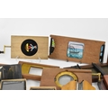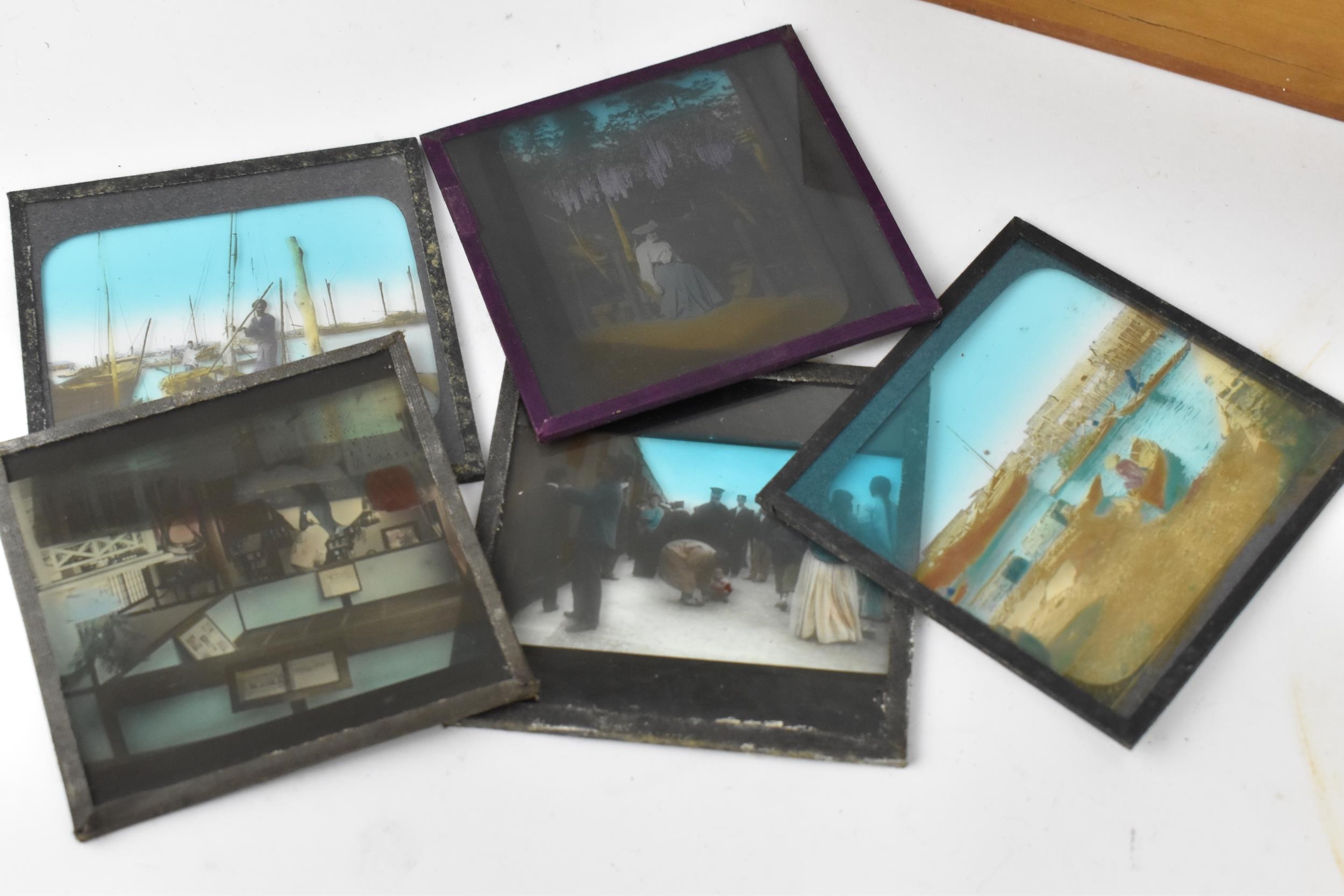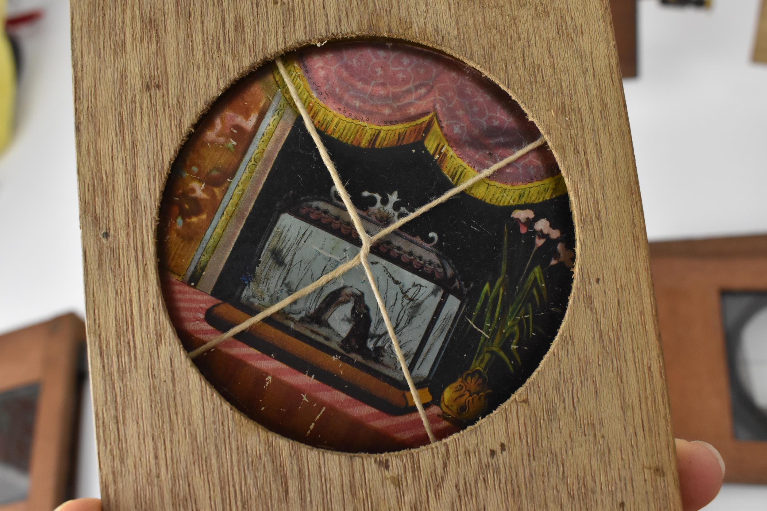 A collection of Victorian mahogany-framed magic lantern slides, to include five with winder handle, another with two plates depicting a French ship moving at sea, together with mahogany lantern frames and equipment, such as a lantern slide binding clamp, combination cover glasses, and pictorial slides with polychrome scenes from a play Location:BWR