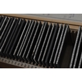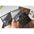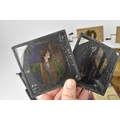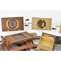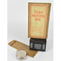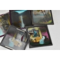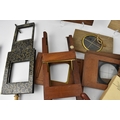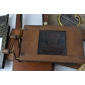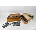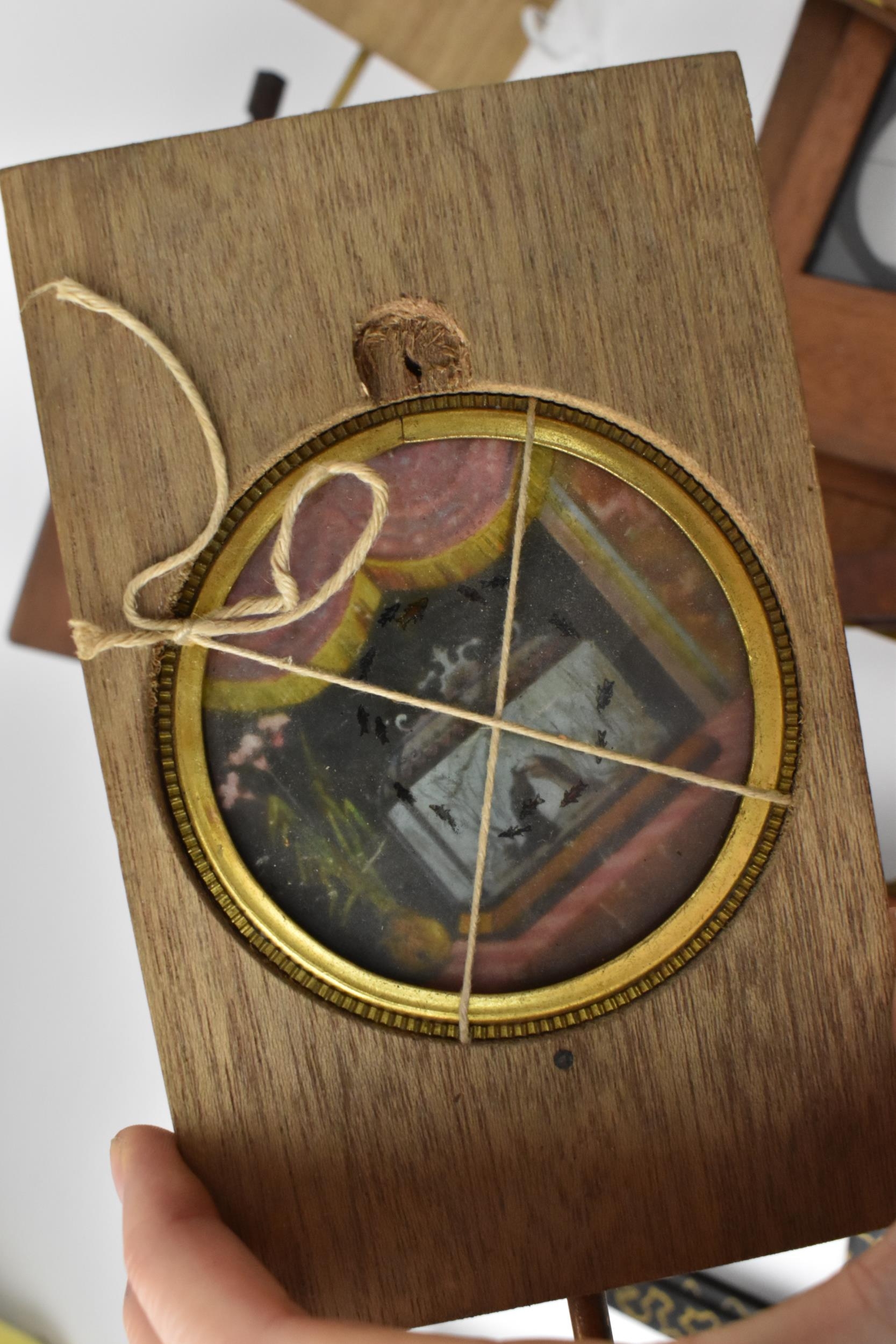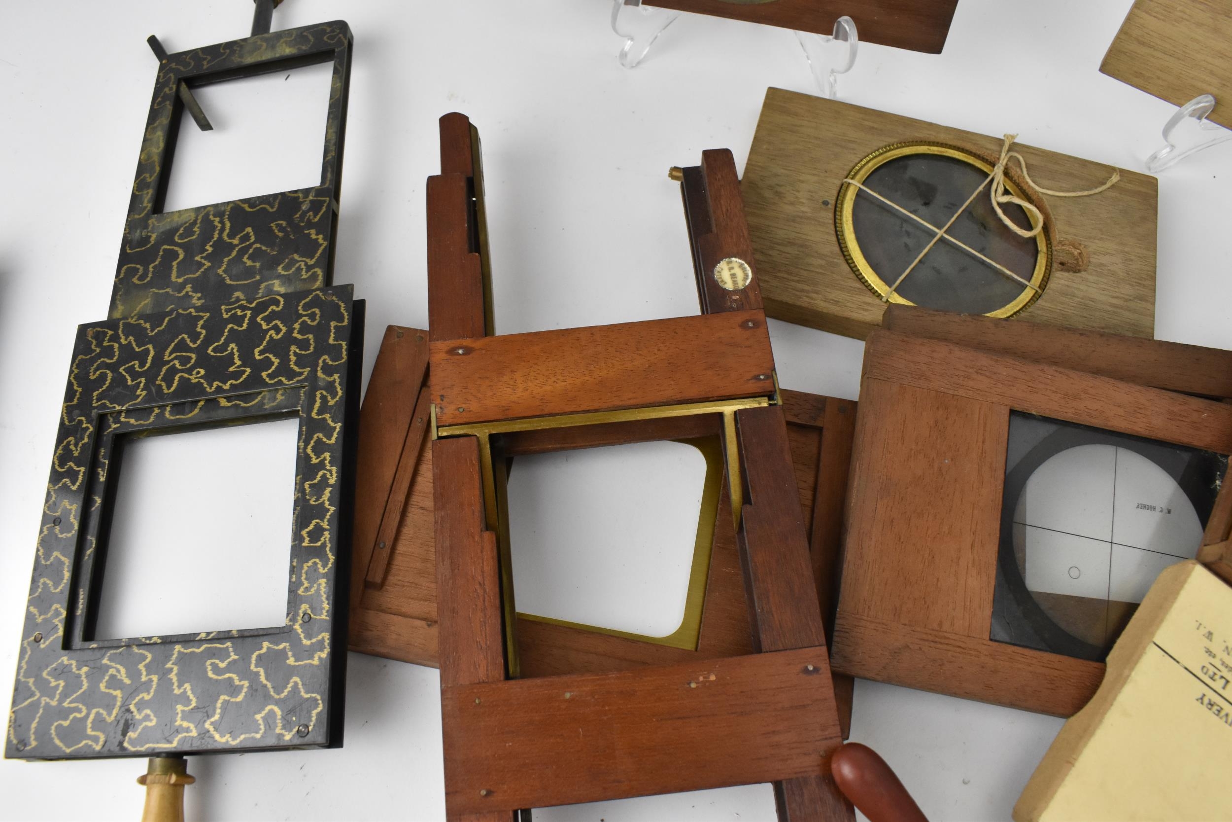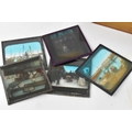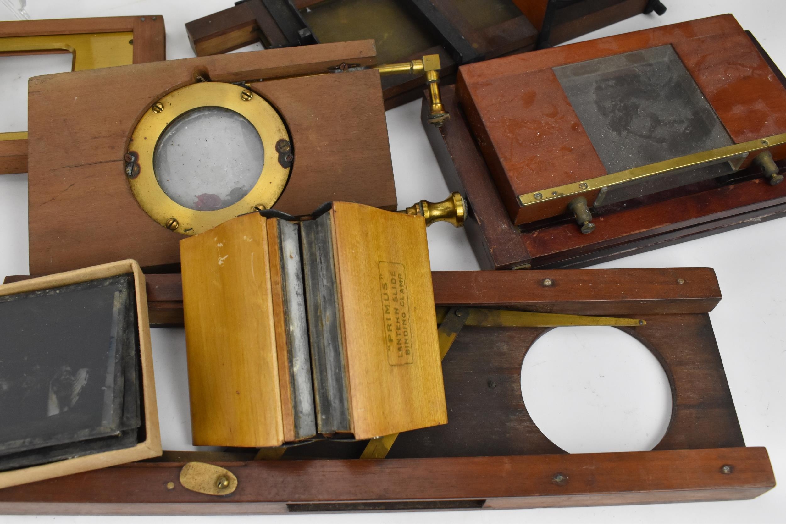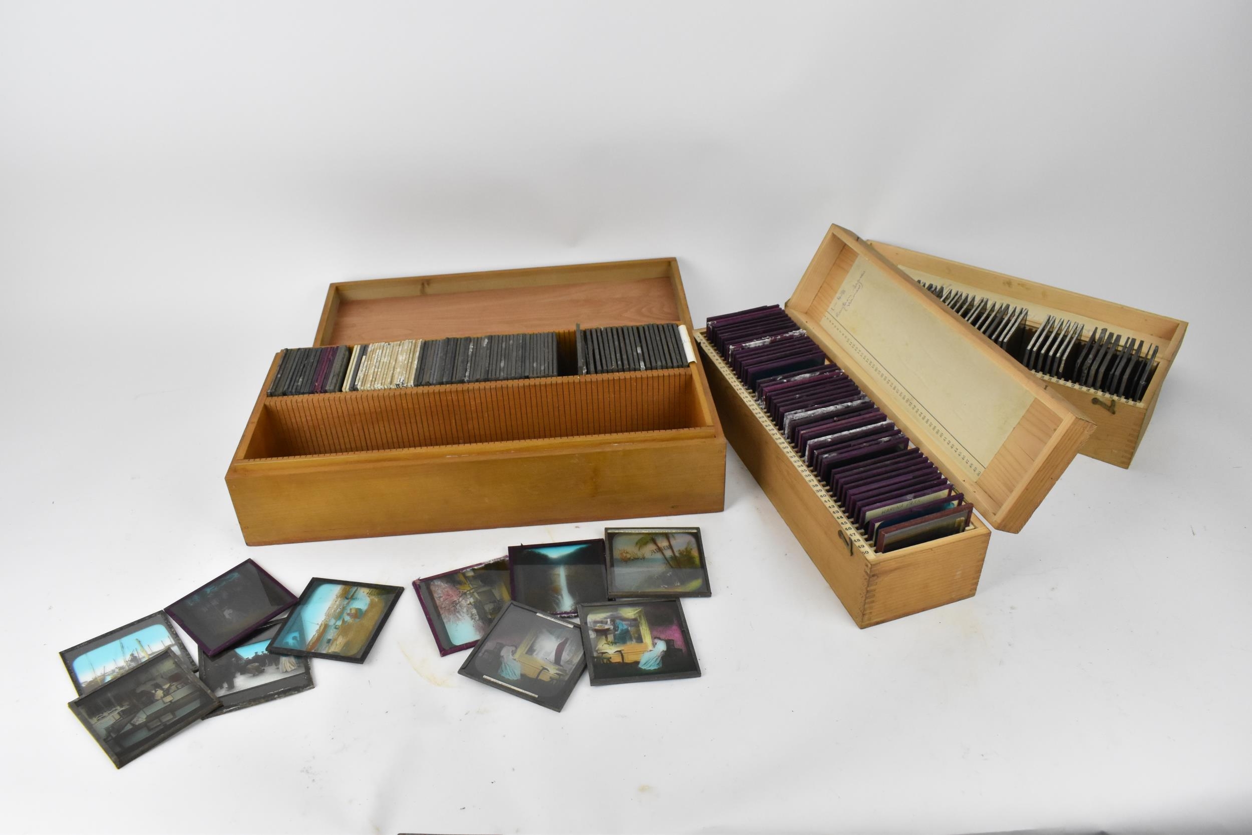A collection of Victorian mahogany-framed magic lantern slides, to include five with winder handle, another with two plates depicting a French ship moving at sea, together with mahogany lantern frames and equipment, such as a lantern slide binding clamp, combination cover glasses, and pictorial slides with polychrome scenes from a play Location:BWR