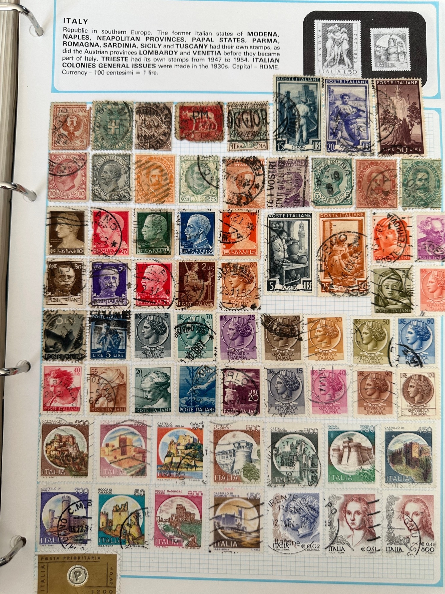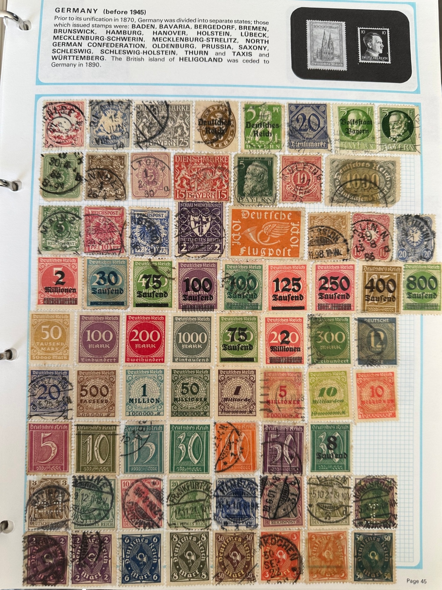 SG WORLDEX stamp album ( incomplete pages - excludes most commonwealth ) with hundreds of stamps from QV, strength in France and Colonies, Germany and States, GB with Regionals, Machins, Channel Islands, Hungary, european countries and USA, lots of other countries less well respresented and many hundreds if not over 1,000 stamps