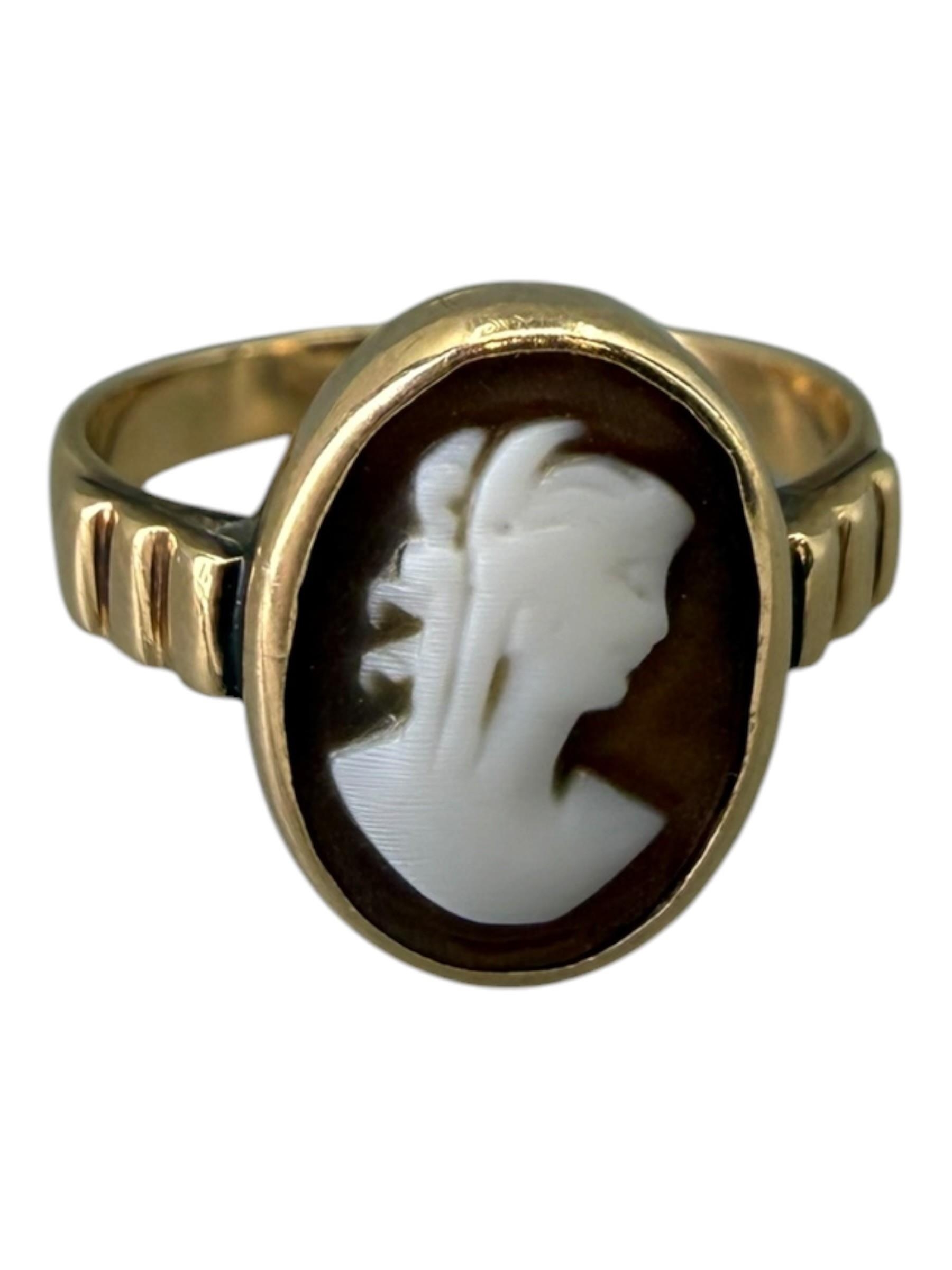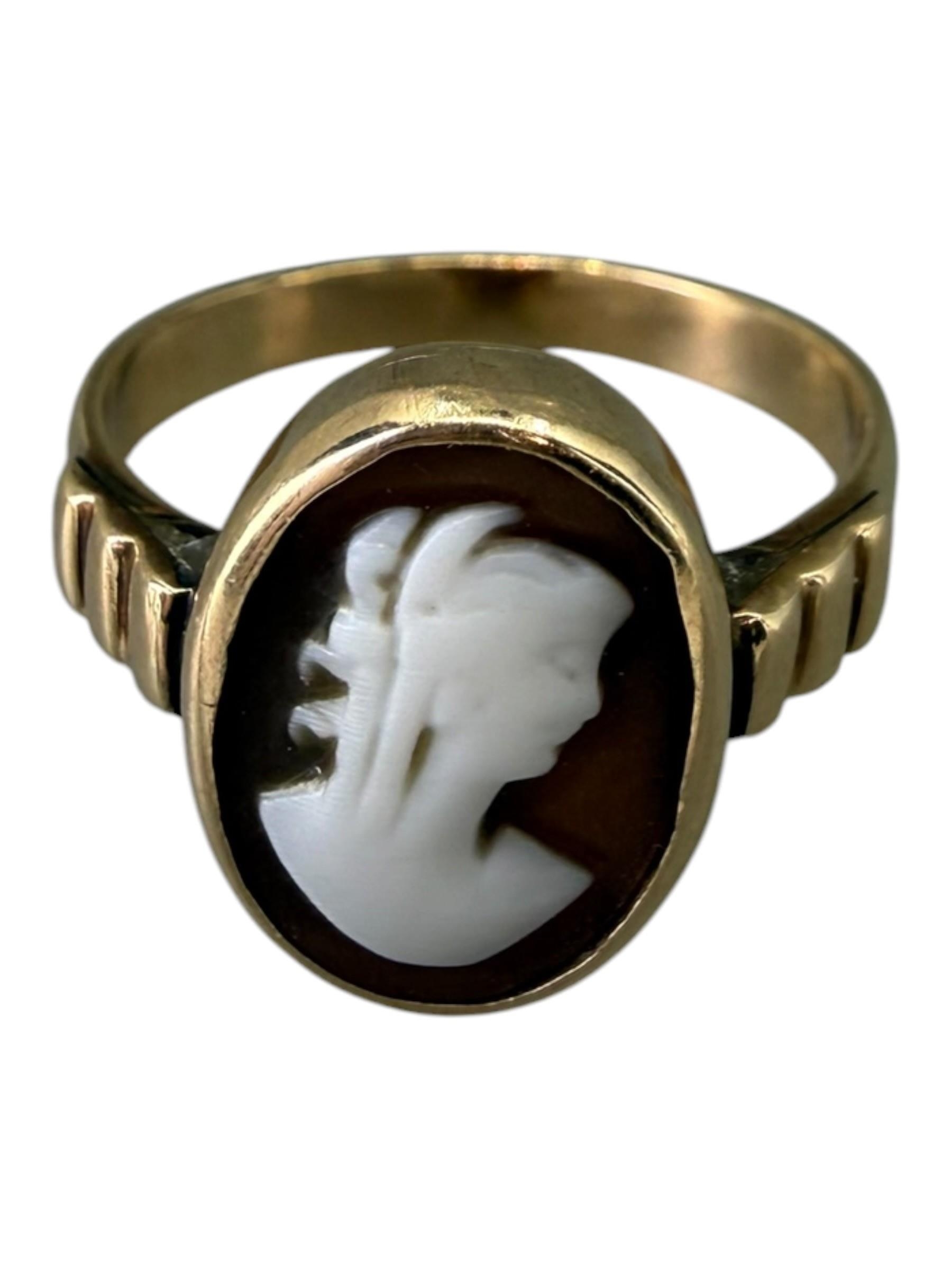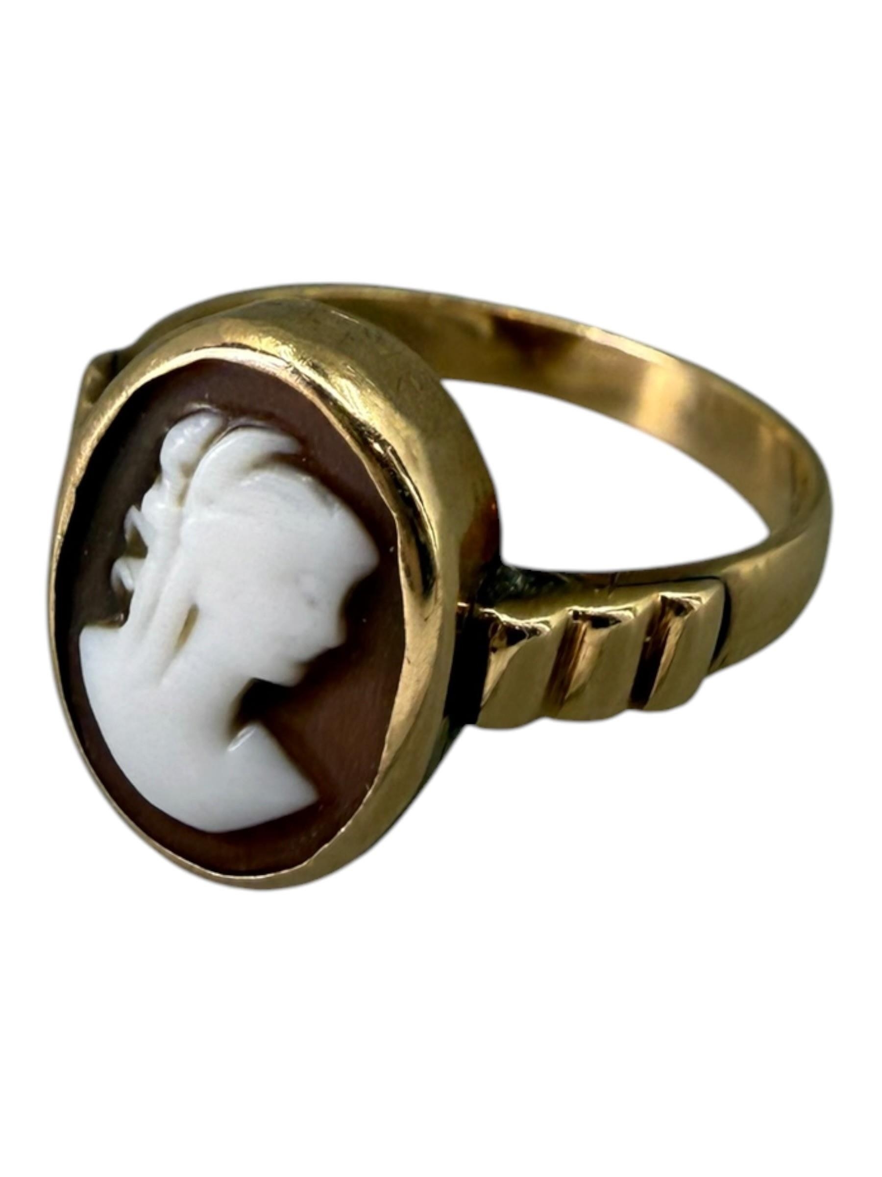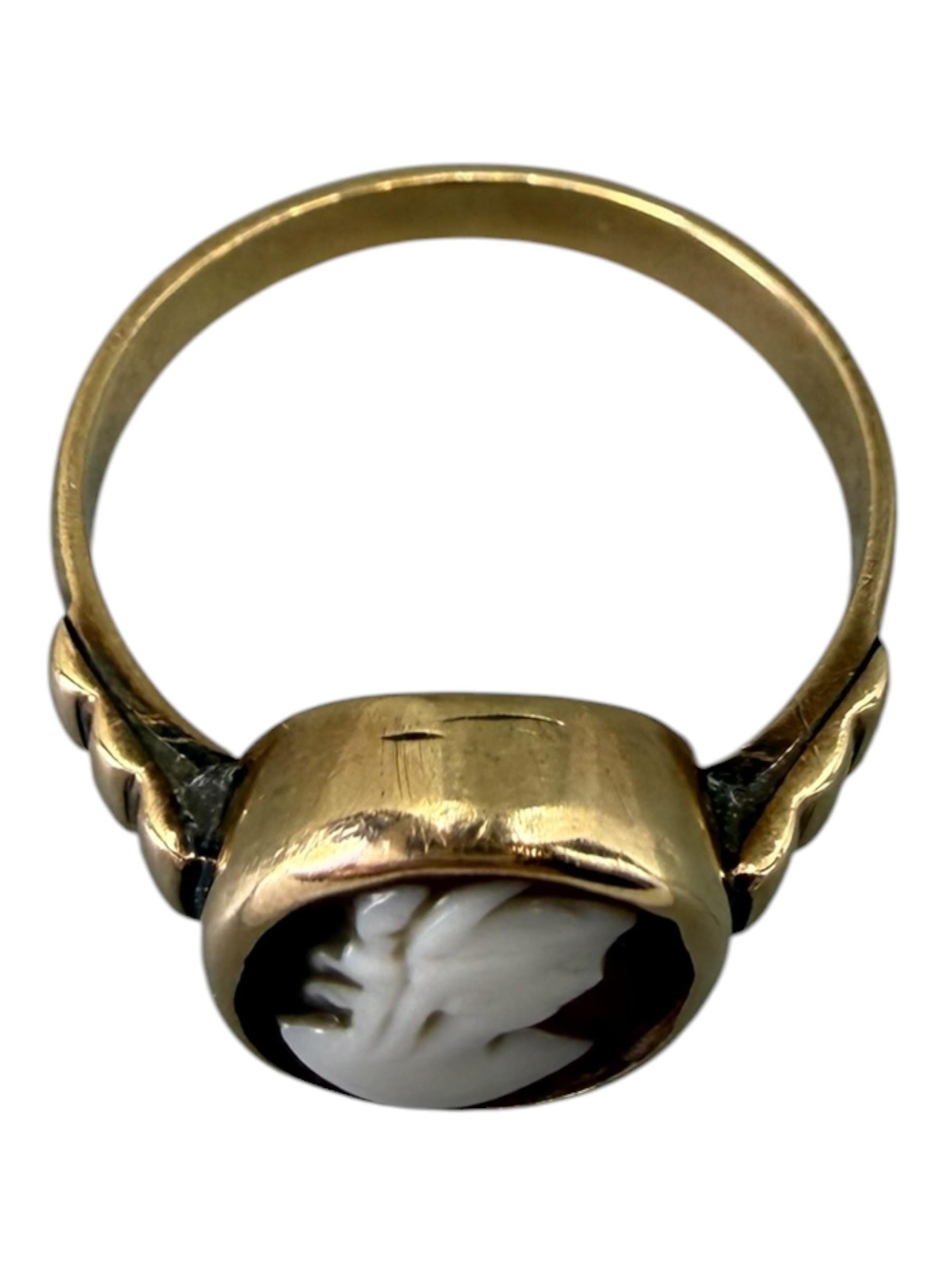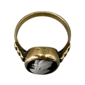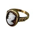 A LATE VICTORIAN 12CT GOLD AND CARVED SHELL CAMEO RING