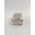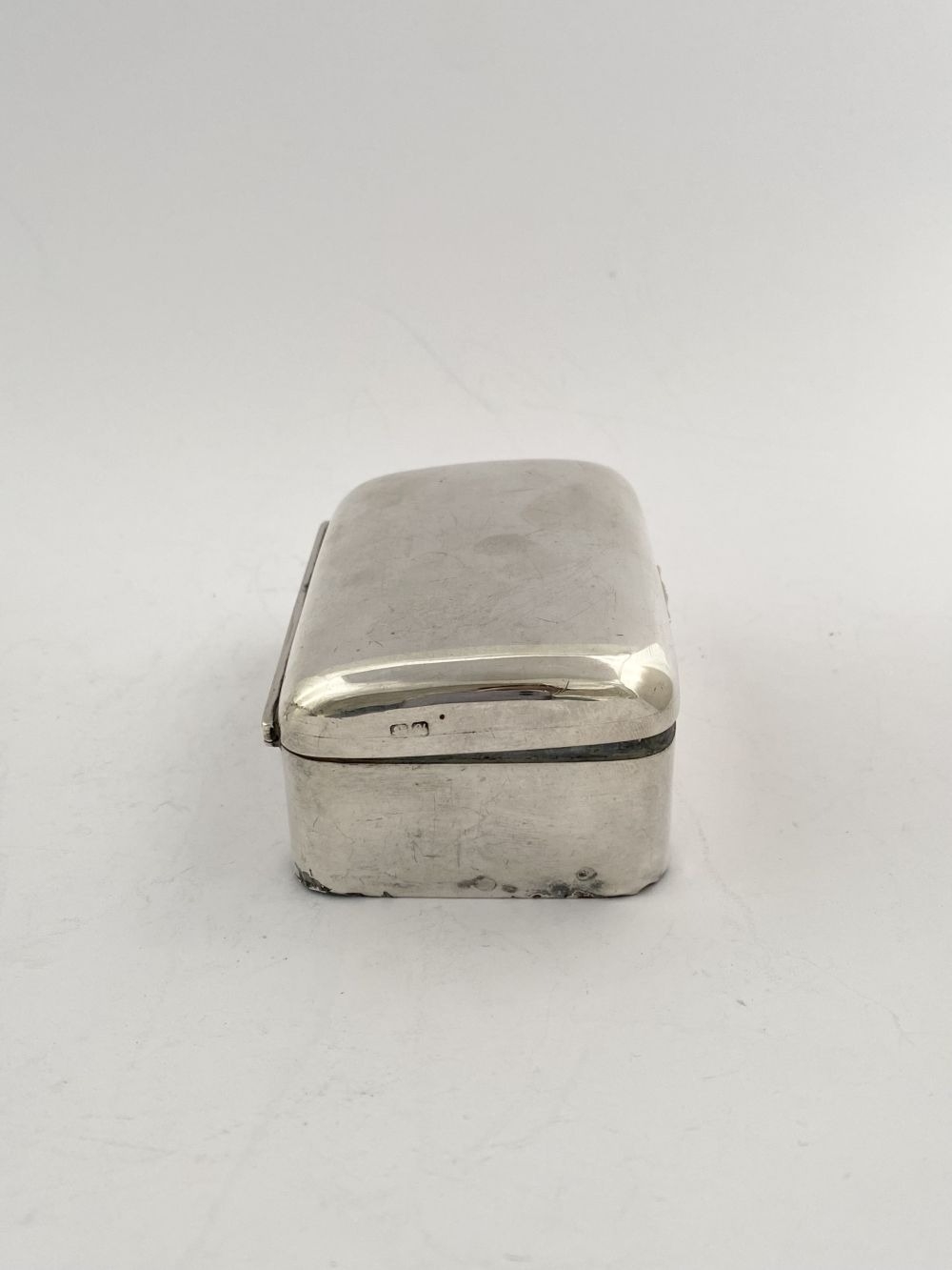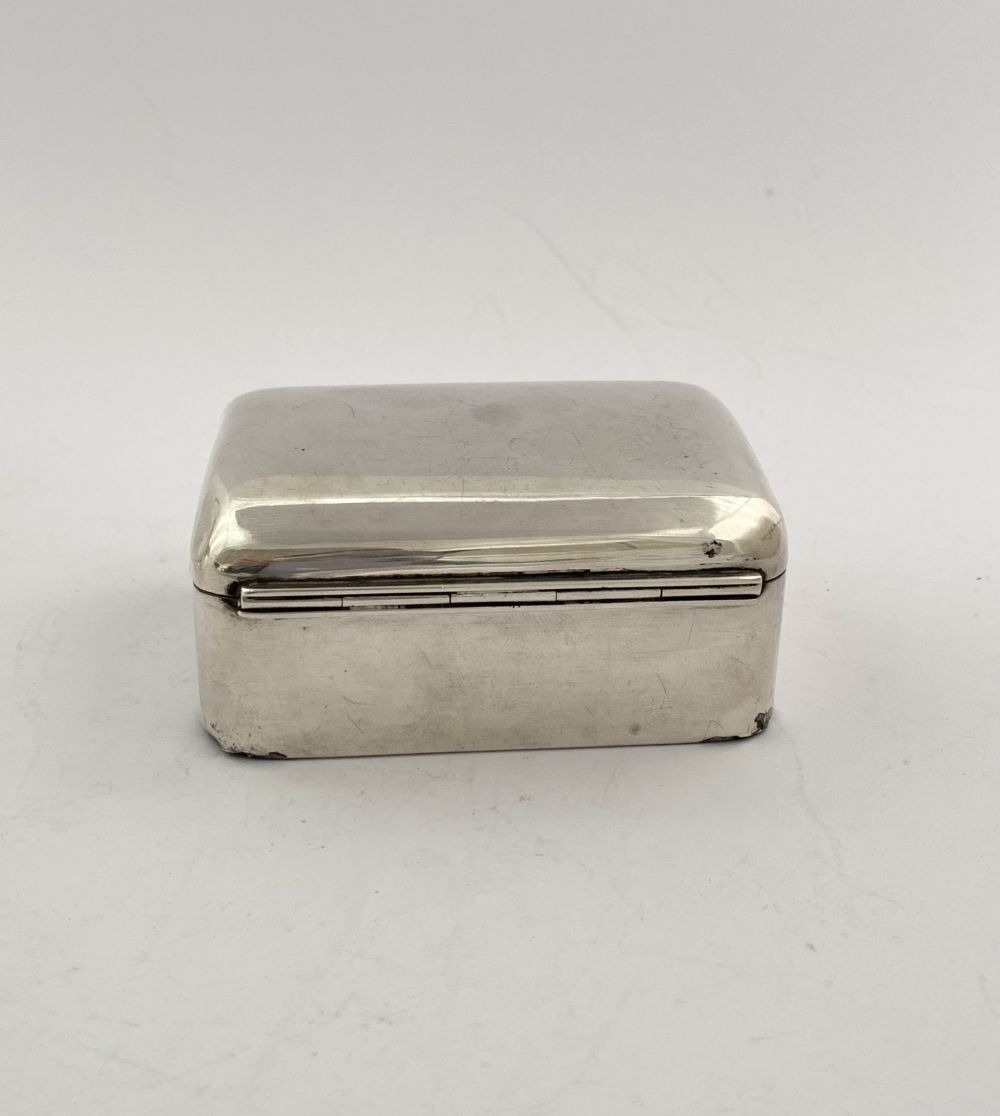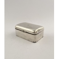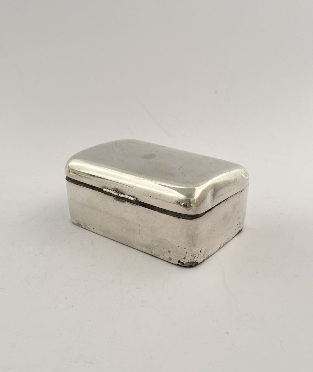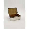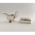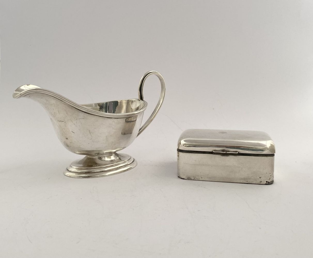 AN ART DECO PERIOD SILVER SNUFF BOX ALONG WITH SILVERPLATED SAUCE BOAT, snuff box hallmarked Chester c.1920, makers mark rubbed, some wear to base as photographed. The sauce boat by William Hutton & Sons Sheffield, dimensions: 16cm wide x 9.5cm high approx.