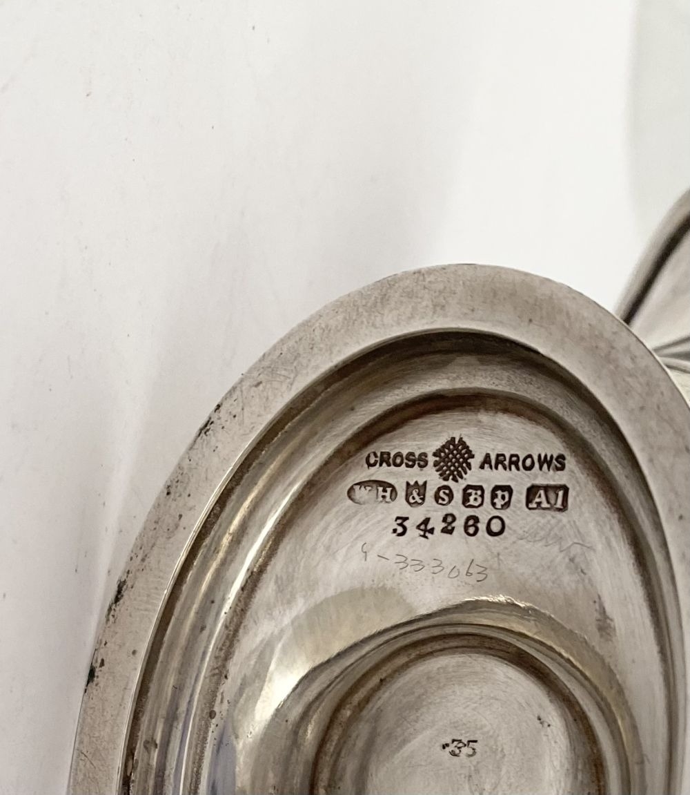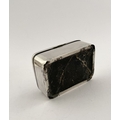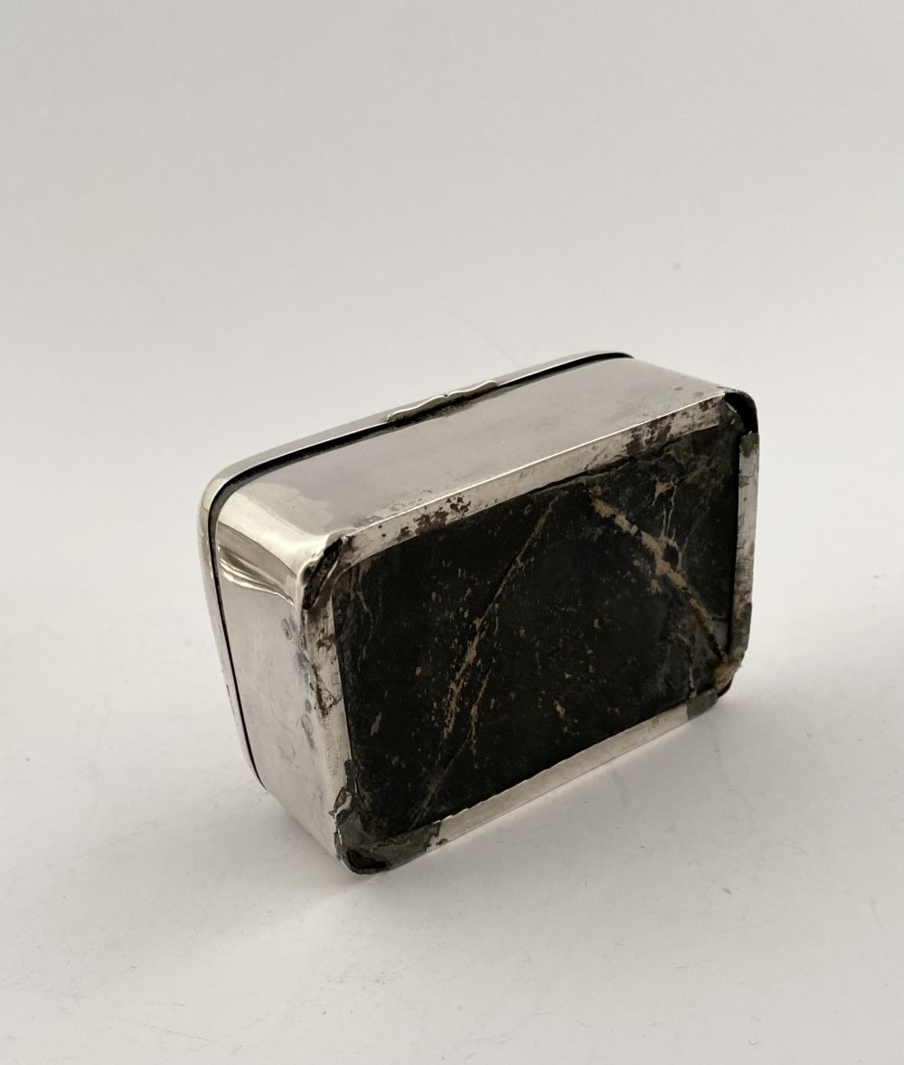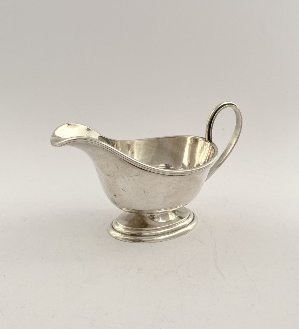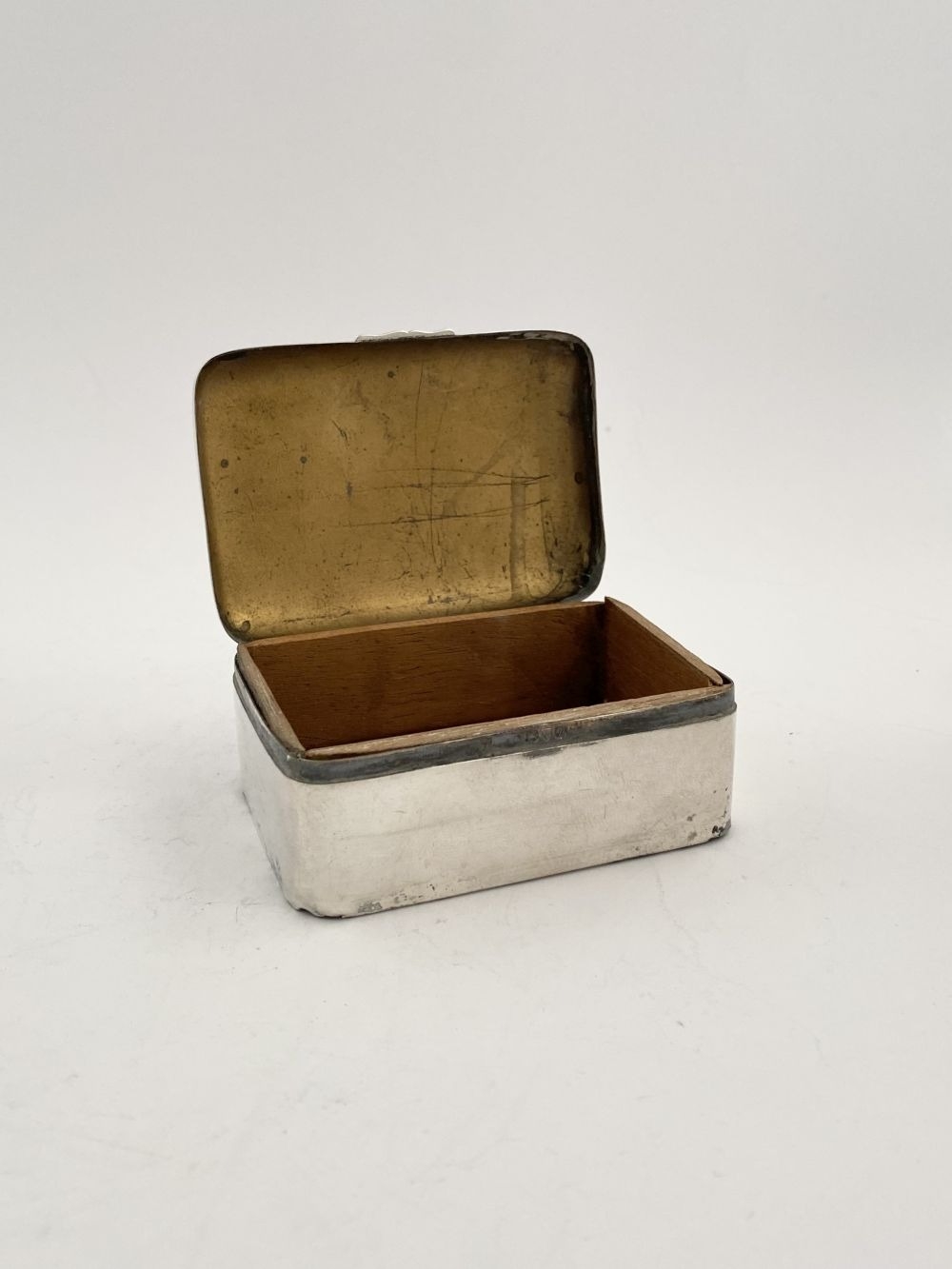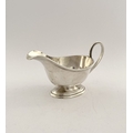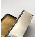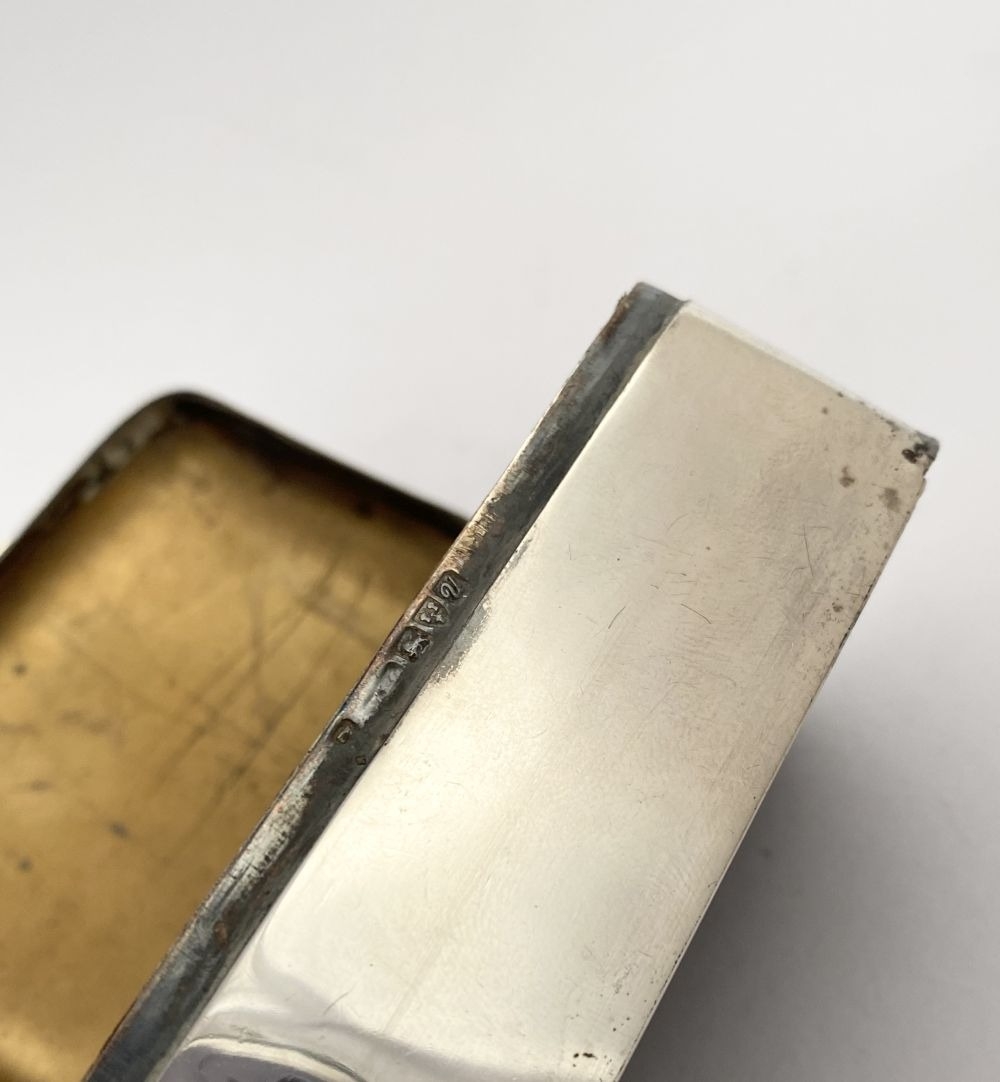 AN ART DECO PERIOD SILVER SNUFF BOX ALONG WITH SILVERPLATED SAUCE BOAT, snuff box hallmarked Chester c.1920, makers mark rubbed, some wear to base as photographed. The sauce boat by William Hutton & Sons Sheffield, dimensions: 16cm wide x 9.5cm high approx.