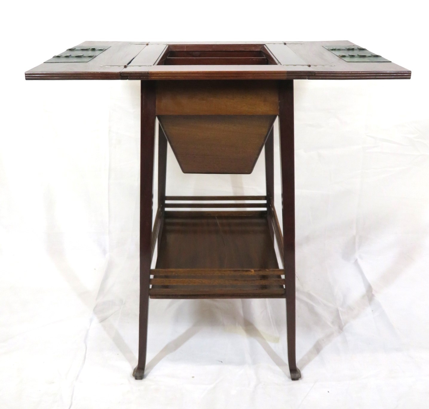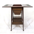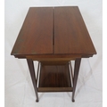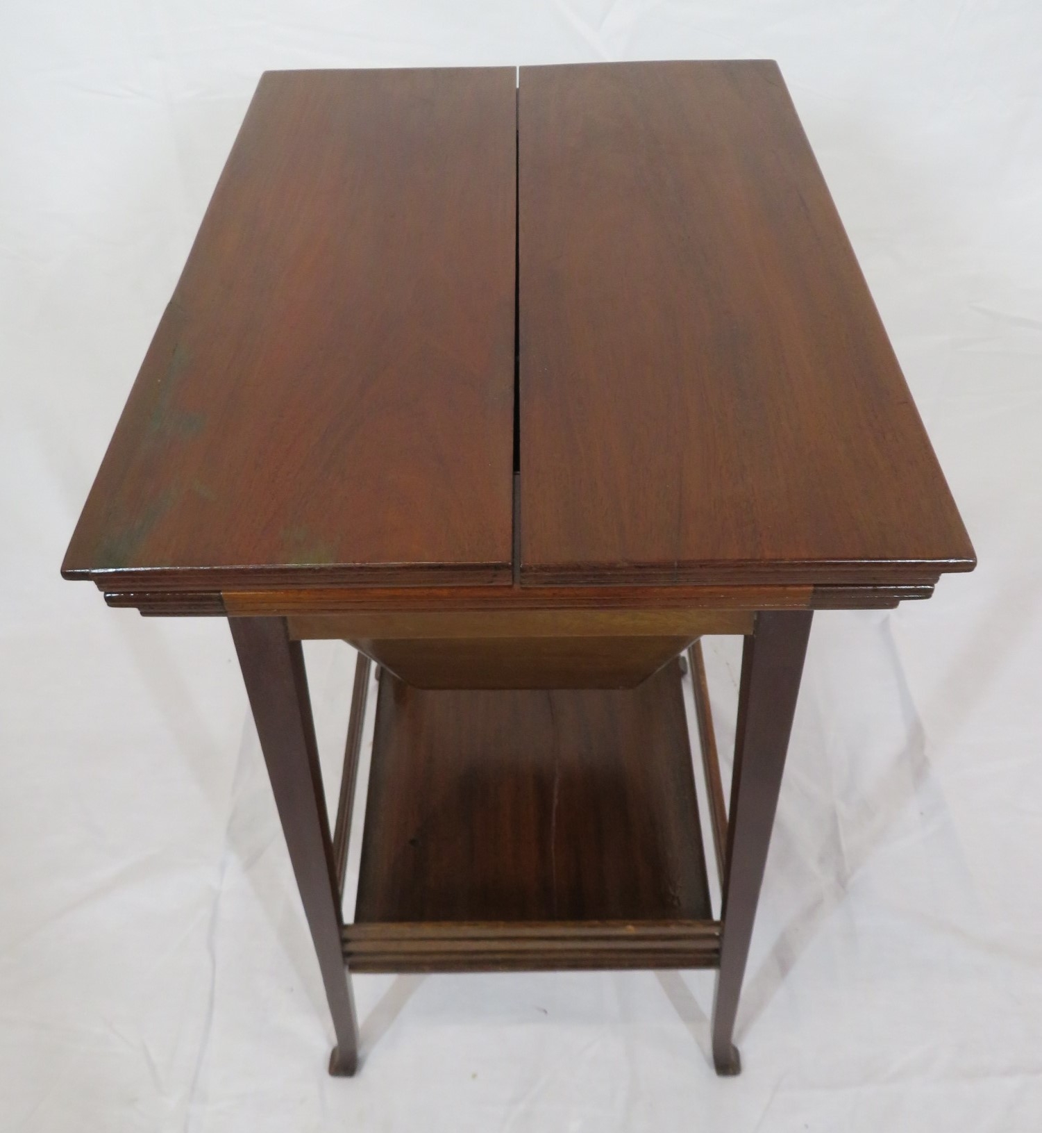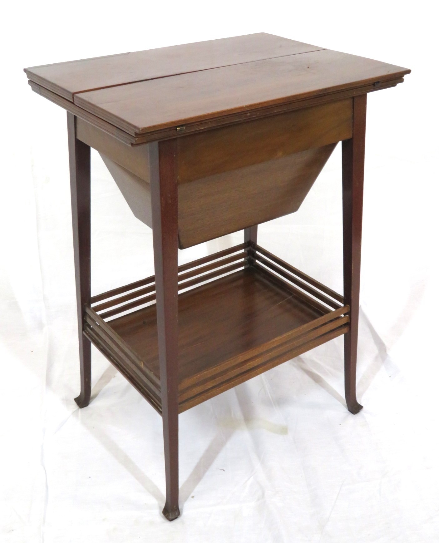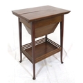 Edwardian mahogany work or sewing table with fold over top, slide, materiel drop, on tapering legs