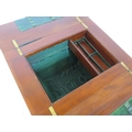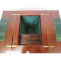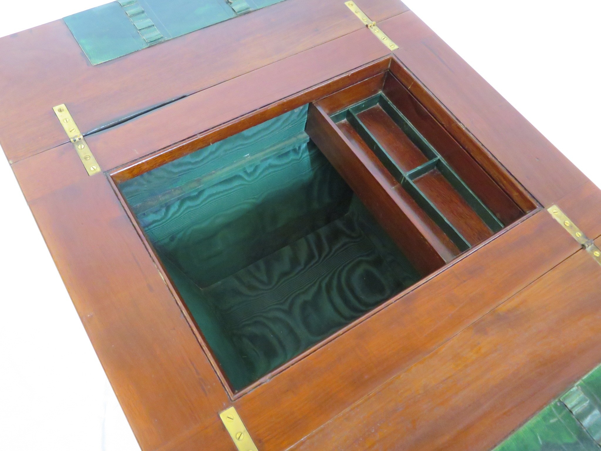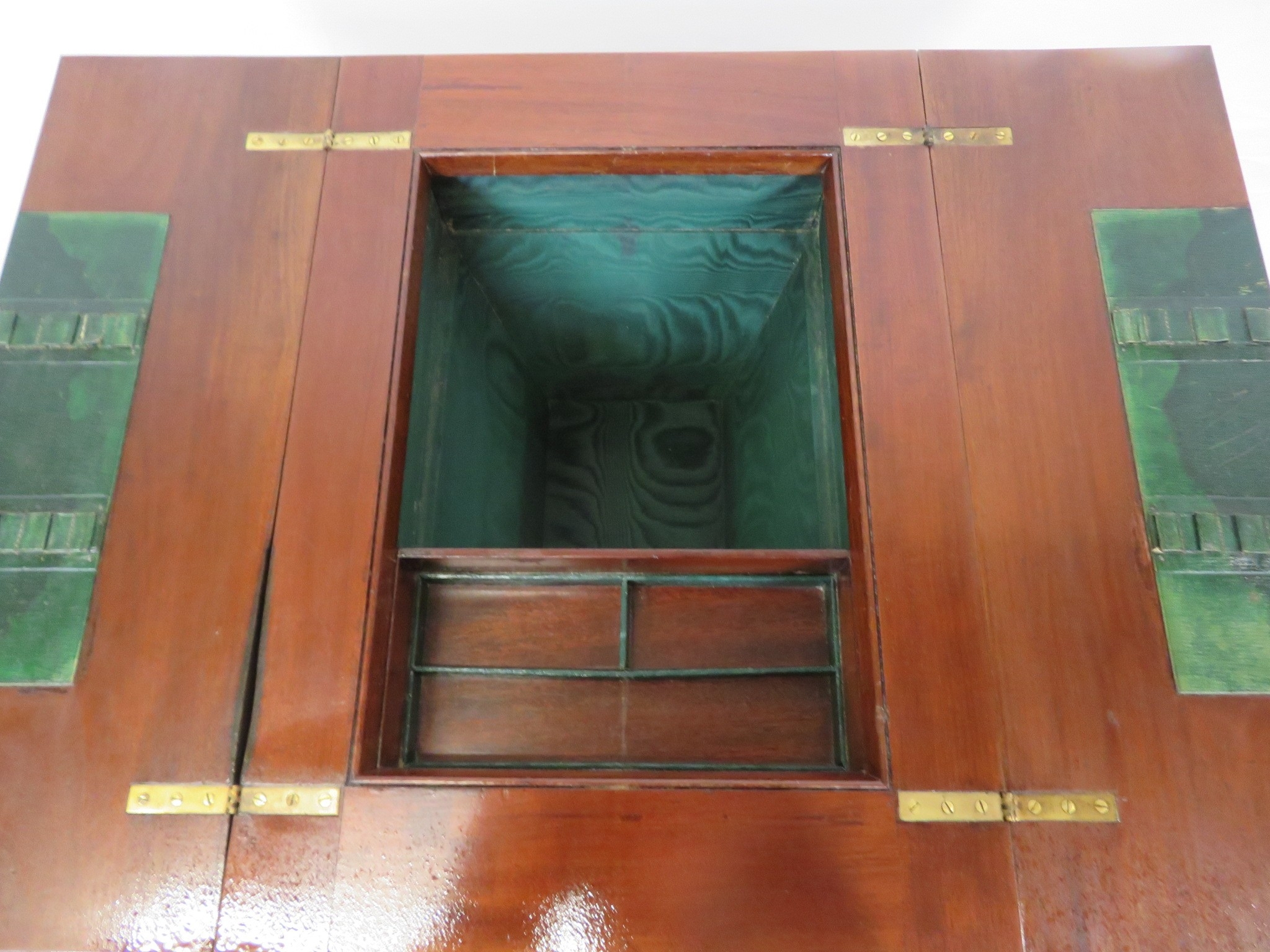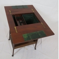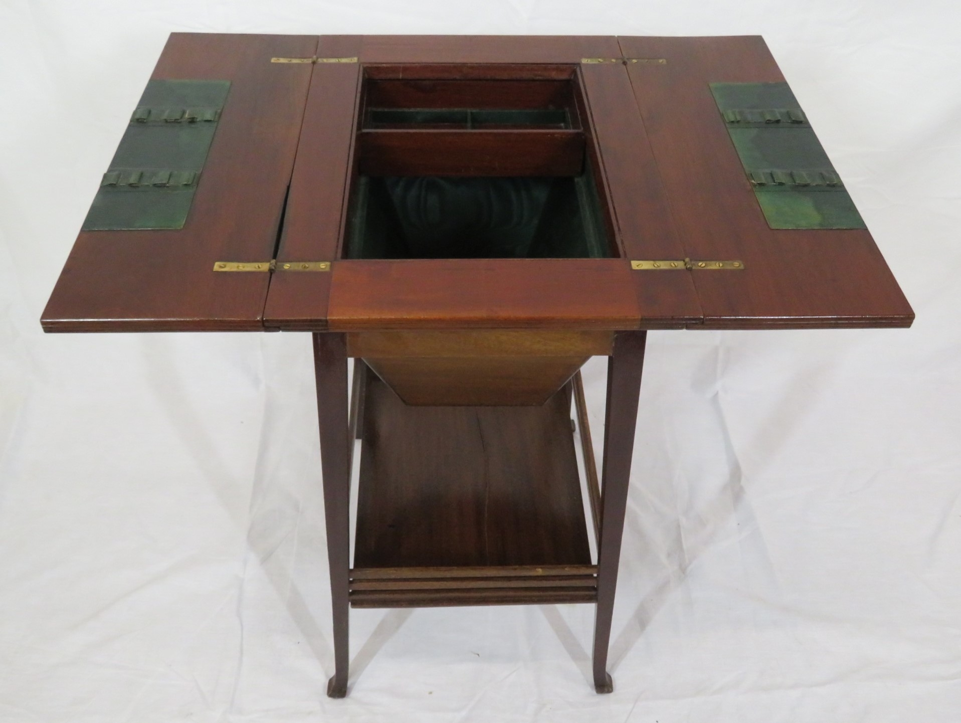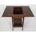 Edwardian mahogany work or sewing table with fold over top, slide, materiel drop, on tapering legs