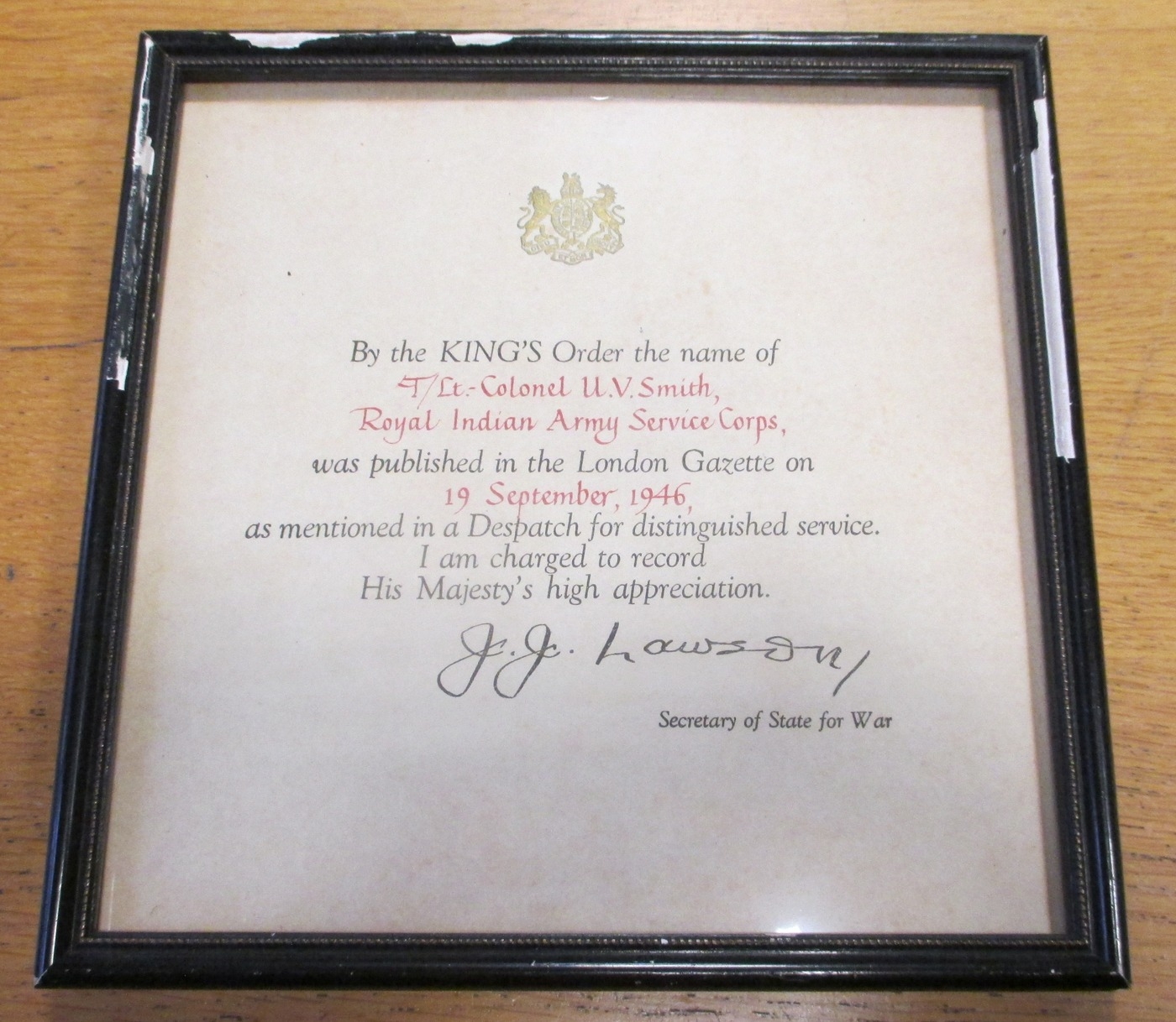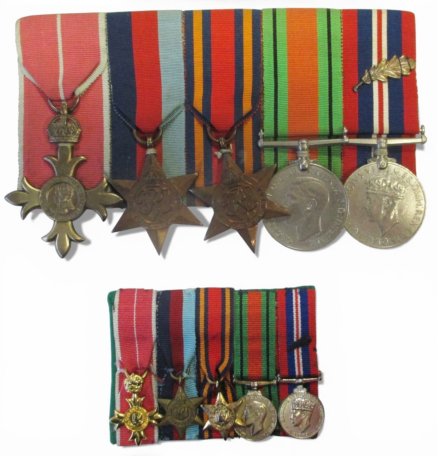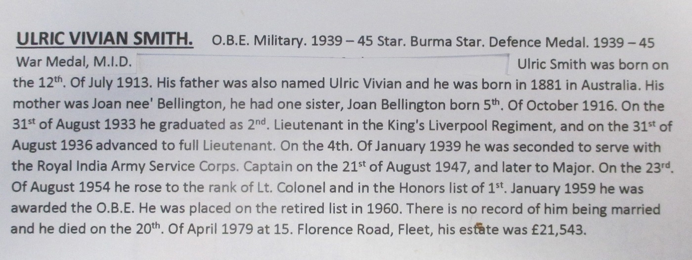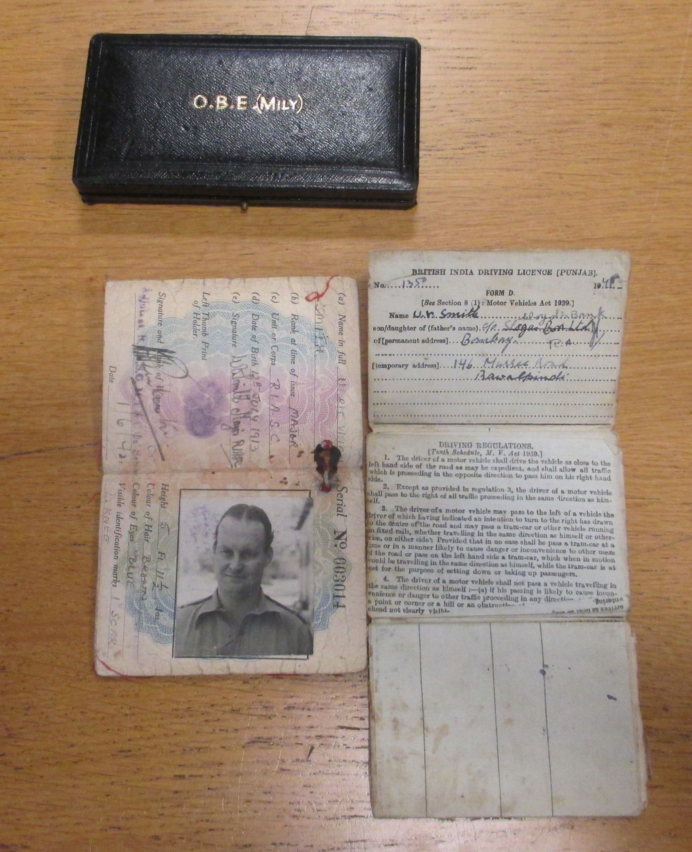 WW2 OBE (Military), 1939-45, Burma stars, Defence Medal and BWM with MID oakleaf attributed to Lieutenant Colonel Ulric Vivian Smith Royal Indian Army Service Corps, court mounted as worn, generally extremely fine. His OBE was announced in the London Gazette 1 January 1959. With original framed MID certificate dated 19 Sept 1946, OBE box, Identity Card Army in India, British India Driving Licence (Punjab), full set of miniatures, copied LGs and research. (R)