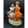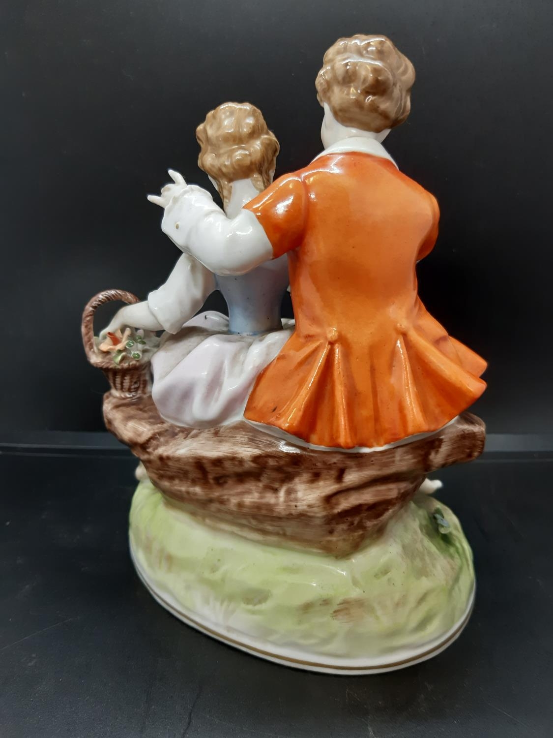 A possibly German continental porcelain figurine of seated boy and girl with initial below five pointed crown back stamp
