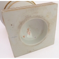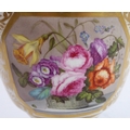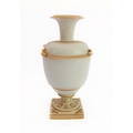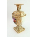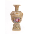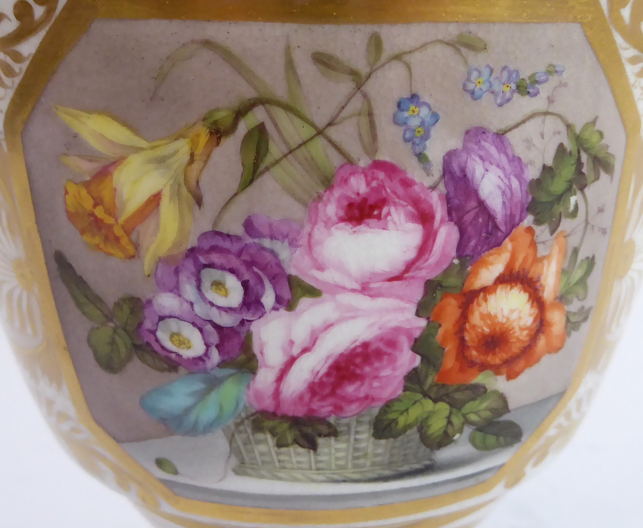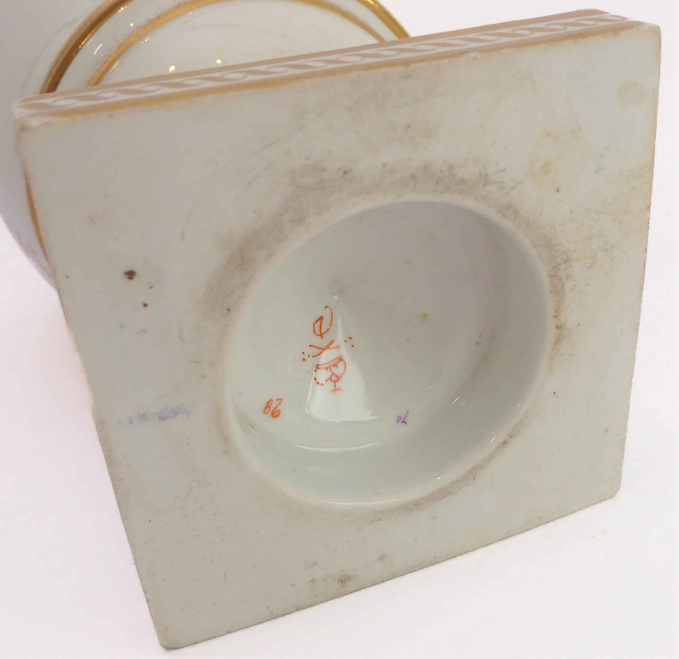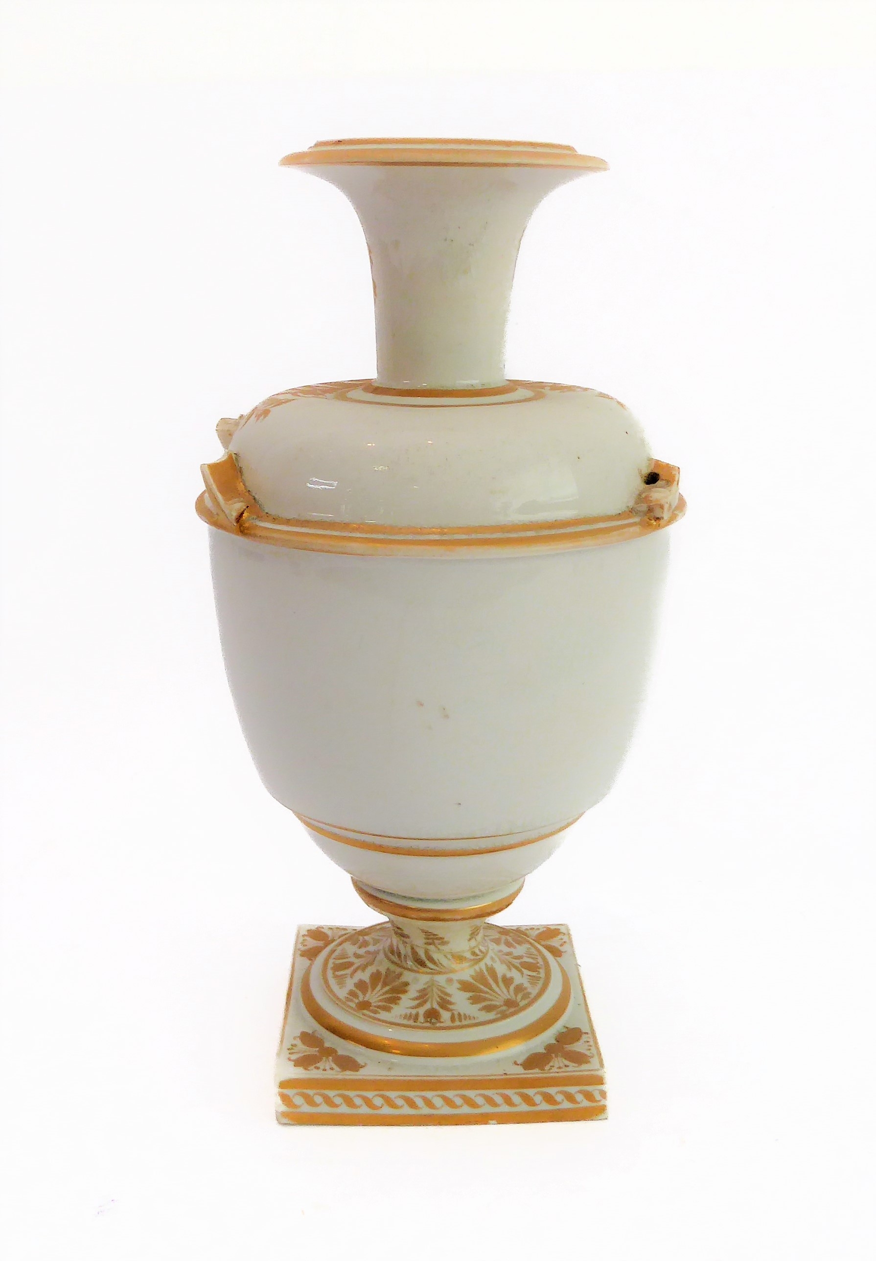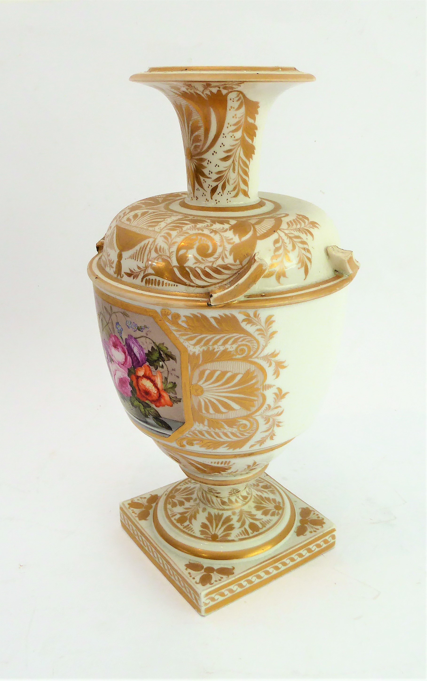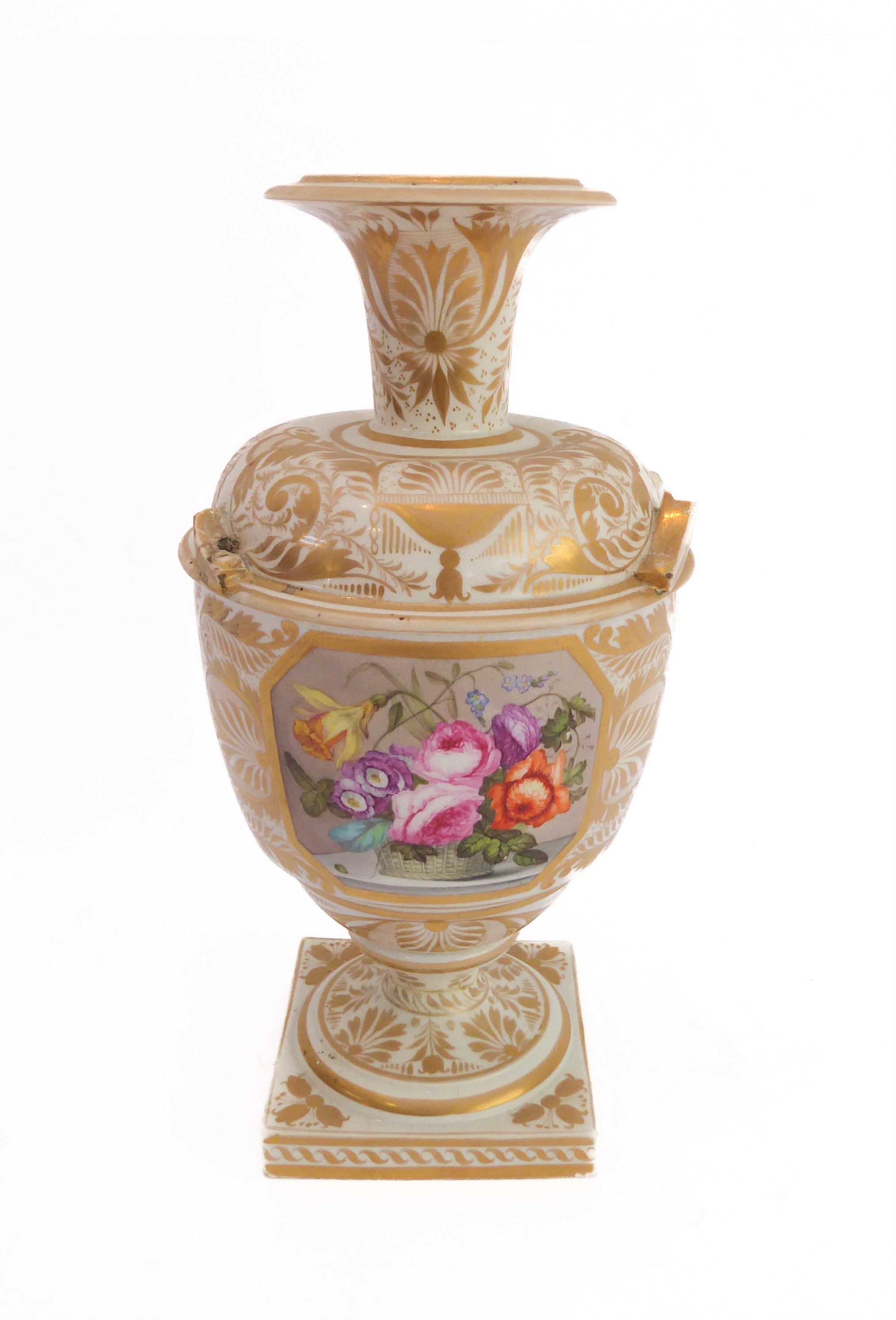 An early 19th century Derby porcelain vase (minus two handles); waisted neck and urn-shaped body hand-decorated in enamels with a floral spray in a basket; prevalent gilding including anthemions; painted Derby marks to underside. (22 cm high) (Broken and reaffixed to a circular and square base).