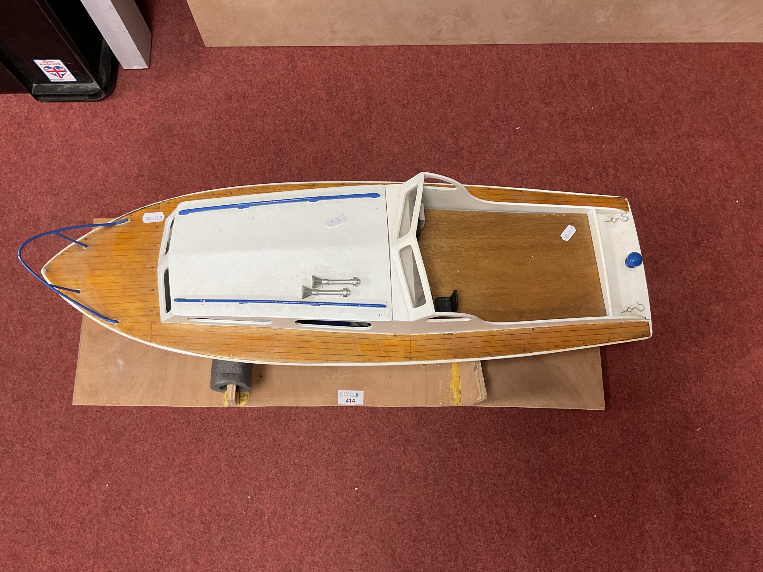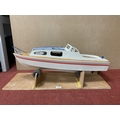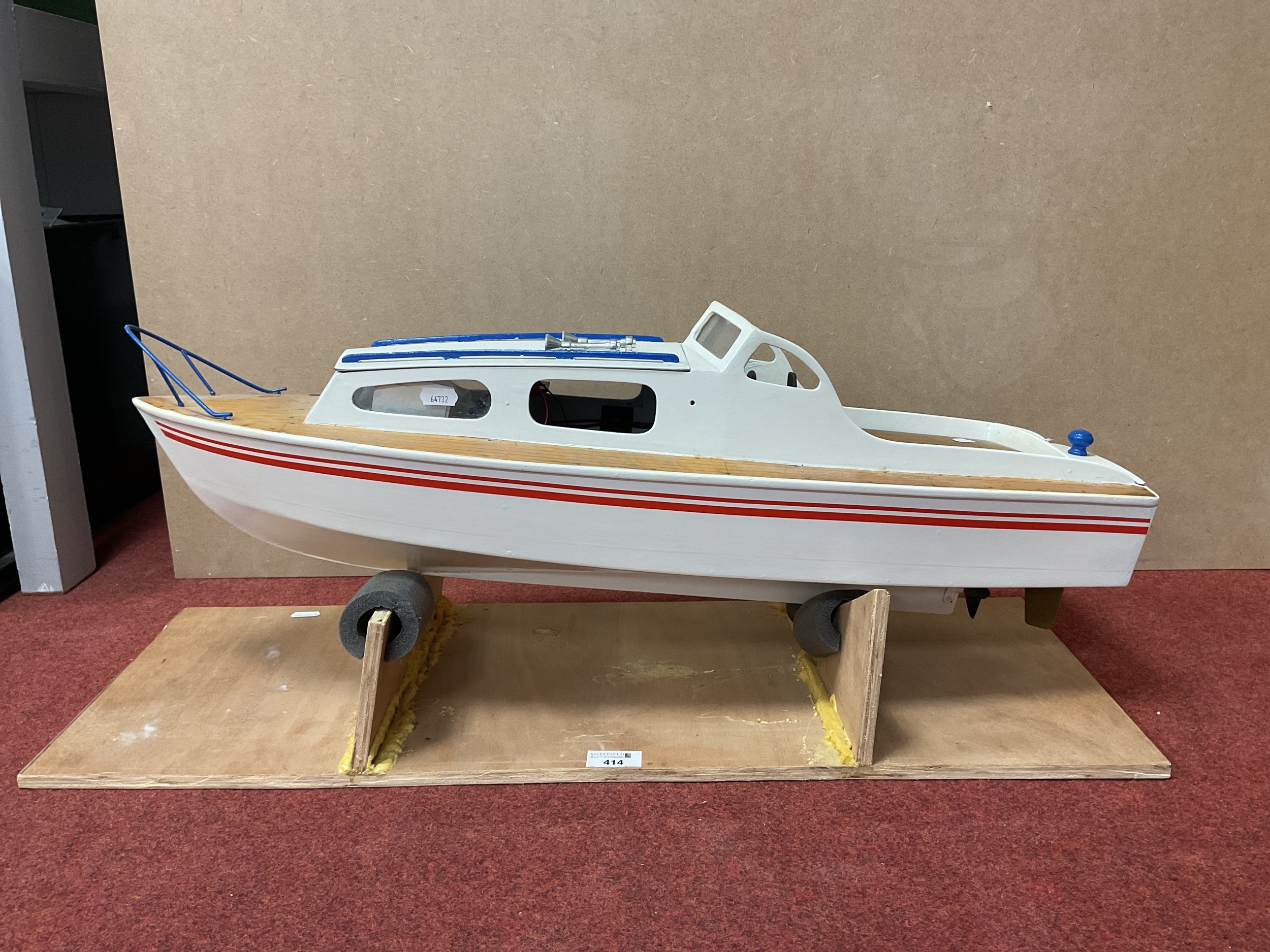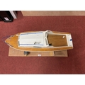 A Kit Built Wooden Construction Battery Operated Radio Control Model in the form of a Cruiser Boat. Features include Hitec Battery Eliminator Circuit, Motor, Sea Hunter 25A, some bagged brass accessories present. Playworn, small parts may be missing and/or damage. Approx Length 76cm. With stand.