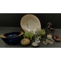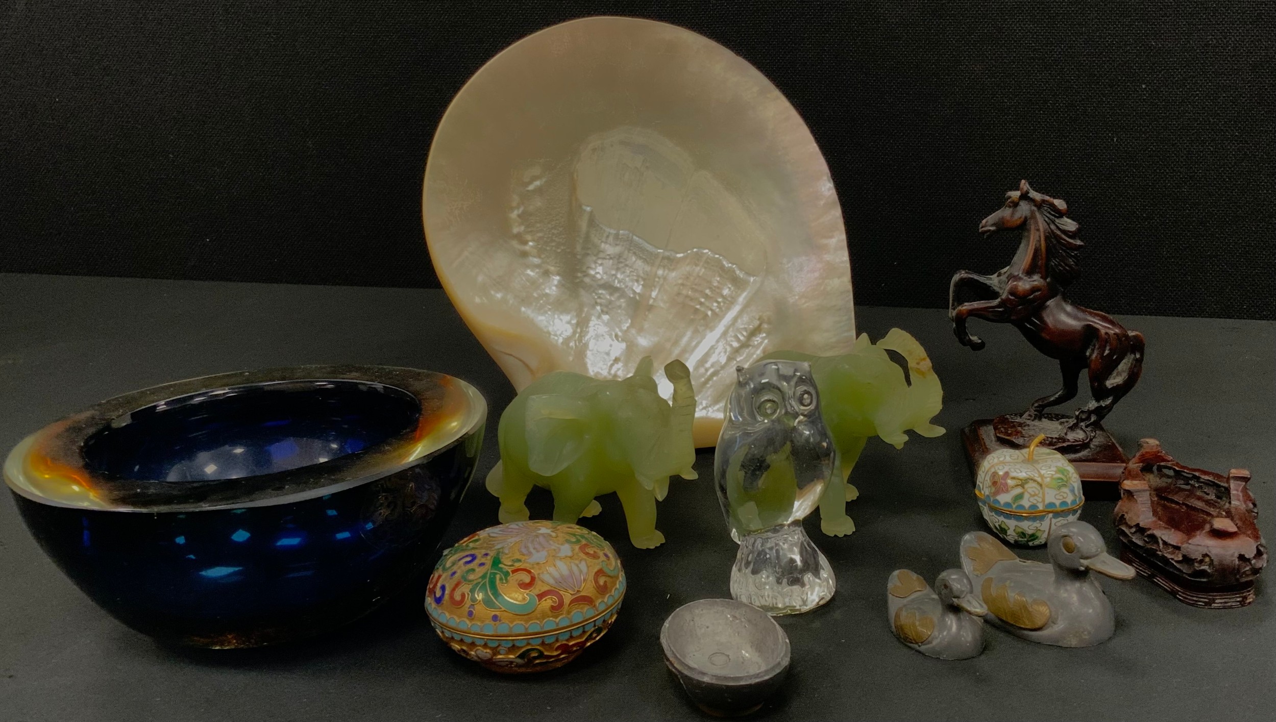 Boxes and objects - a mother of pearl scalloped dish, champlevé lidded pots, a pair of carved soapstone model elephants; etc