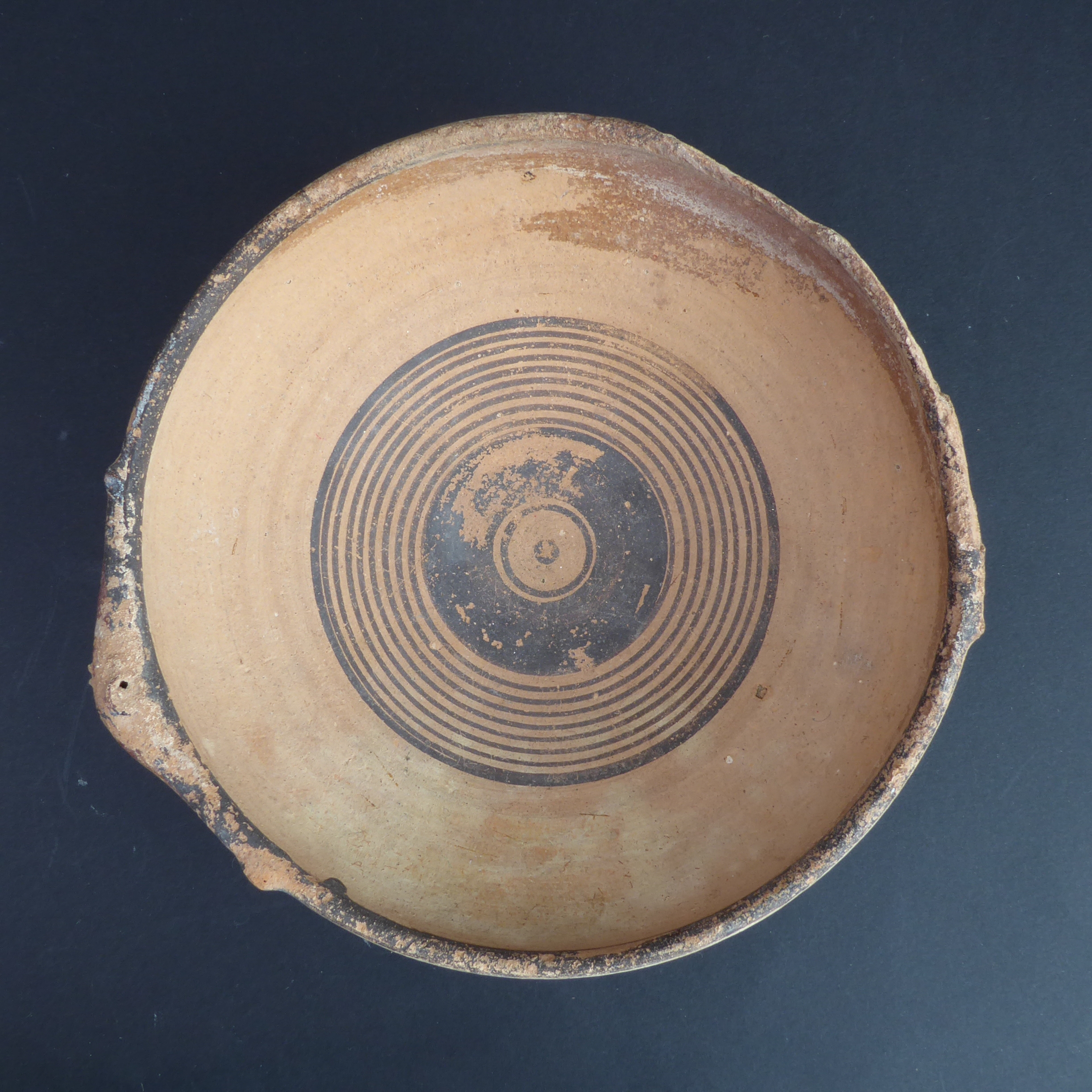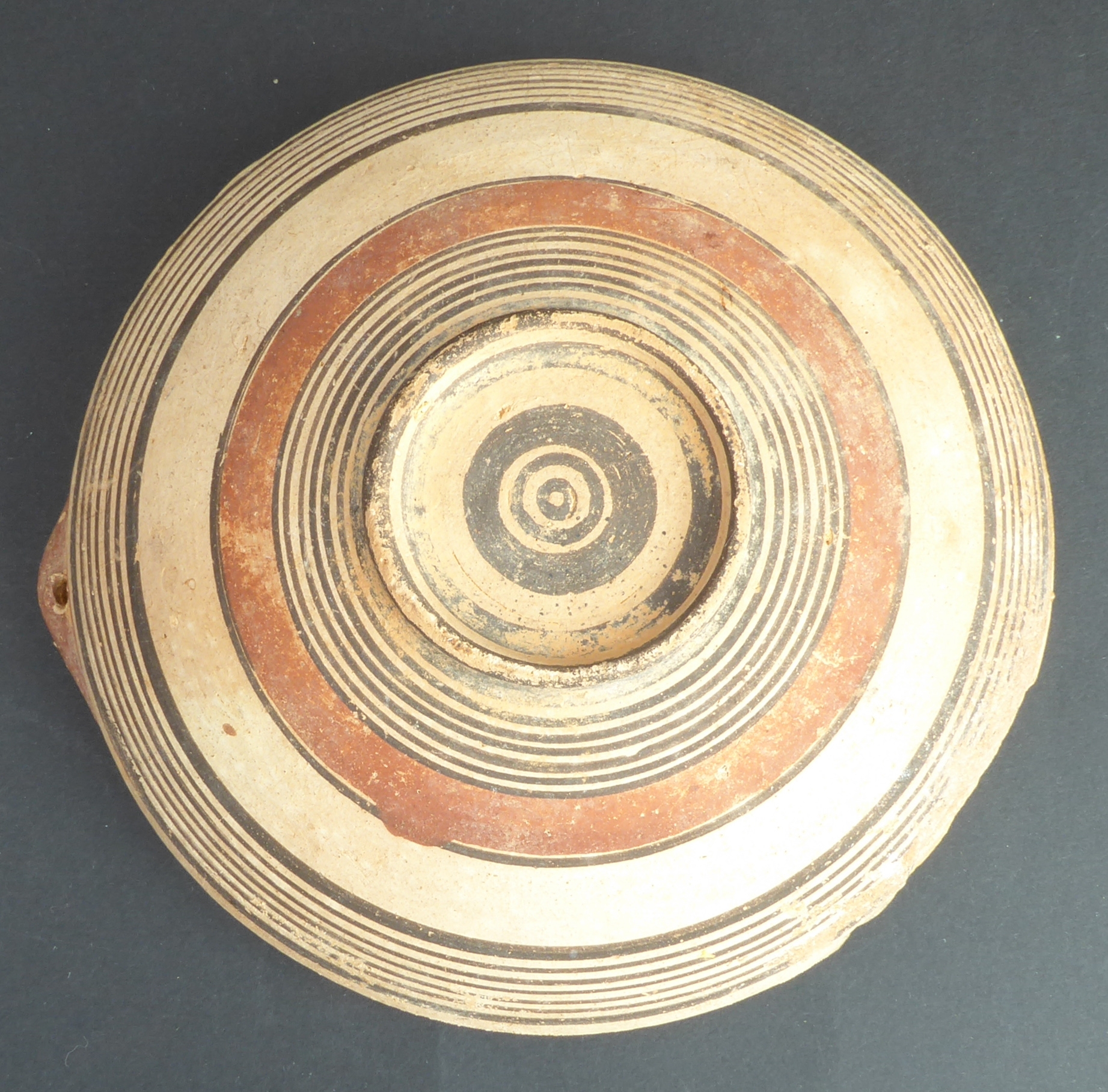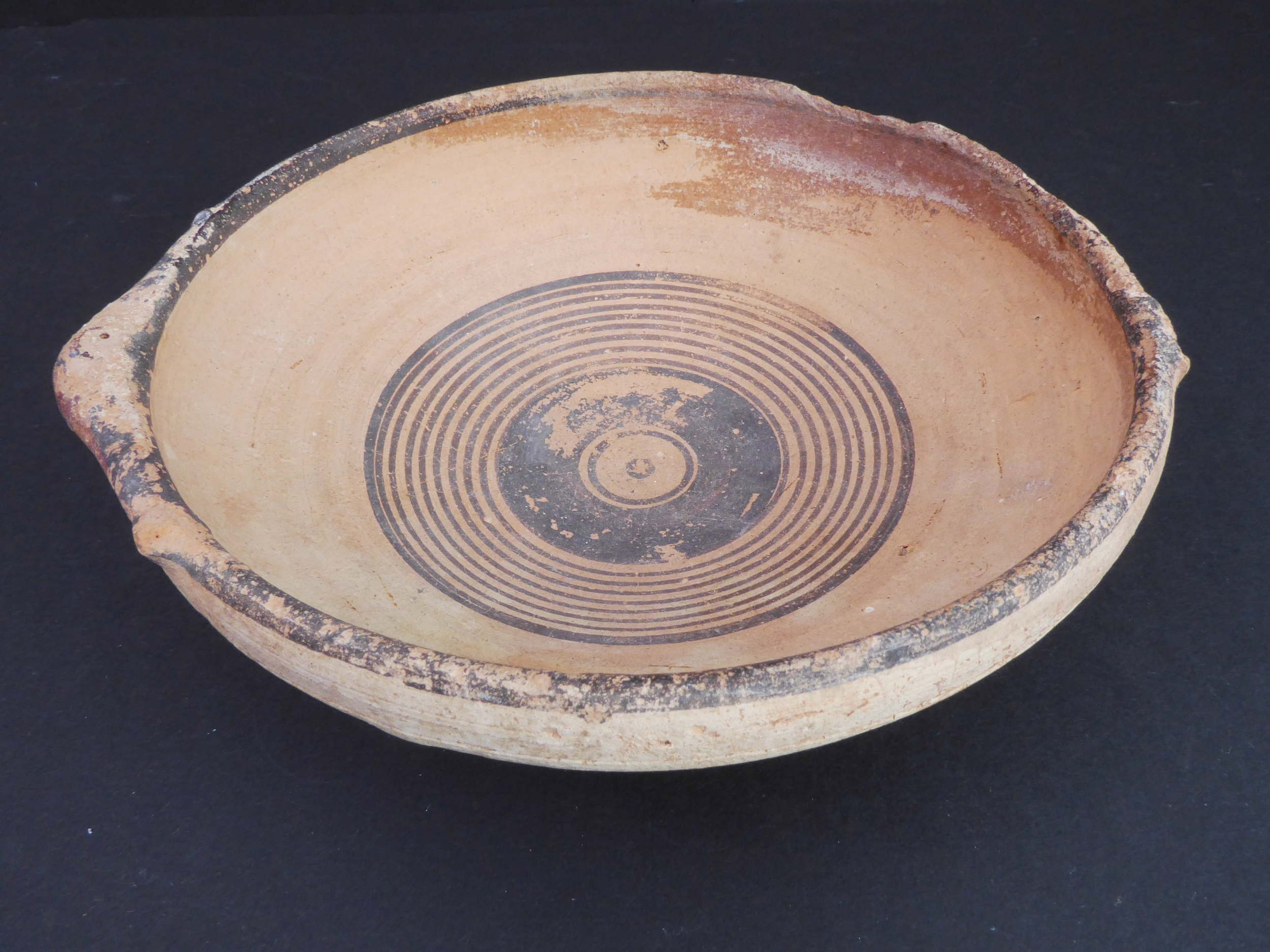 A circa 1500 BC terracotta bowl, possibly Greek-Cypriot: central interior decorated with concentric black painted circles, the bowl with one pierced handle and the underside of the bowl with further black and burnt amber concentric circle decoration, on short circular foot (18.25 cm widest). Provenance: acquired in the 1960s by the consignor's parents.