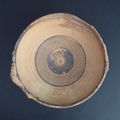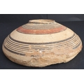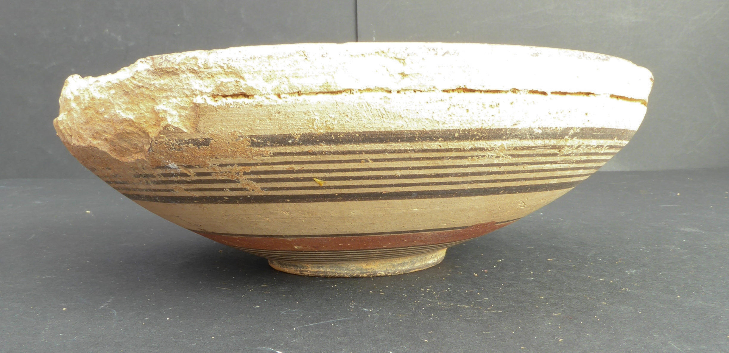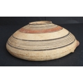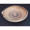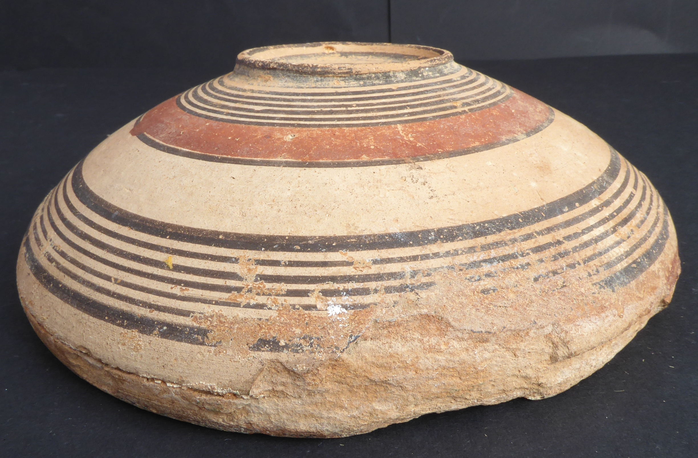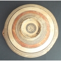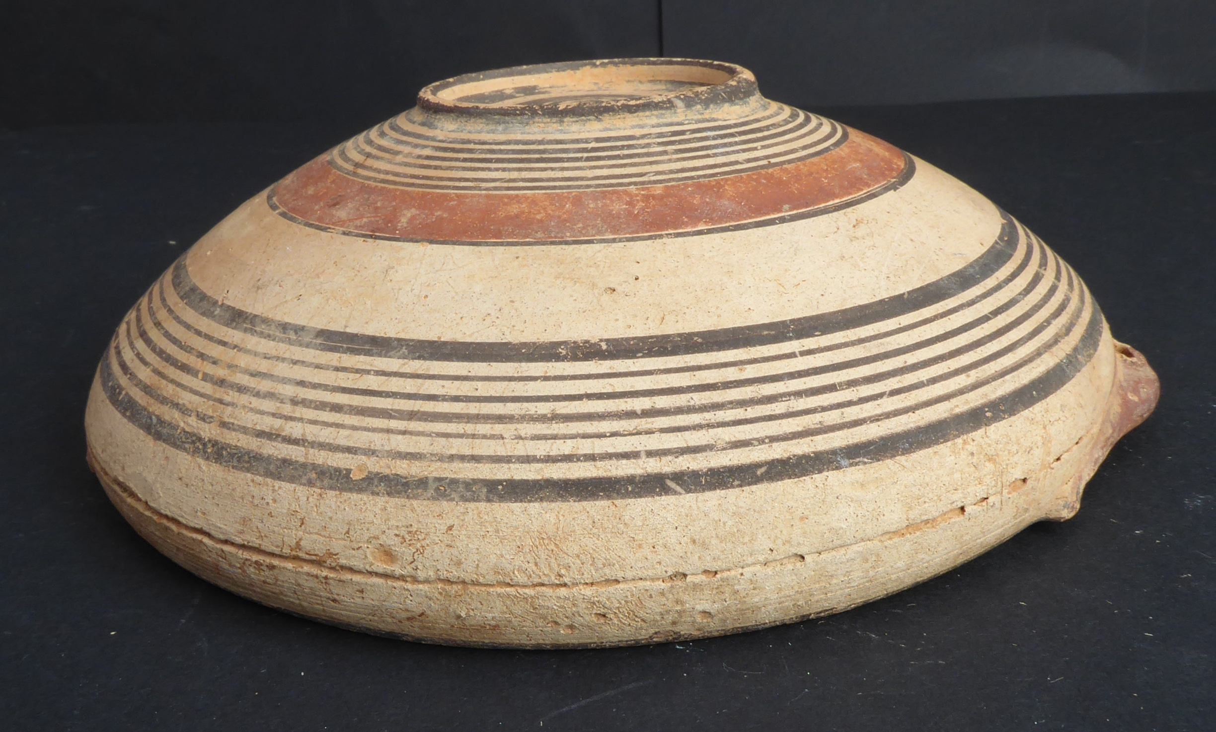 A circa 1500 BC terracotta bowl, possibly Greek-Cypriot: central interior decorated with concentric black painted circles, the bowl with one pierced handle and the underside of the bowl with further black and burnt amber concentric circle decoration, on short circular foot (18.25 cm widest). Provenance: acquired in the 1960s by the consignor's parents.