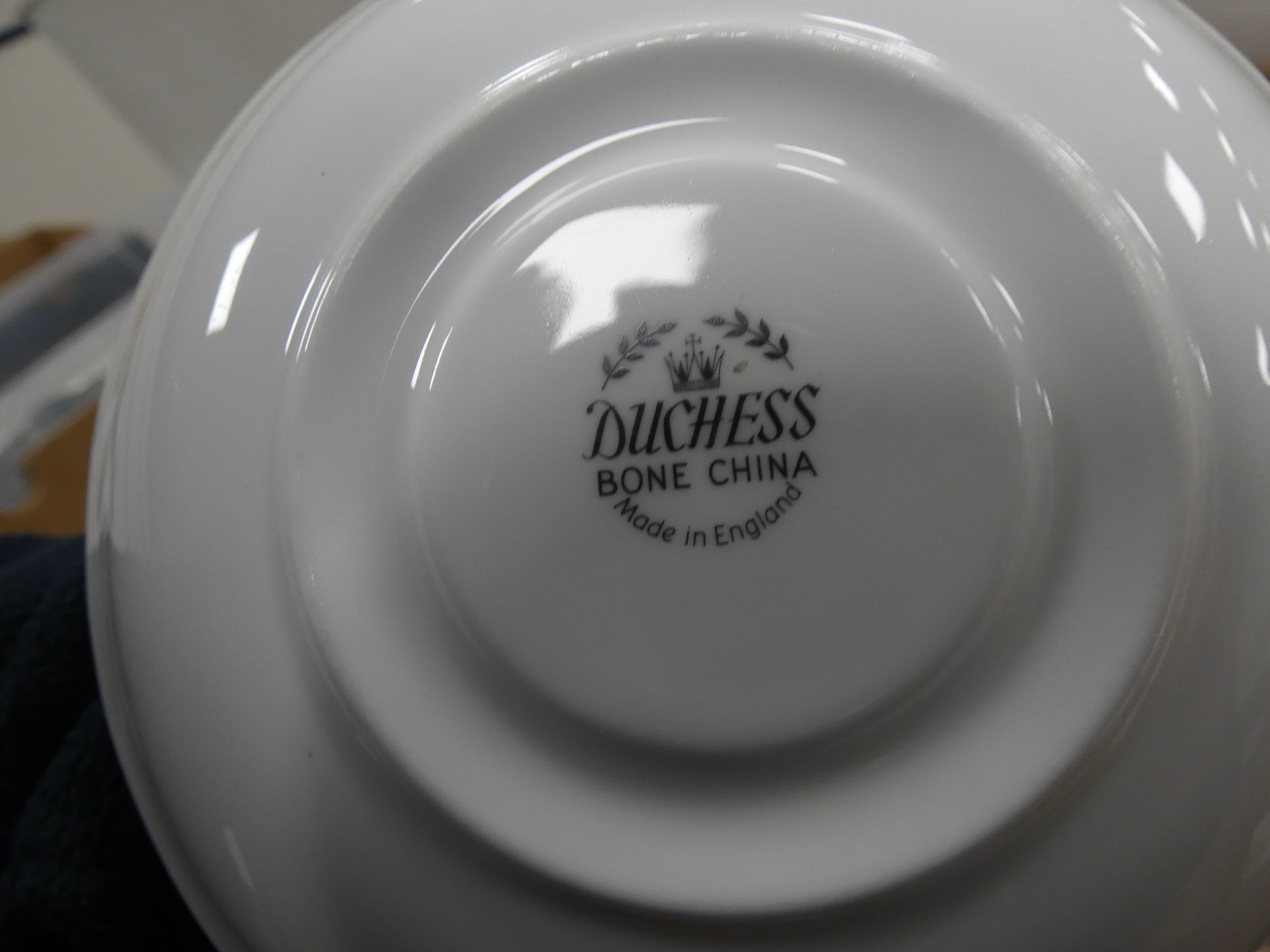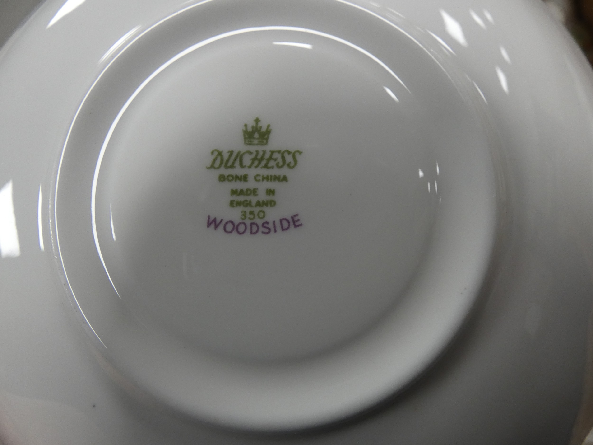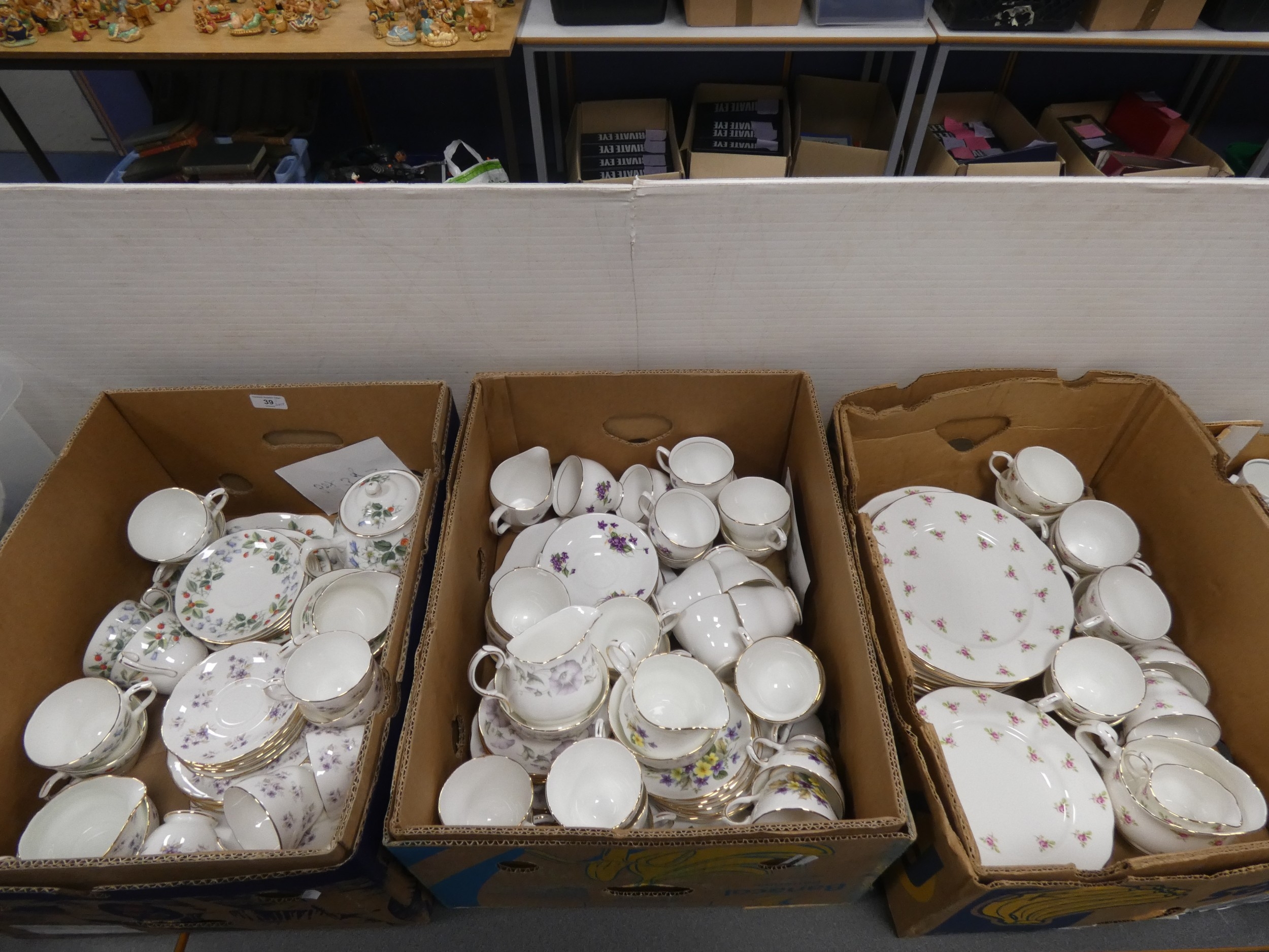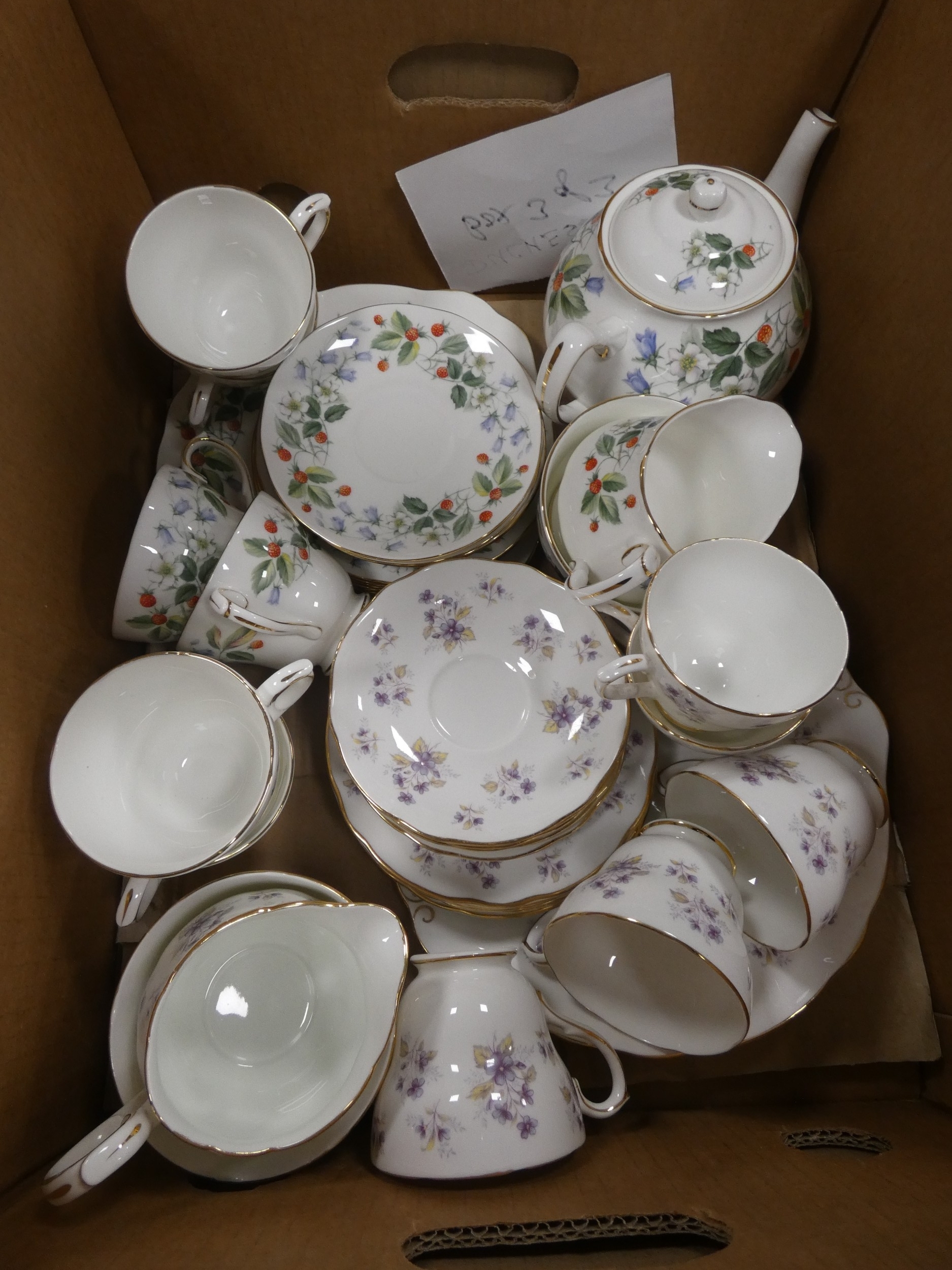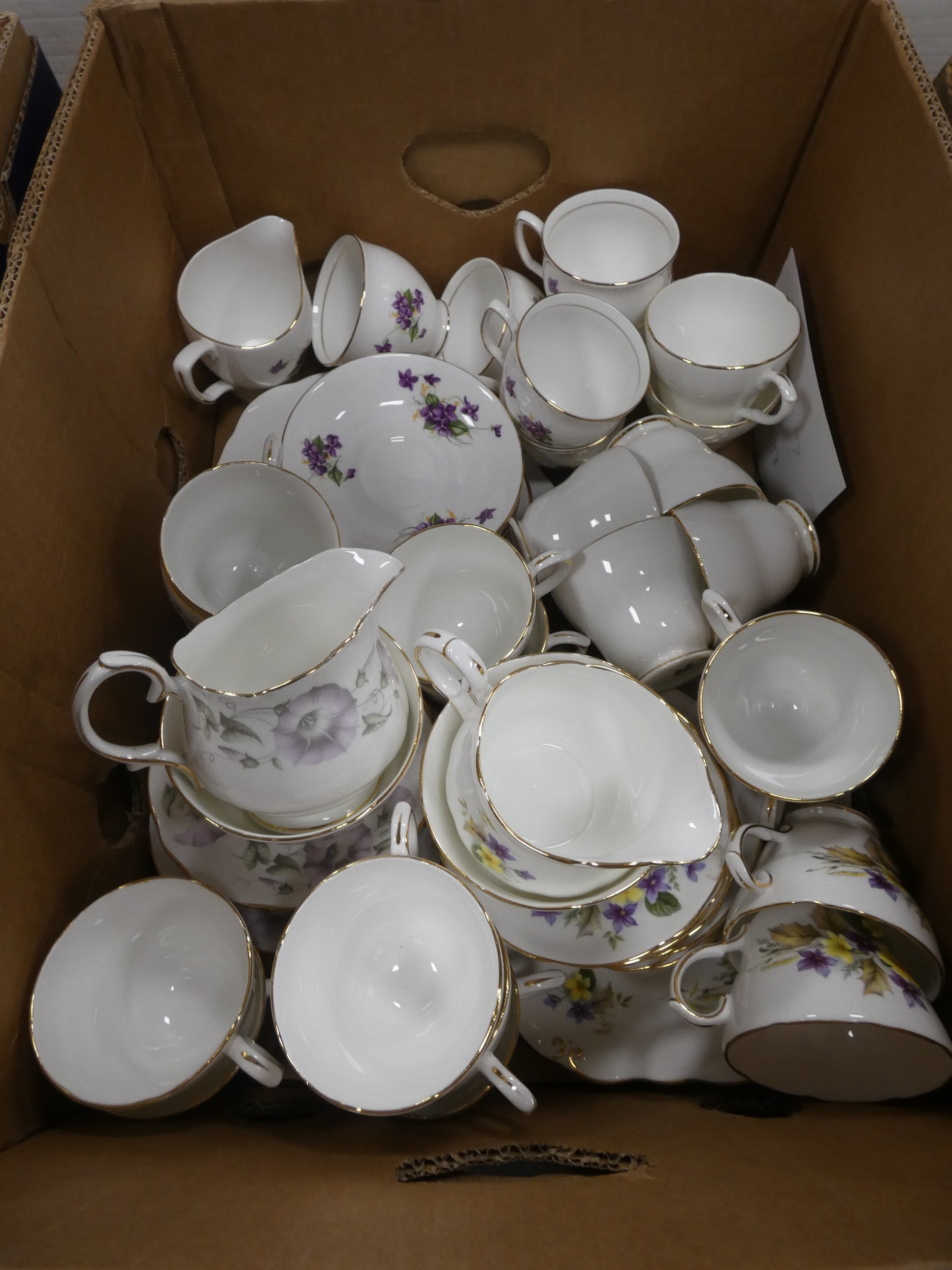 Three cartons containing Duchess part tea sets to include 'Woodside' pattern and others.